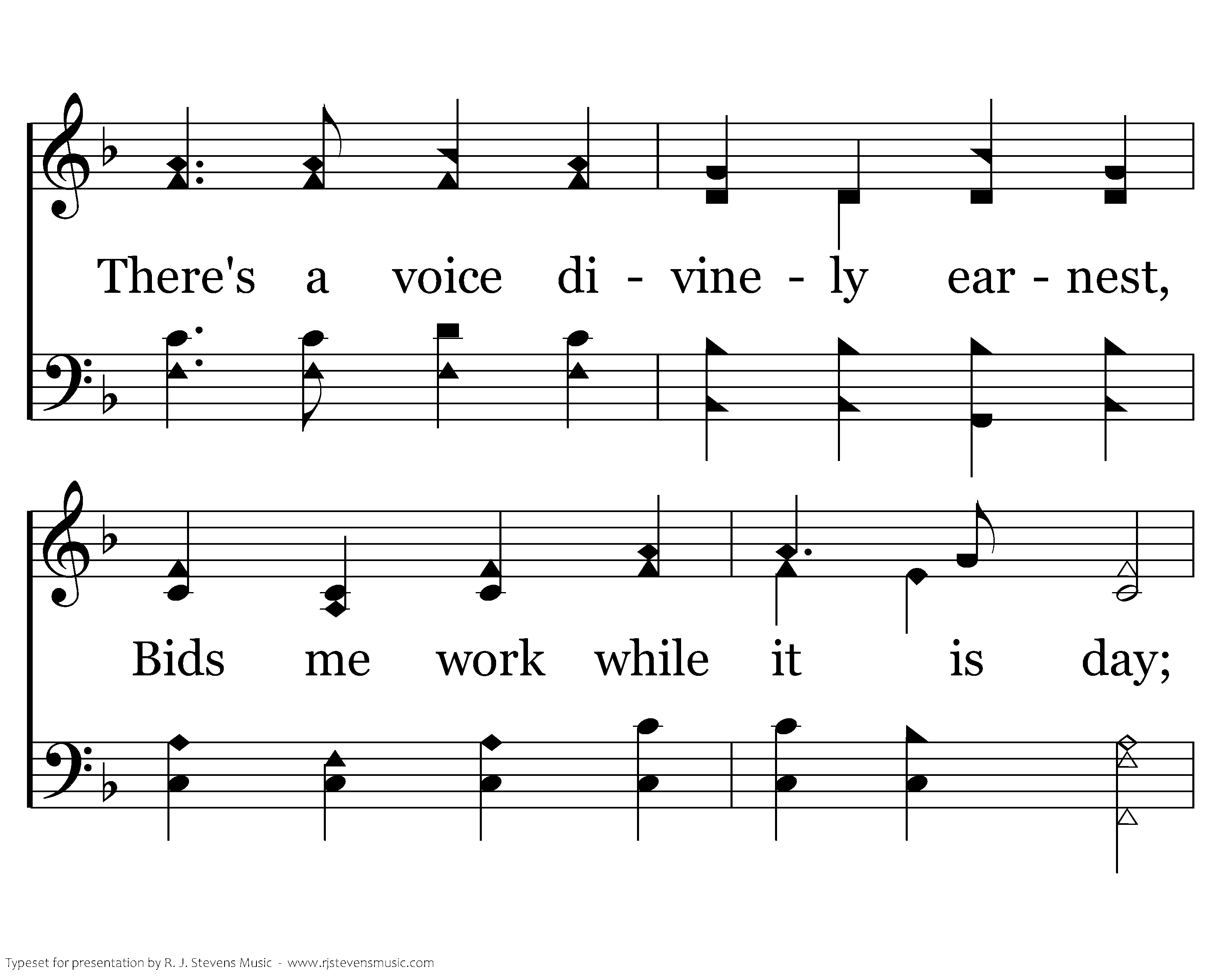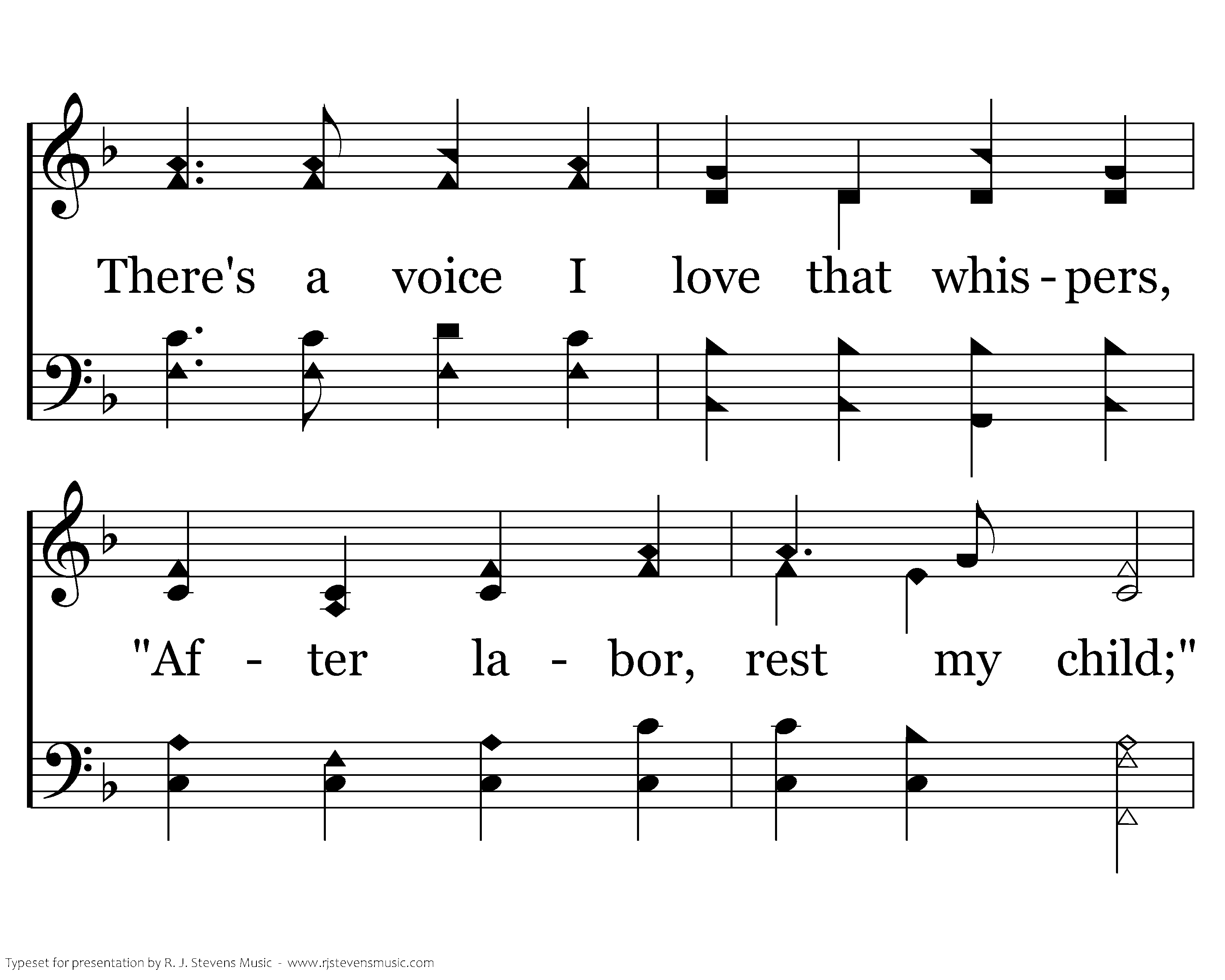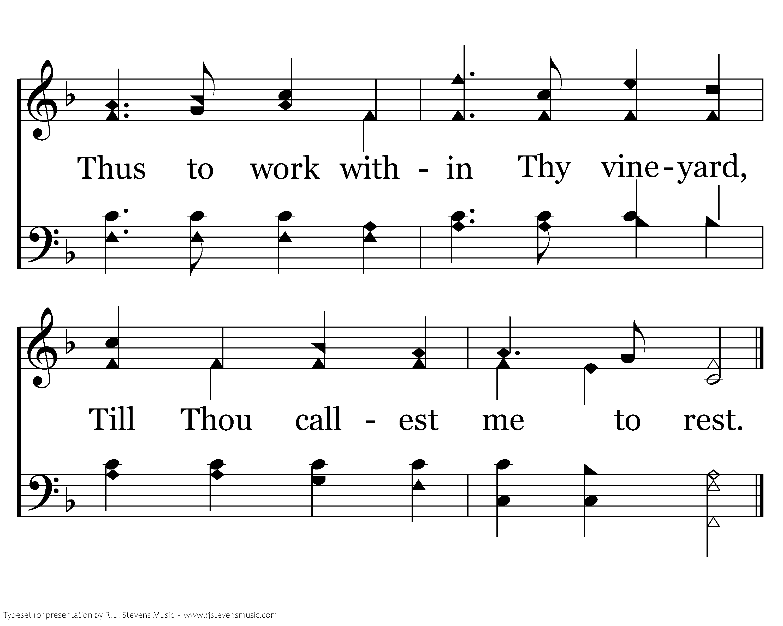 As the dewy shades steal downward O'er the earth at ev'ning mild, There's a voice I love that whispers, "After labor, rest my child;" O my Savior, loving, tender, Help me to account it blest Thus to work within Thy vineyard, Till Thou callest me to rest.