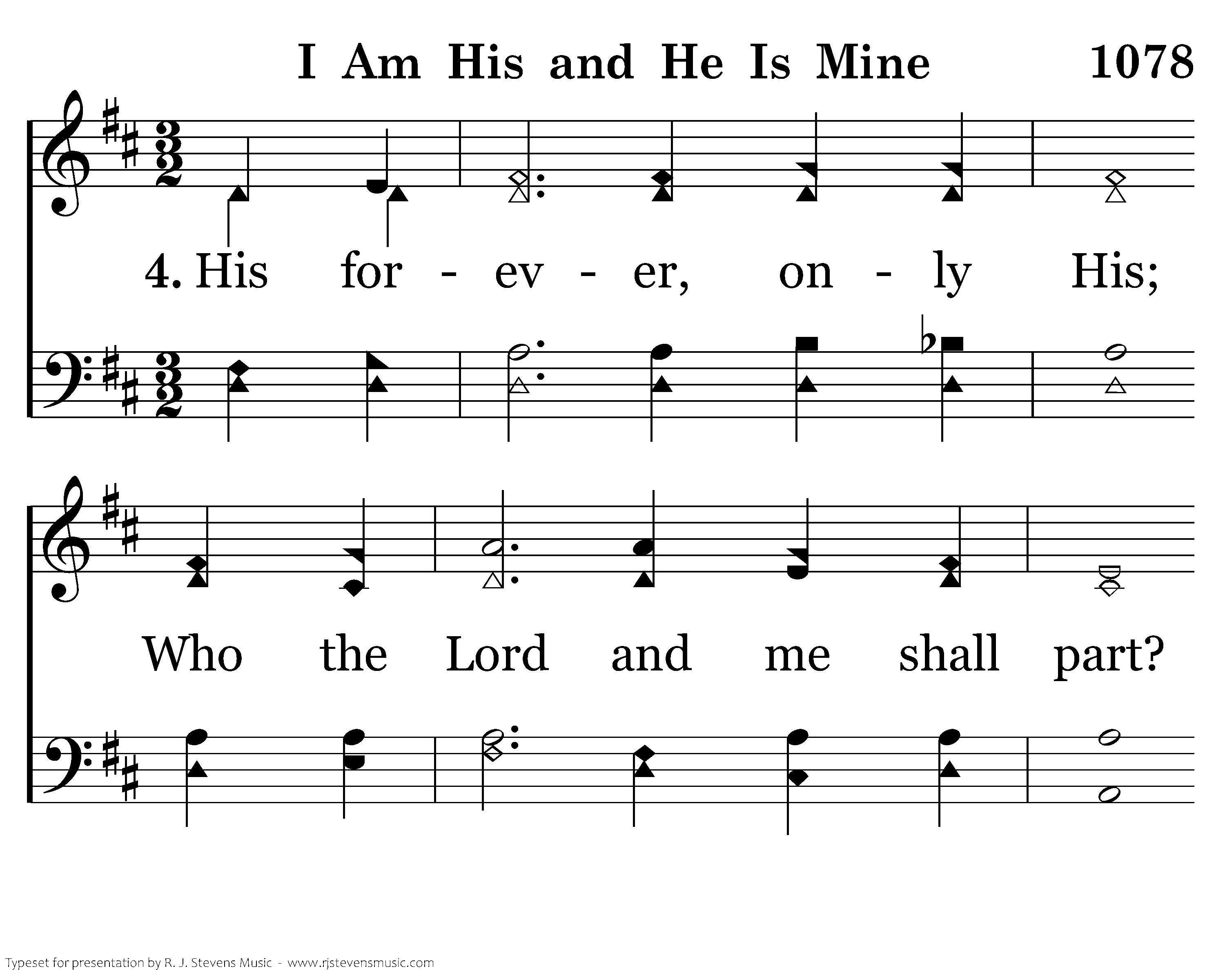 His forever, only His; Who the Lord and me shall part? Ah, with what a rest of bliss Christ can fill the loving heart! Heav'n and earth may fade and flee, Firstborn light in gloom decline; But while God and I shall be, I am His and He is mine; mine.