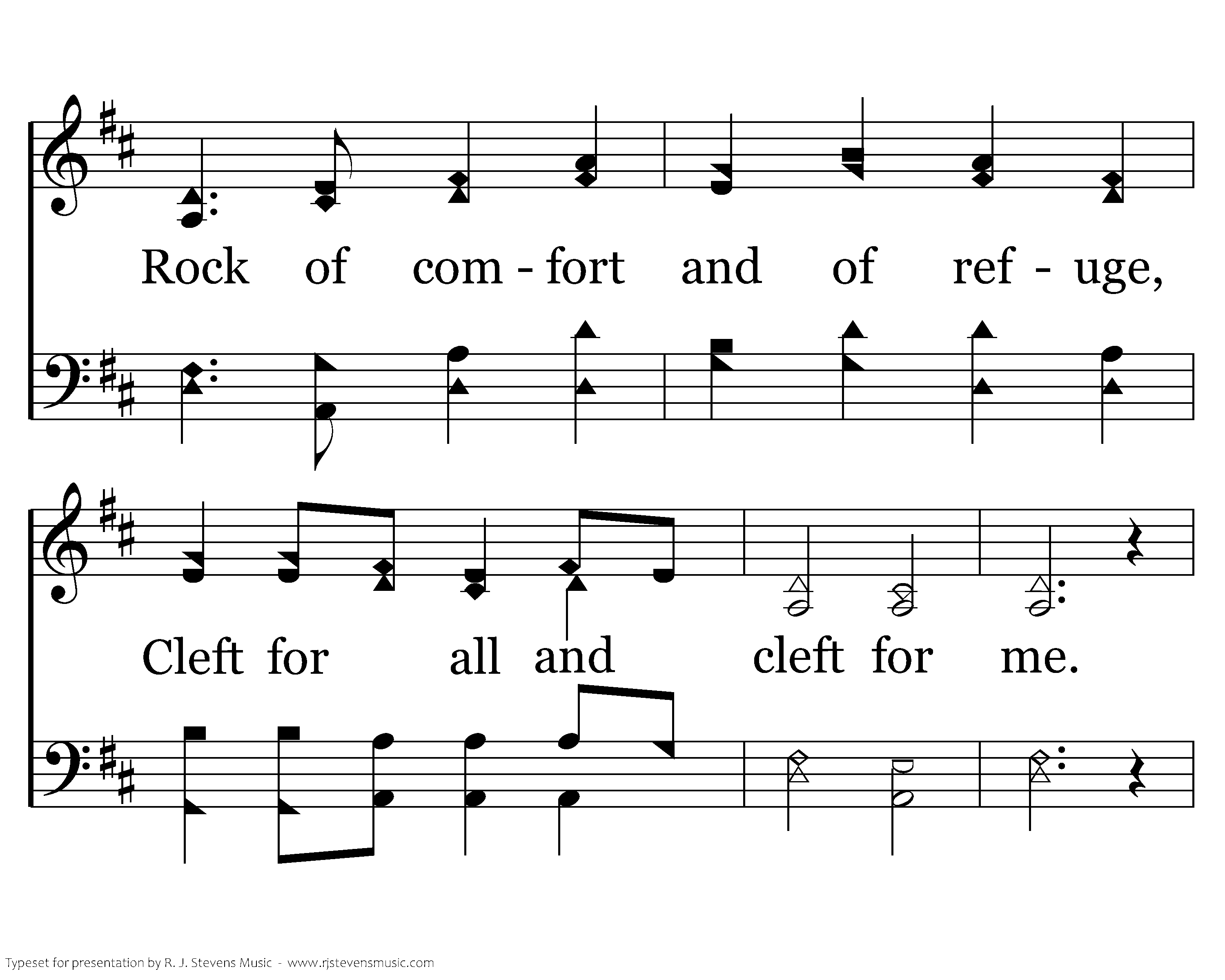 Rock of ev'ry generation, Standing cleft, O yes, I see. Rock of comfort and of refuge, Cleft for all and cleft for me. Yes, Your love is with me daily, Reaching out along my way. Caring, yes, for me assuredly, Hearing me whene'er I pray.