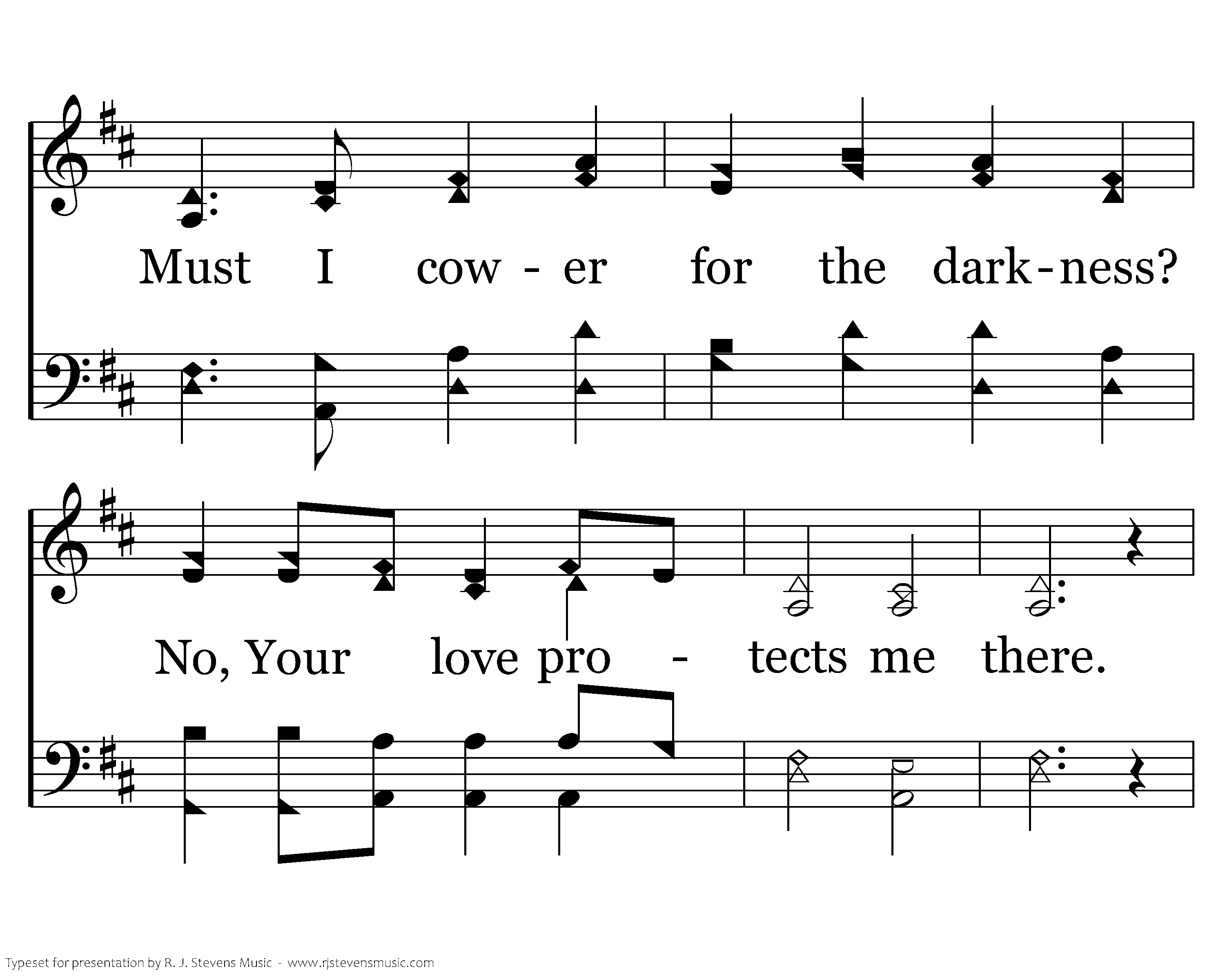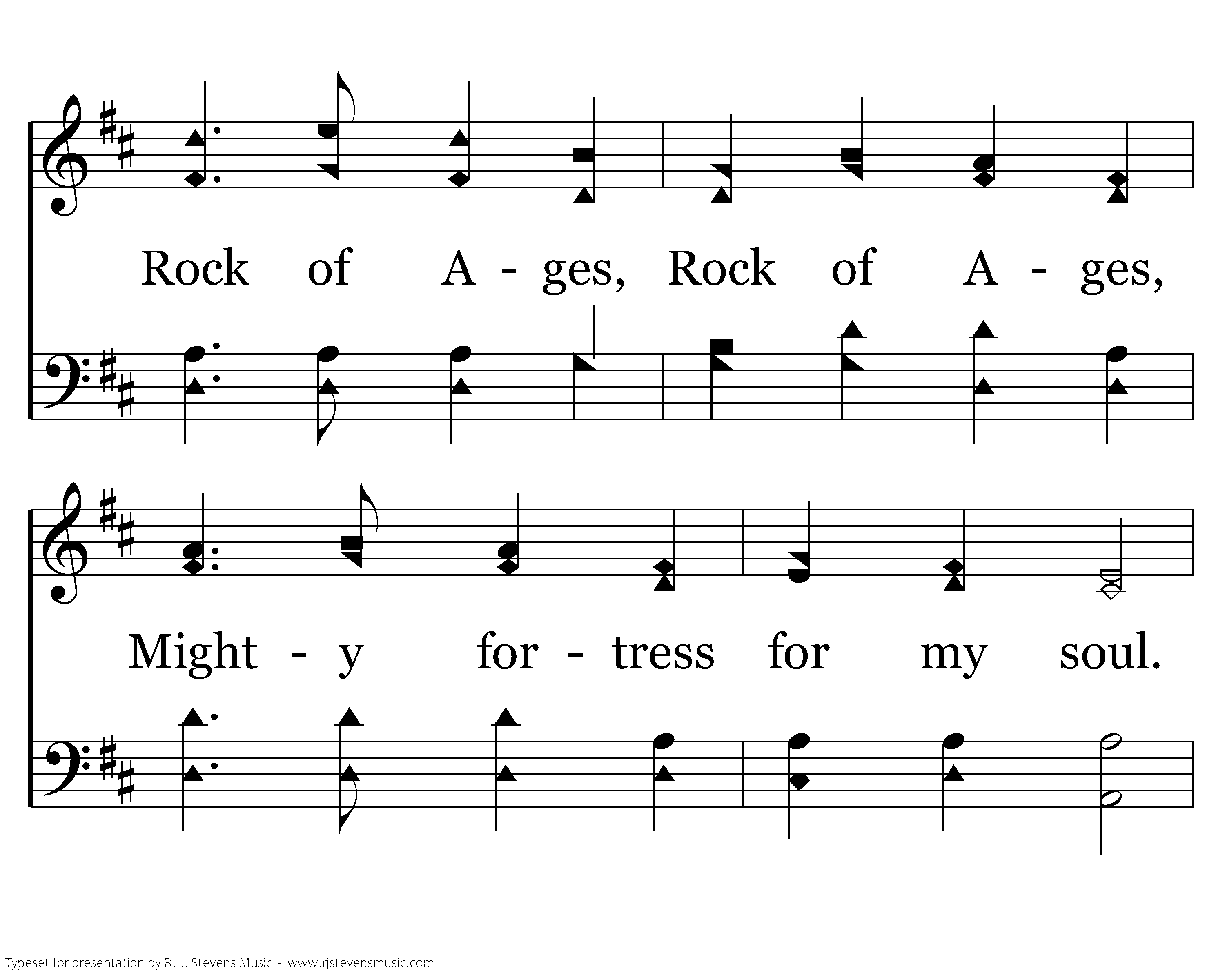 Cleft that shelters me from dan-ger, Need I cringe or even care? Must I cower for the dark-ness? No, Your love pro-tects me there. Rock of Ages, Rock of Ages, Mighty fortress for my soul. Tow'r of joy and tow'r of gladness, Keeping me within Thy fold.