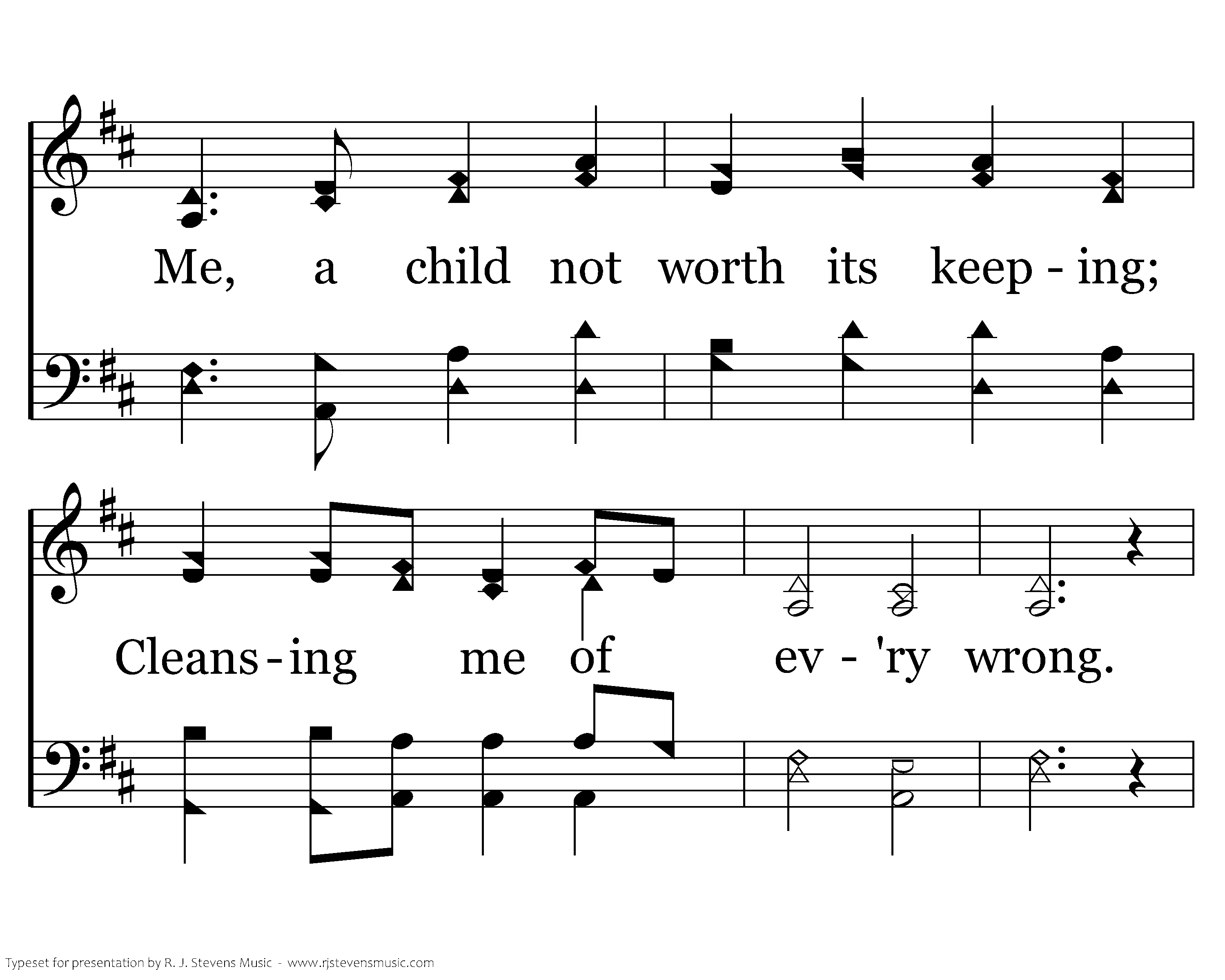Keeping me as life goes fading, Keeping me as nights grow long, Me, a child not worth its keeping; Cleansing me of ev'ry wrong. Giving me Thy blest assurrance, 'Neath the gracious cleft above. Mine is 'mong the names there written, Written in the scroll of love.