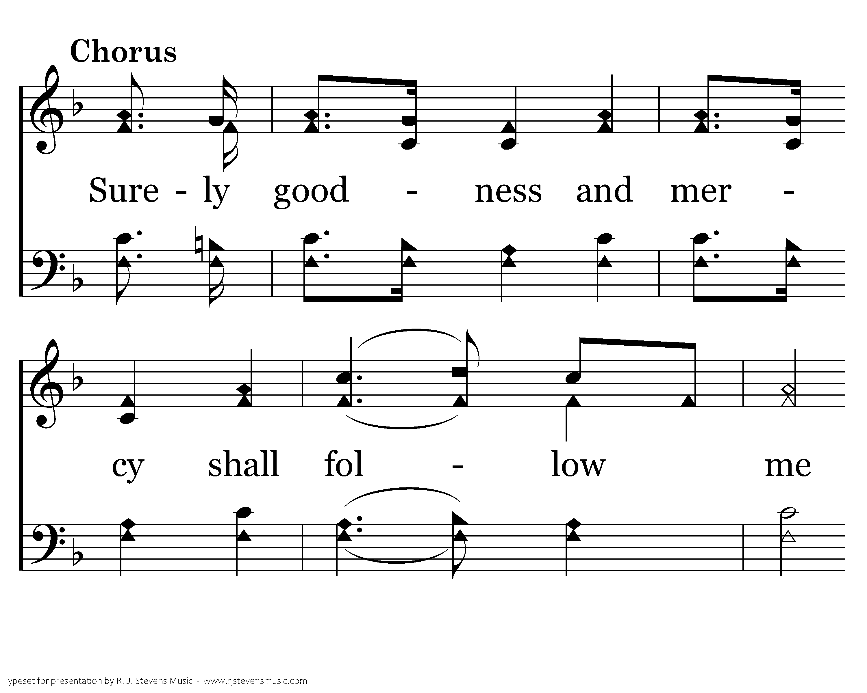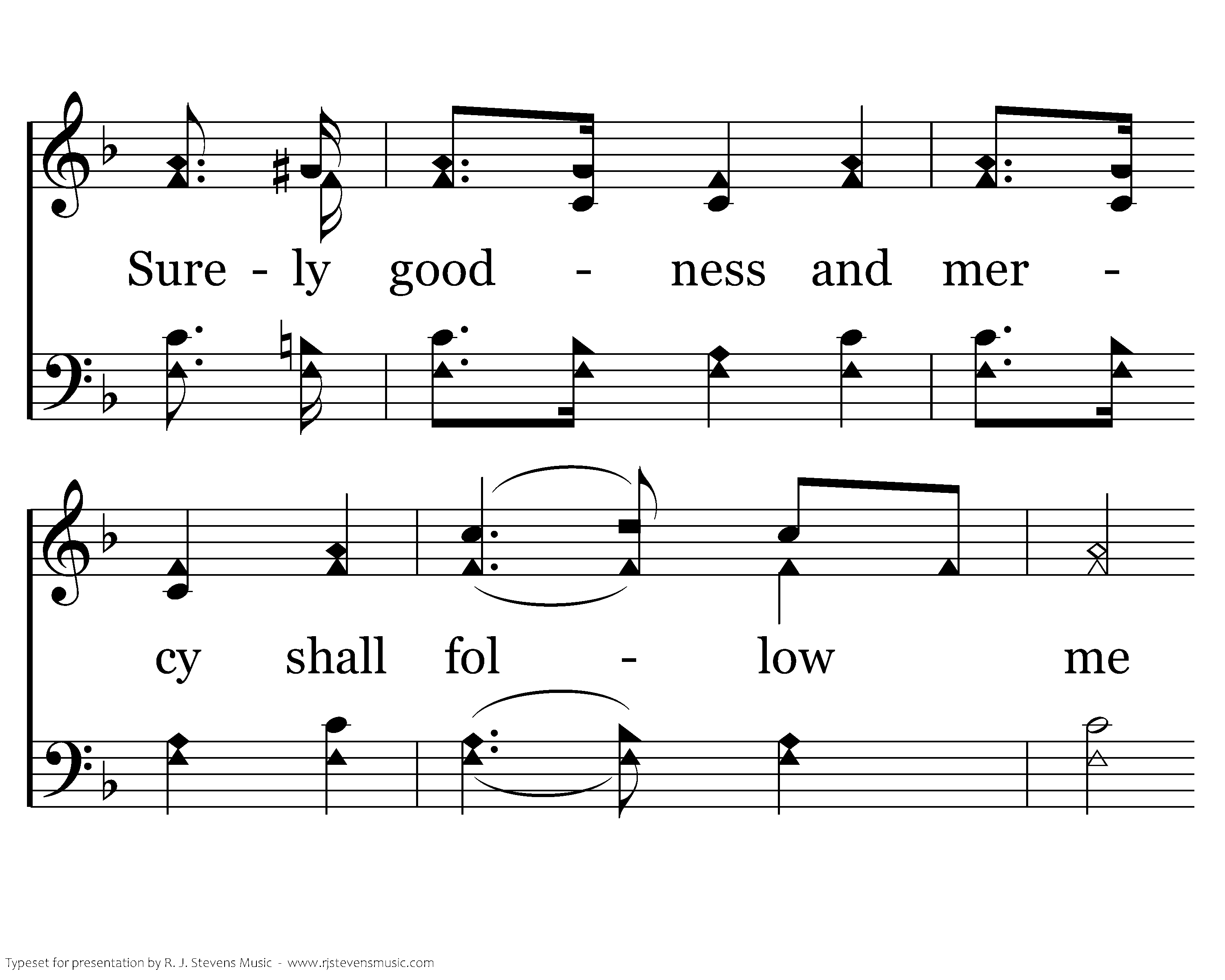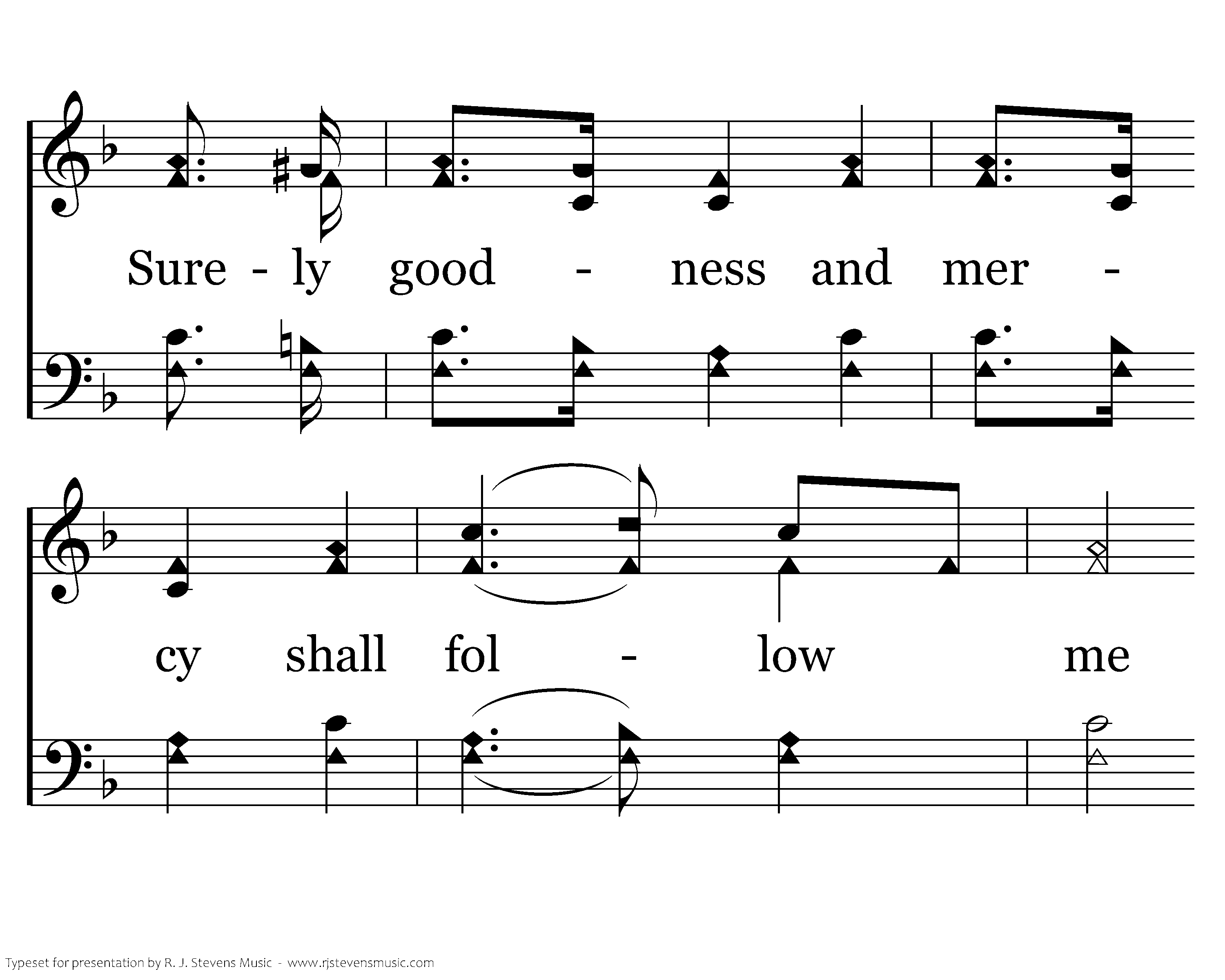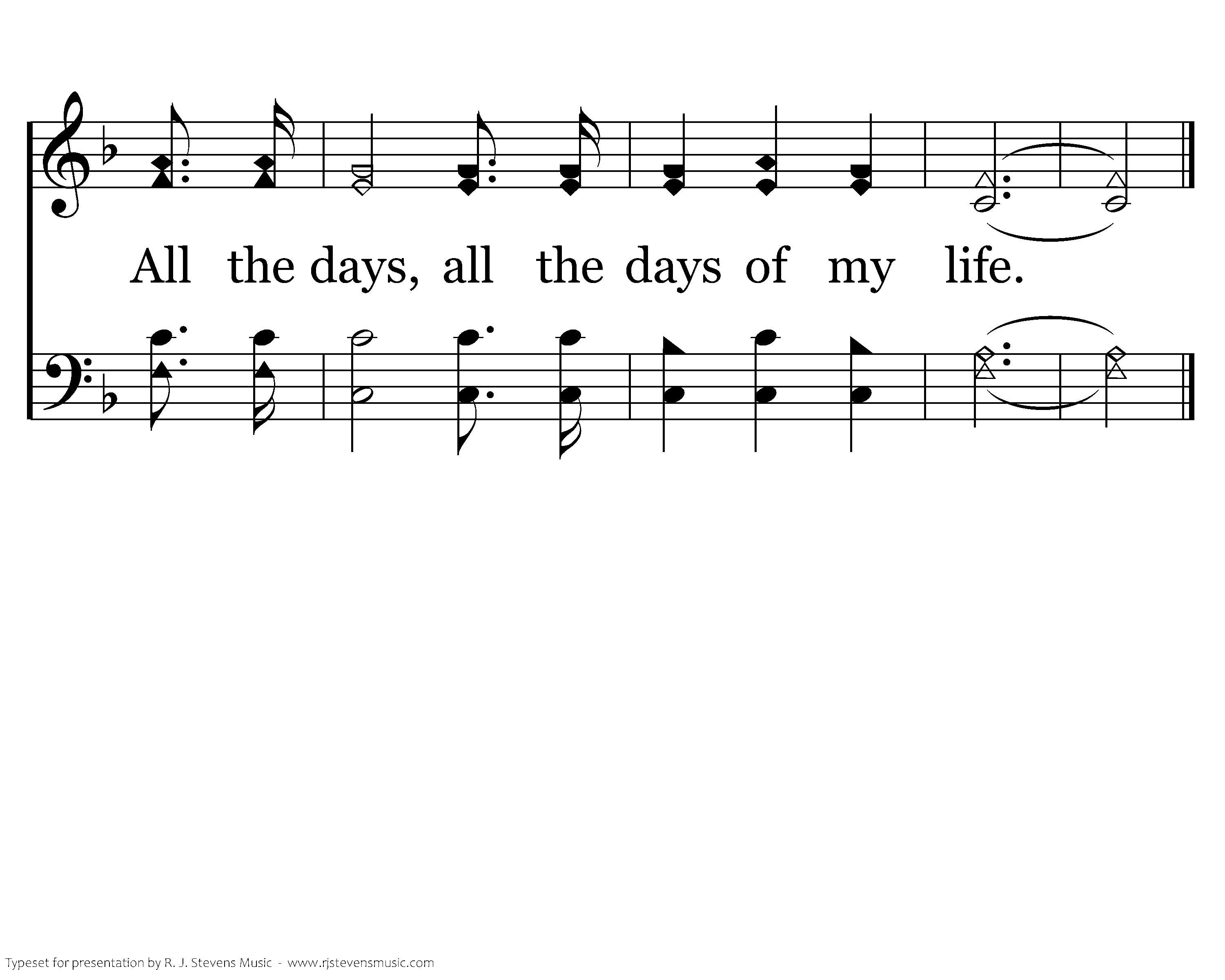 And I shall dwell in the house of the Lord forever, And I will feast at the table spread for me. Surely goodness and mercy shall follow me All the days, all the days of my life.
