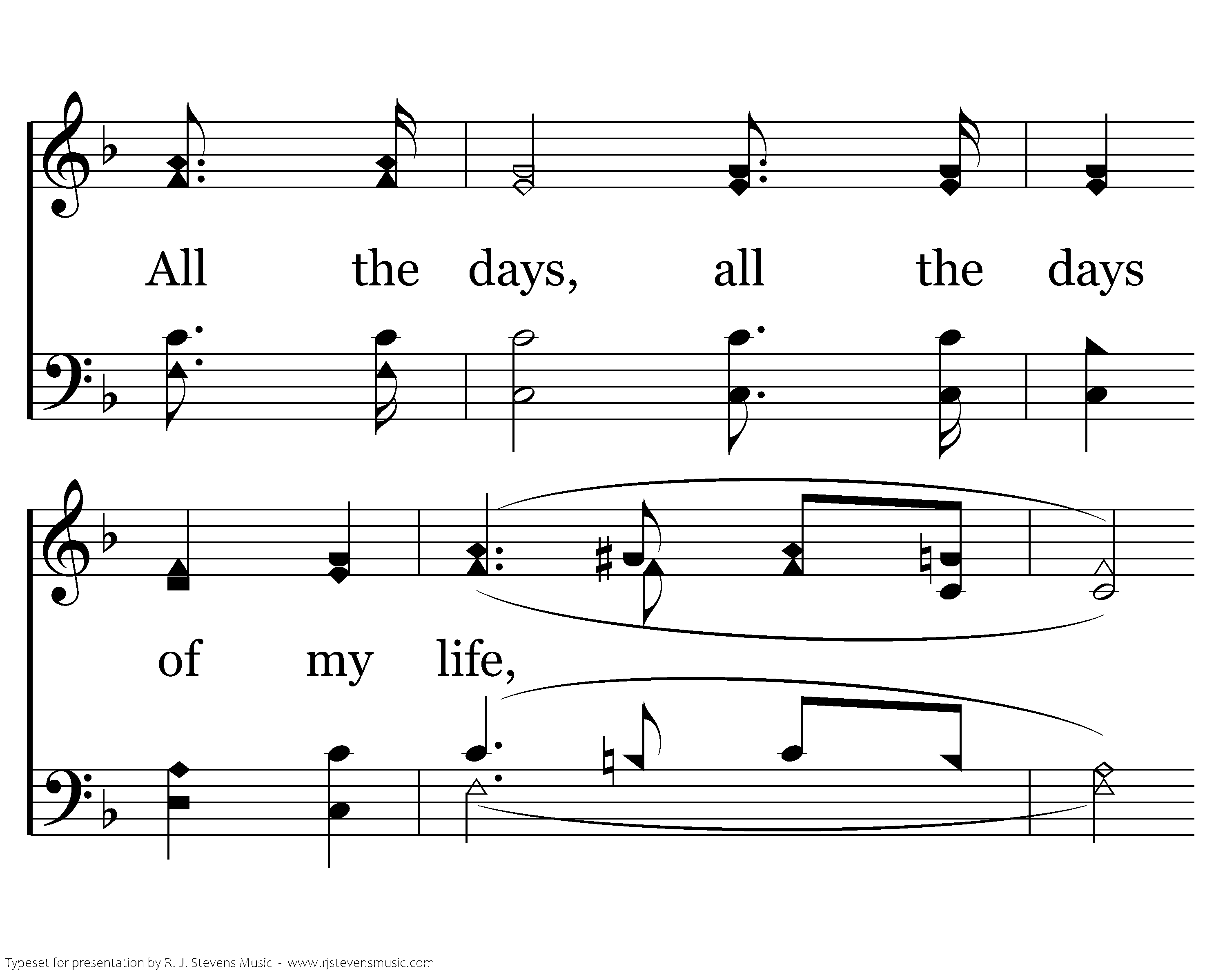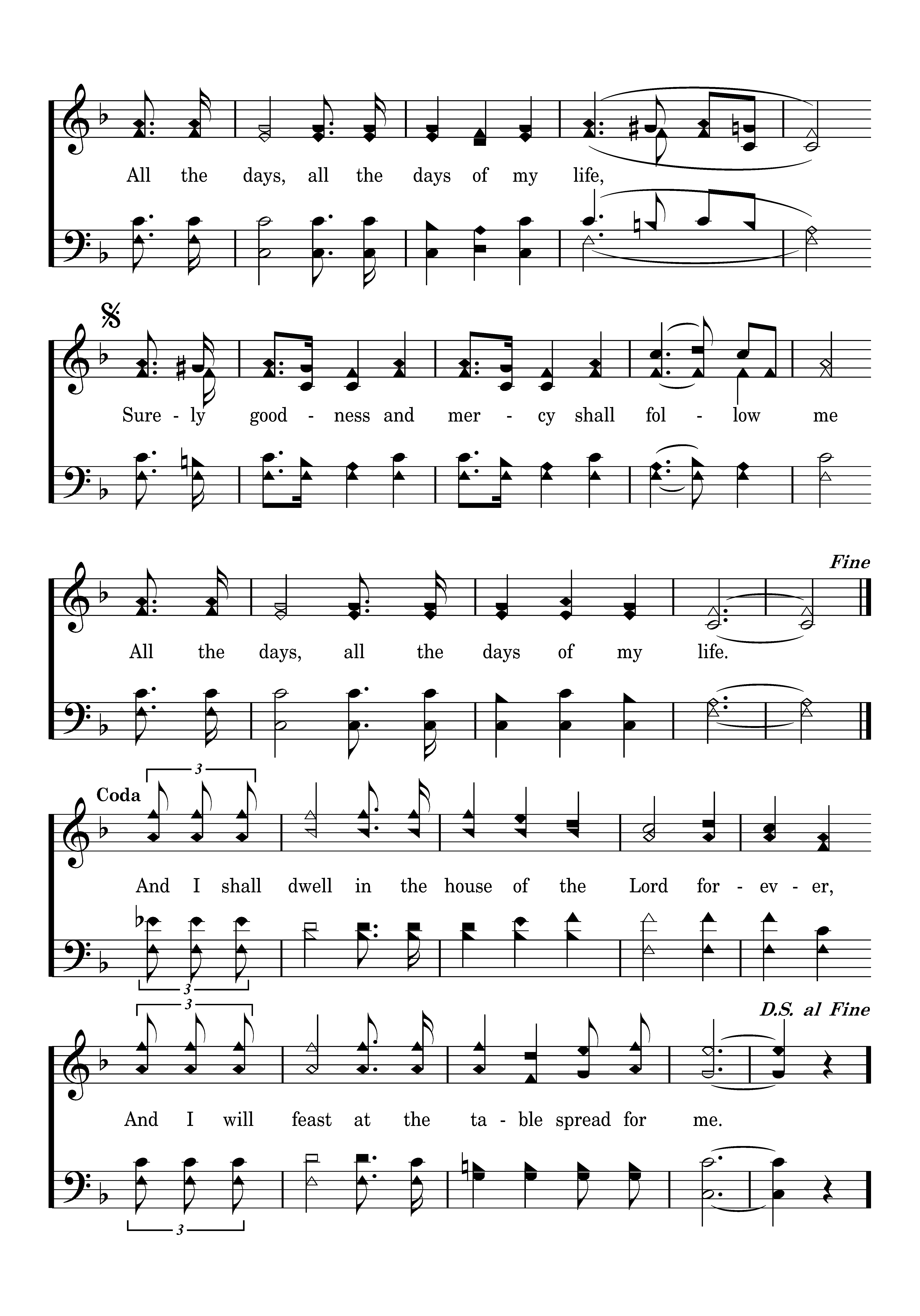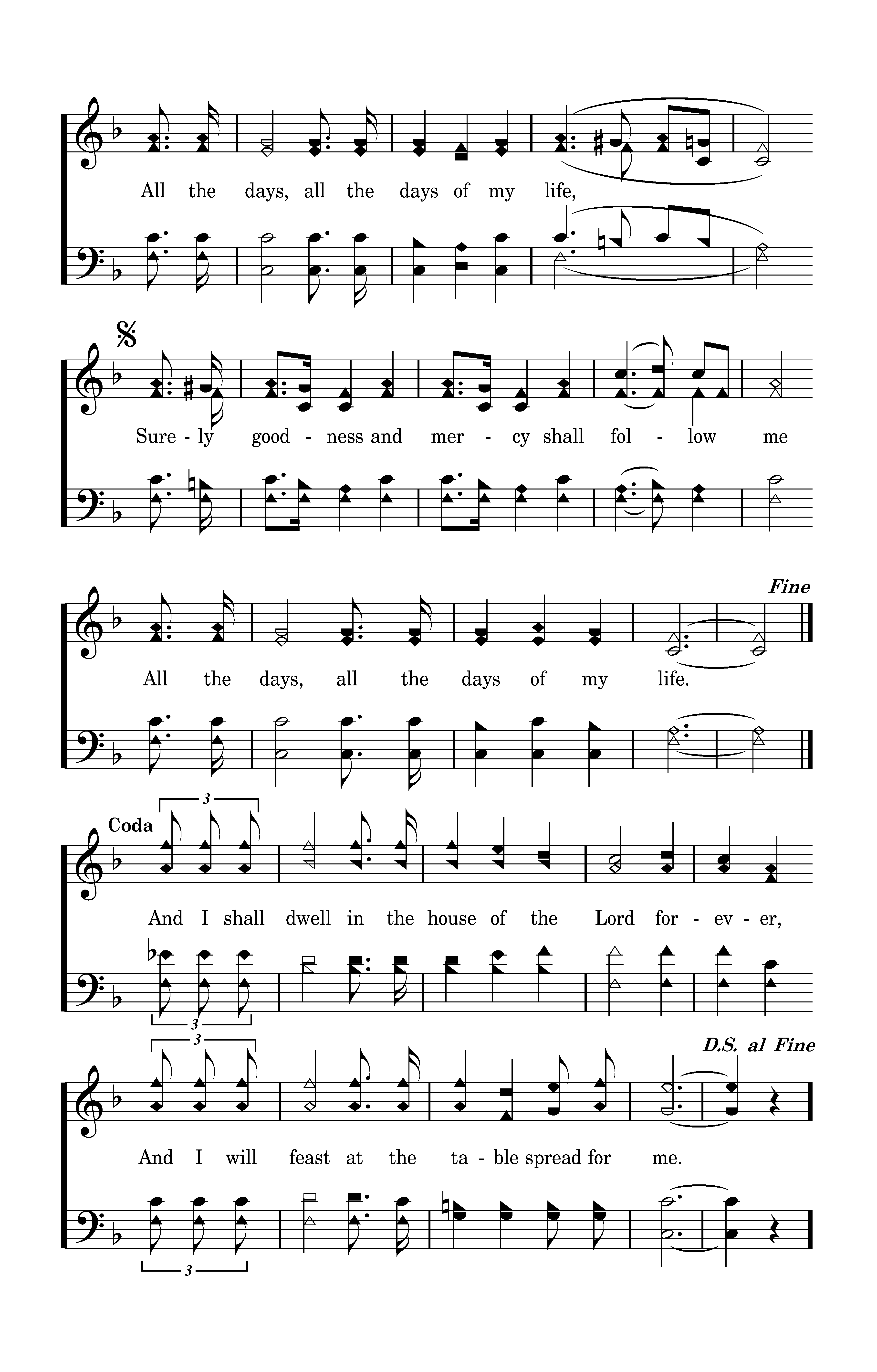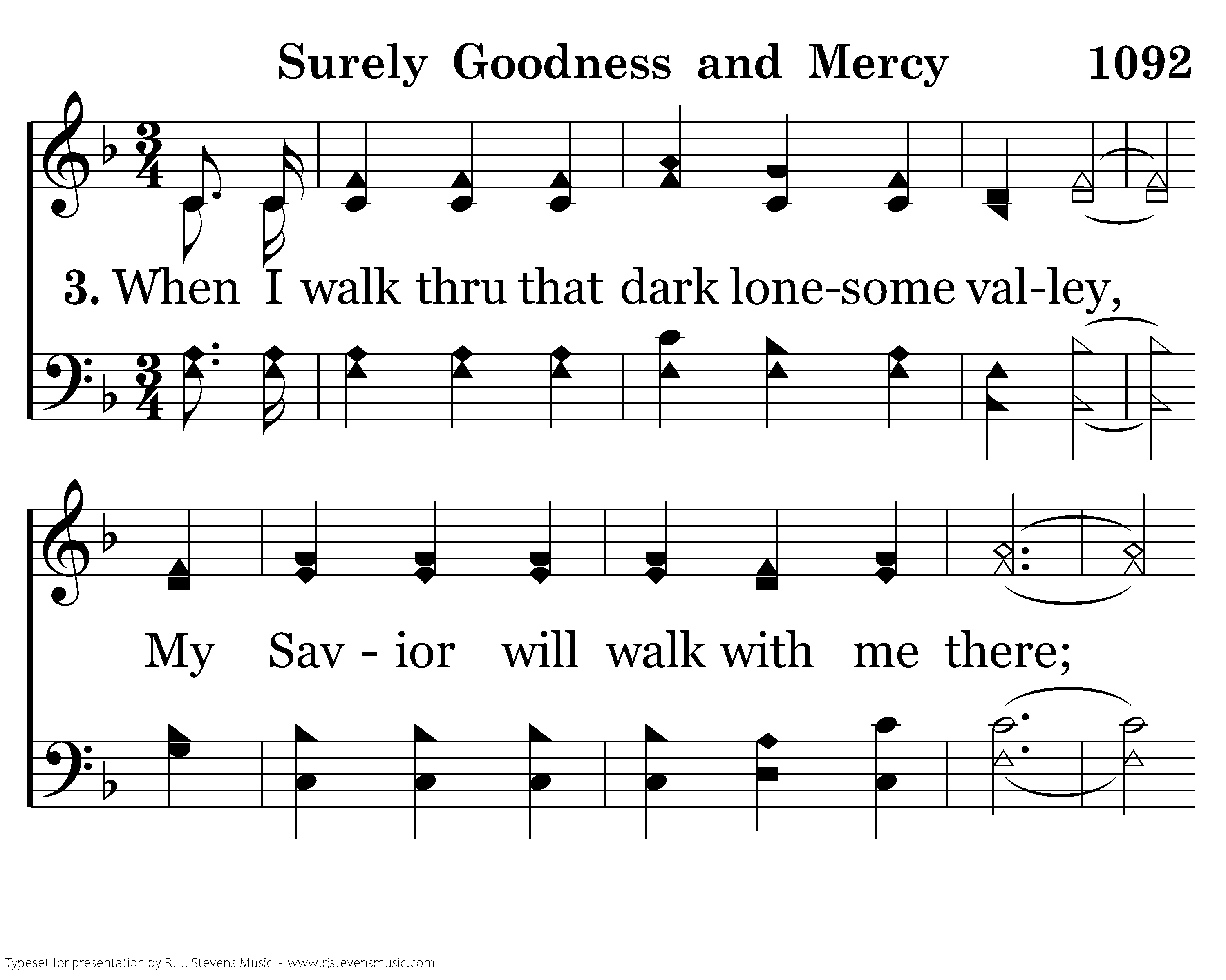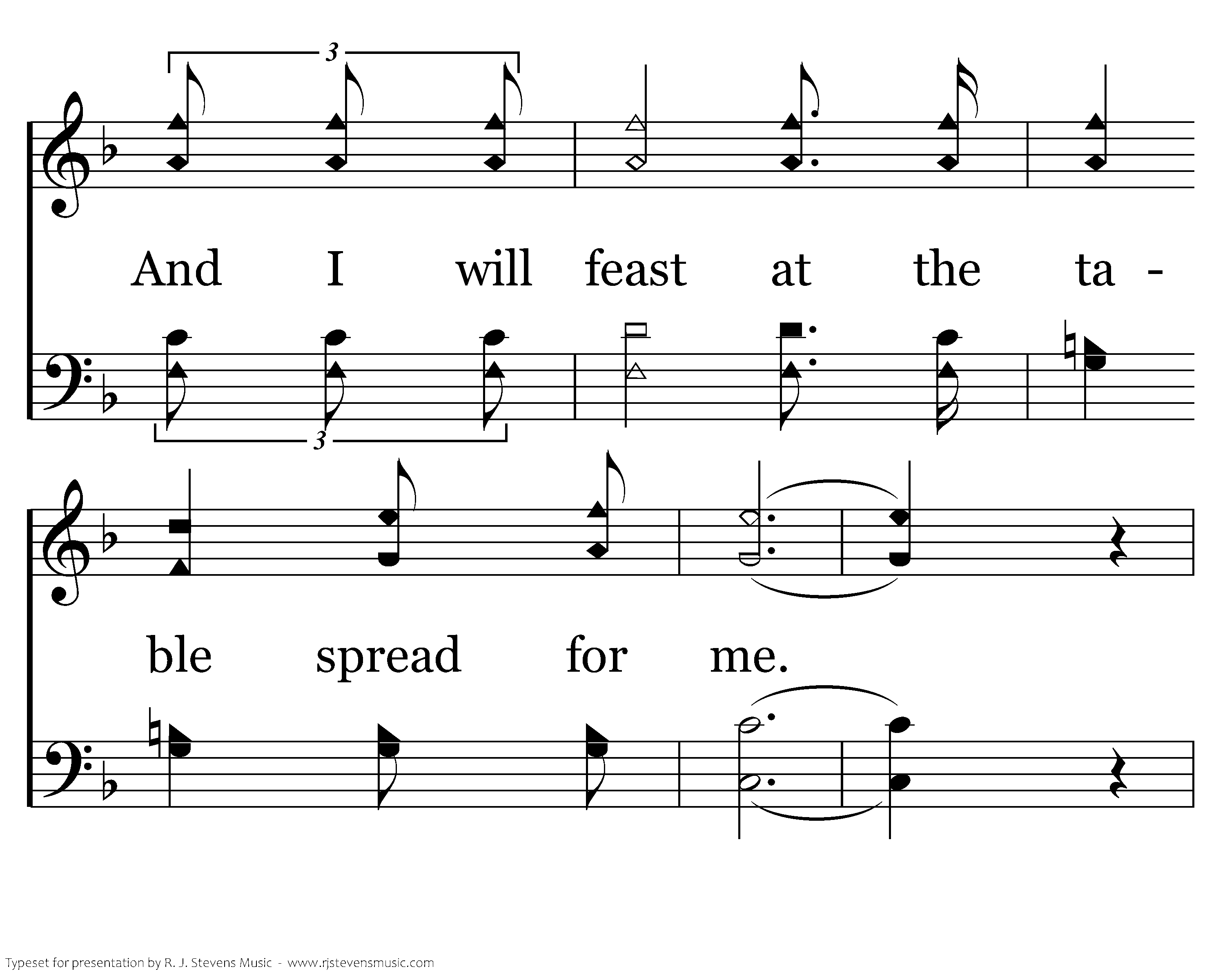 And I shall dwell in the house of the Lord forever, And I will feast at the table spread for me. Surely goodness and mercy shall follow me All the days, all the days of my life.