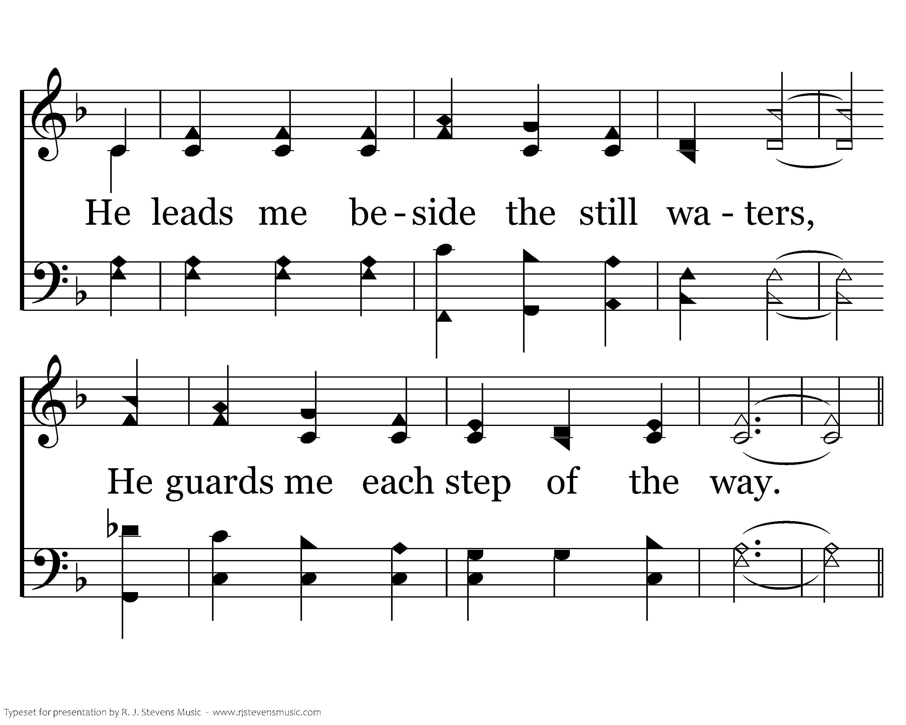 He restoreth my soul when I'm weary, He giveth me strength day by day; He leads me beside the still waters, He guards me each step of the way.