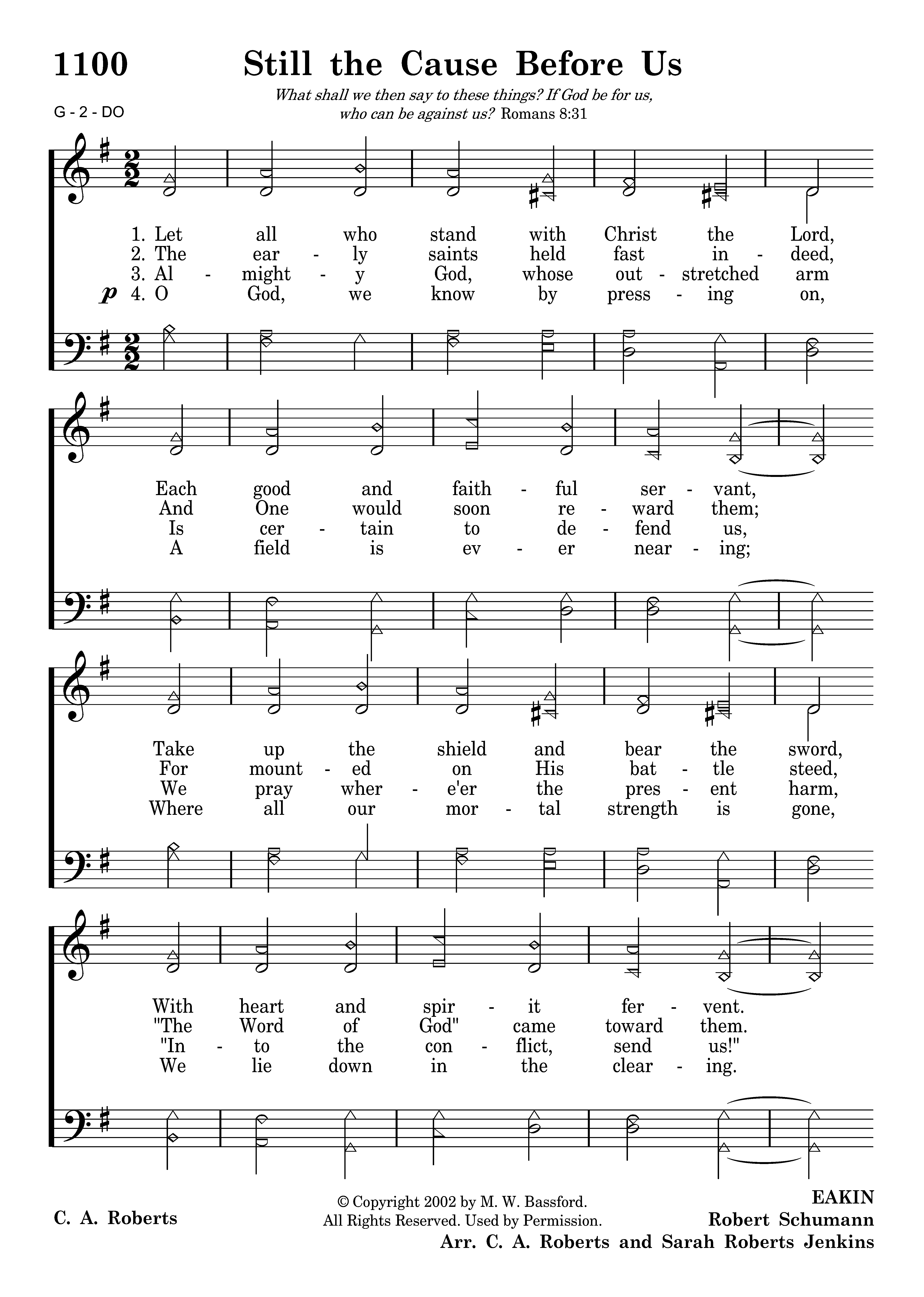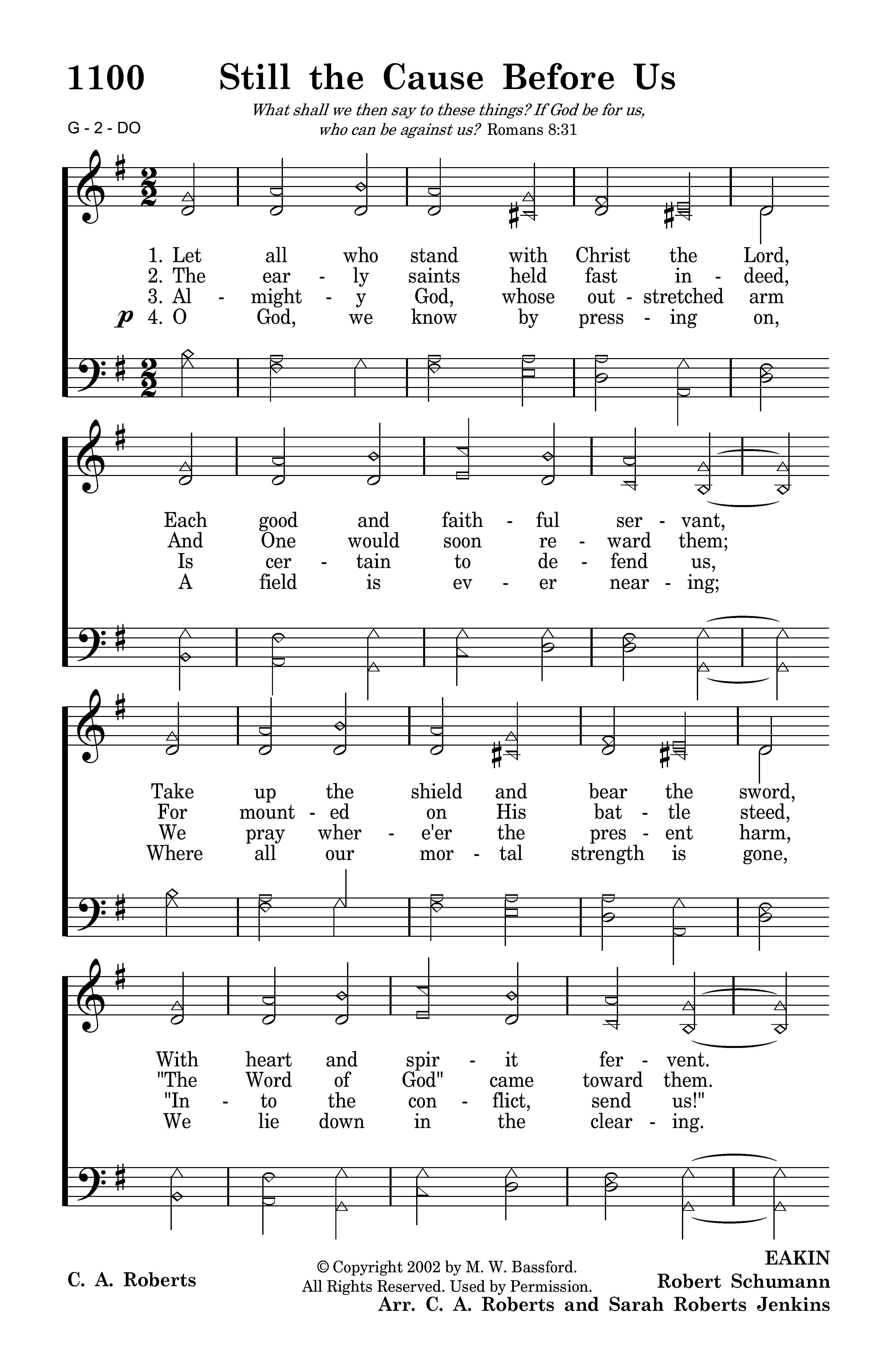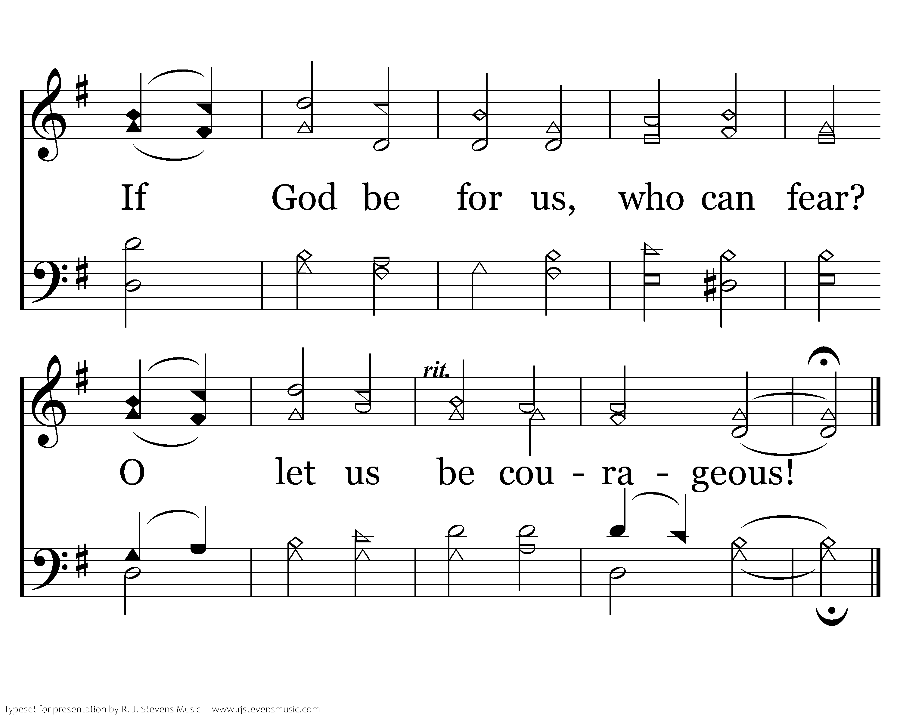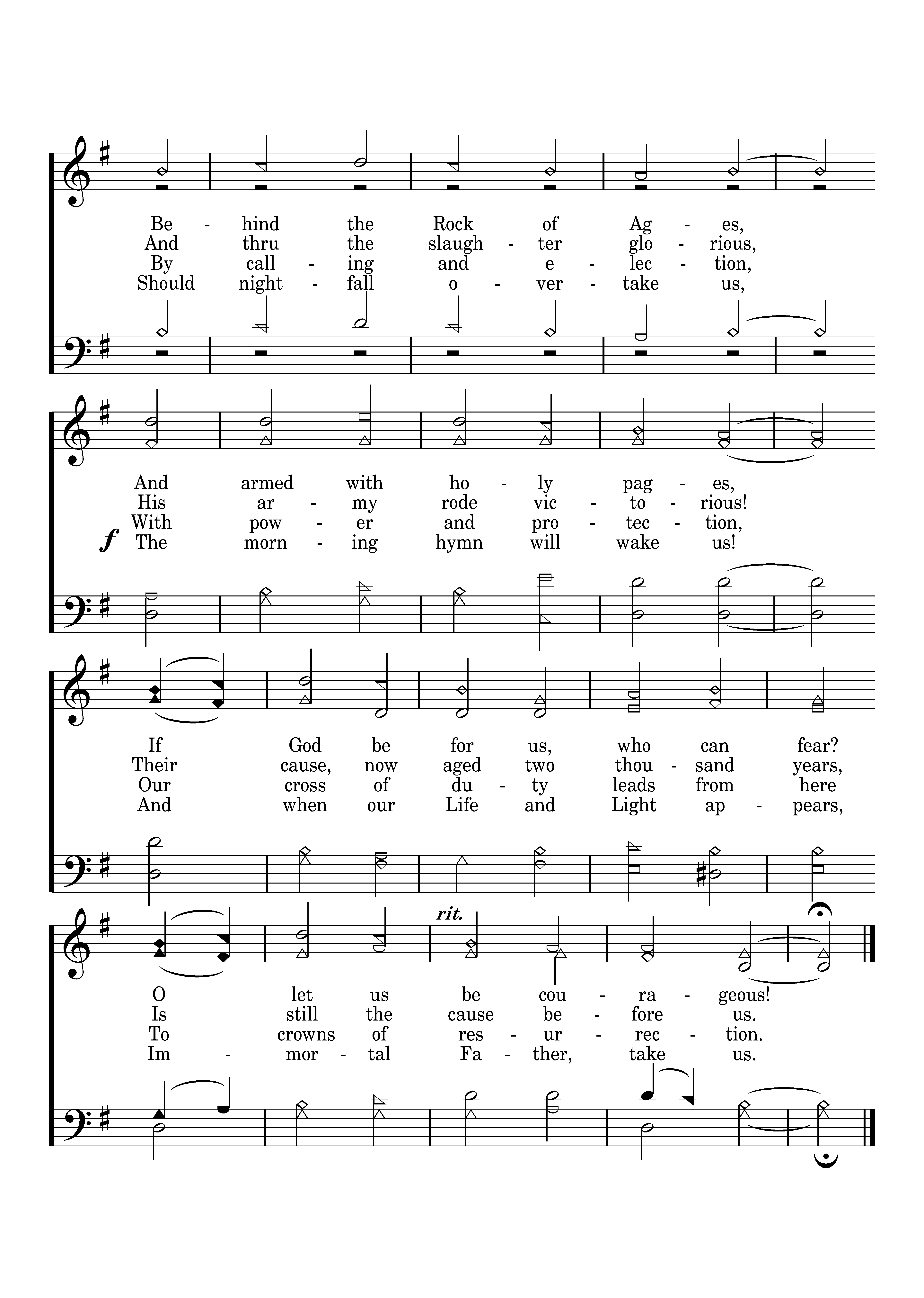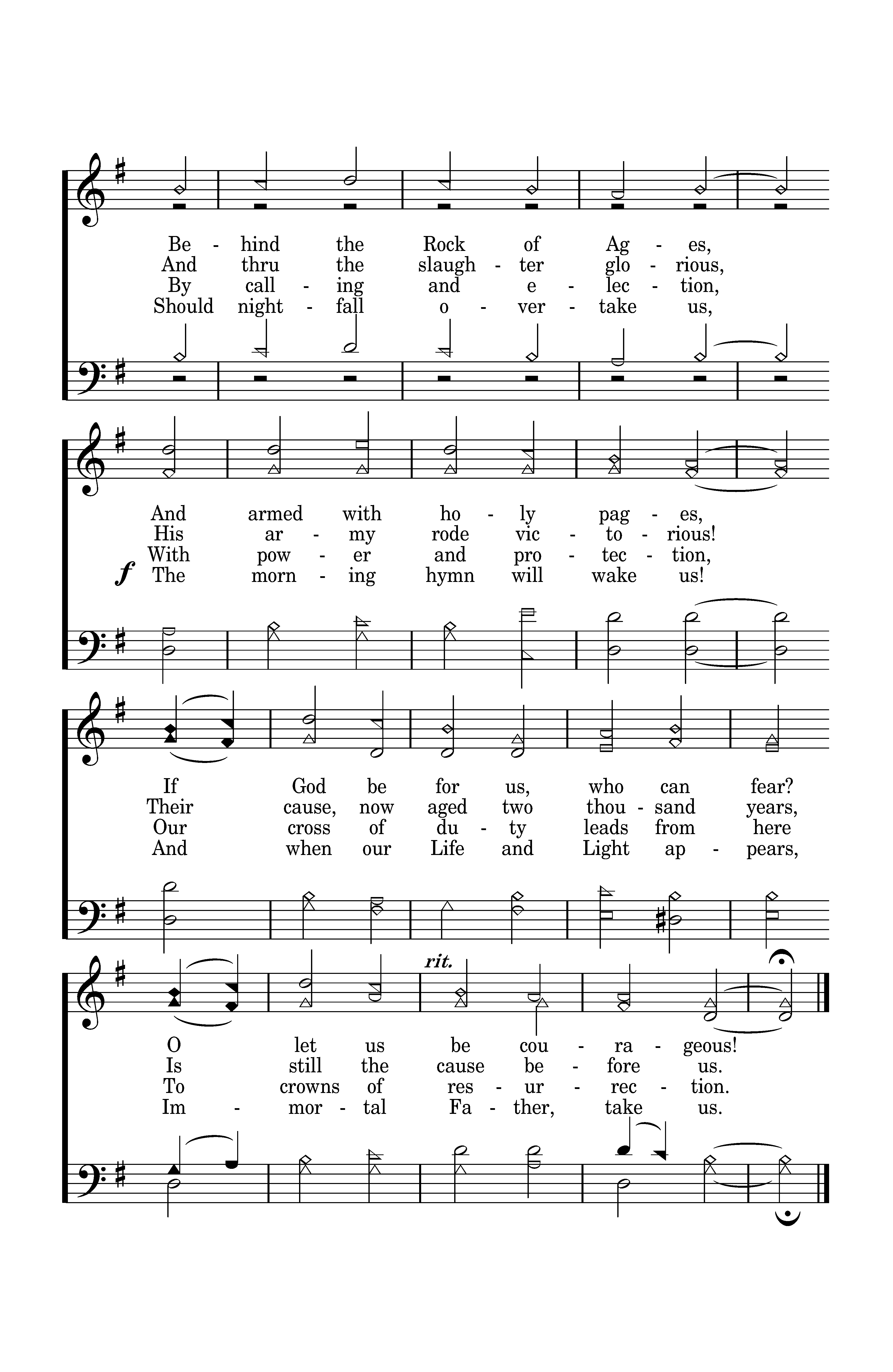 Let all who stand with Christ the Lord, Each good and faithful servant, Take up the shield and bear the sword, With heart and spirit fervent. Behind the Rock of Ages, And armed with holy pages, If God be for us, who can fear? O let us be courageous!