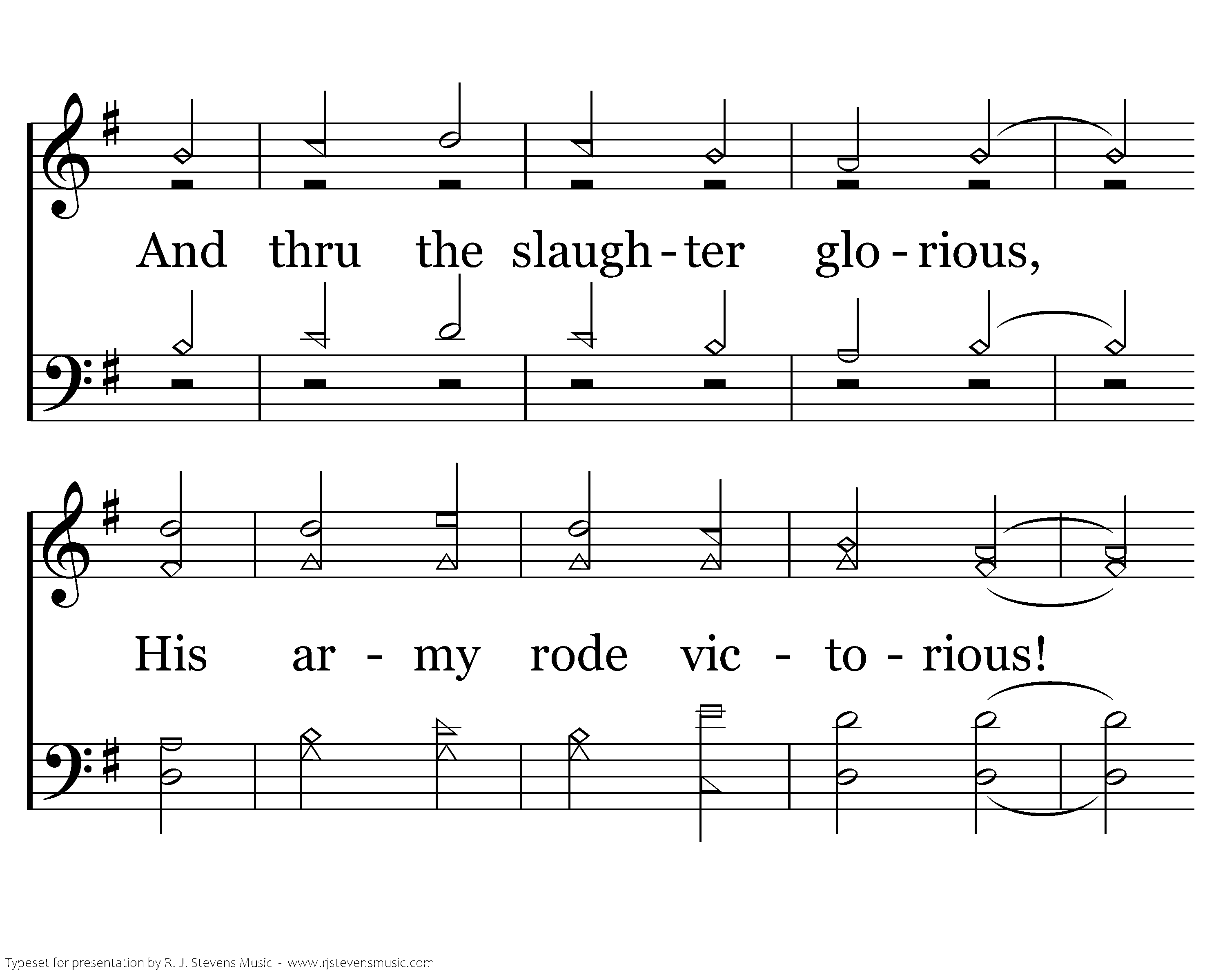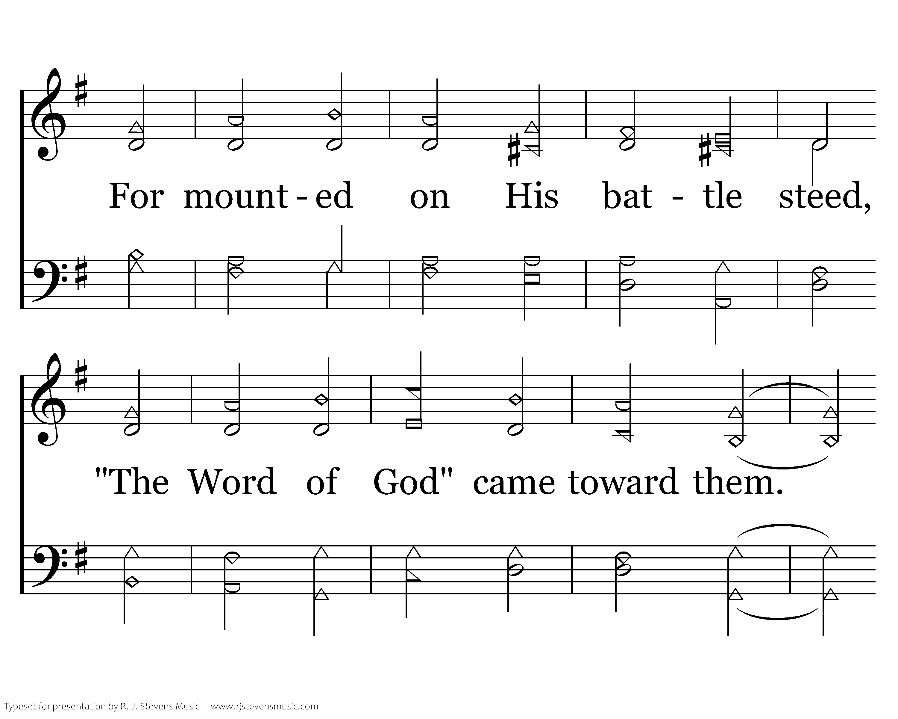 The early saints held fast indeed, And One would soon reward them; For mounted on His battle steed, "The Word of God" came toward them. And thru the slaughter glorious, His army rode victorious! Their cause, now aged two thousand years, Is still the cause before us.