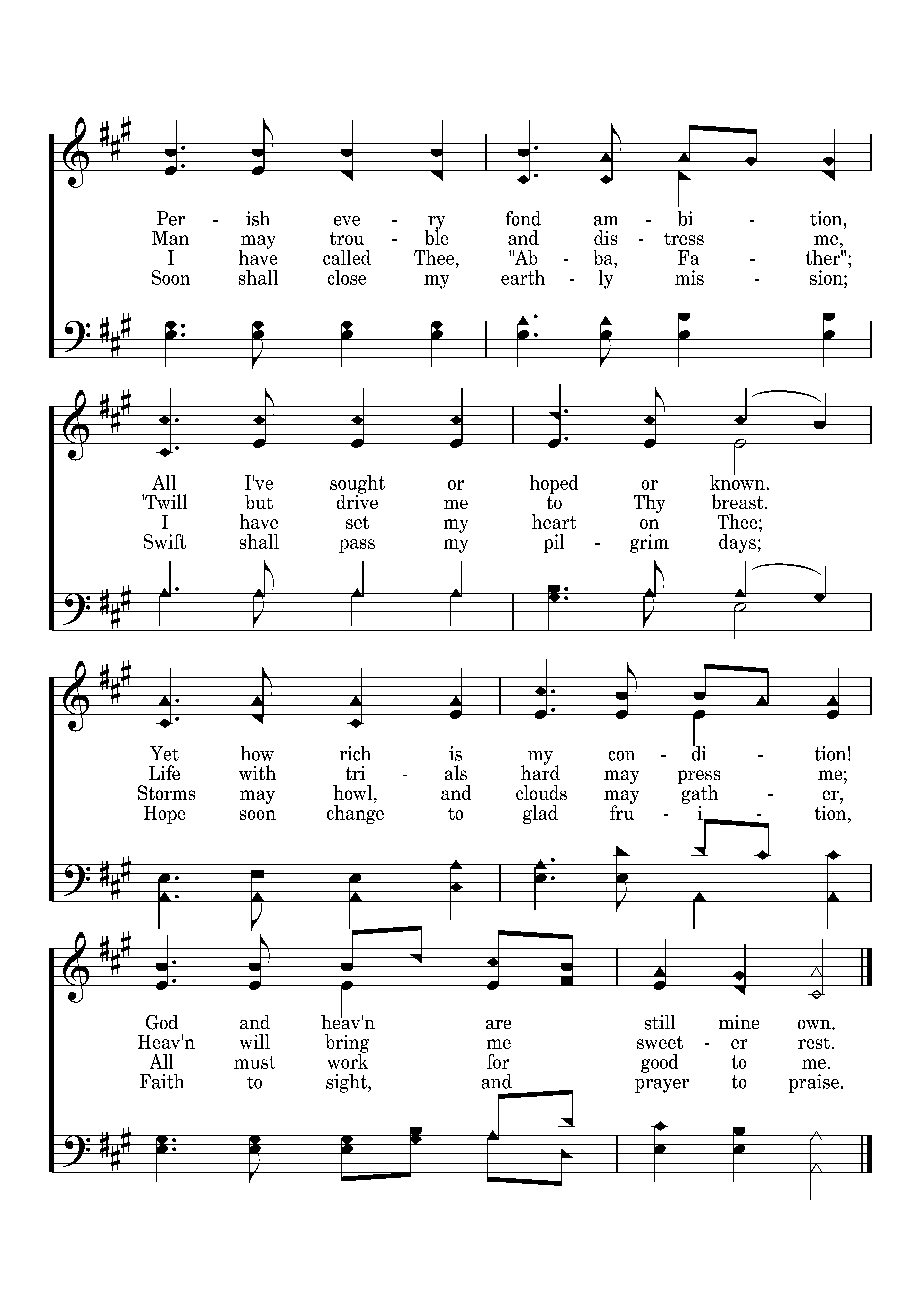 Let the world despise and leave me; They have left my Savior, too. Human hearts and looks deceive me; Thou art not, like them, untrue. Man may trouble and distress me, 'Twill but drive me to Thy breast. Life with trials hard may press me; Heav'n will bring me sweeter rest.