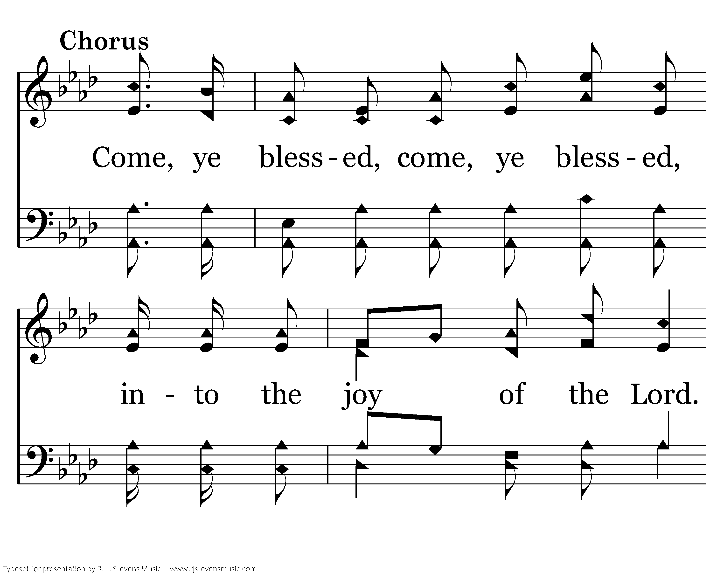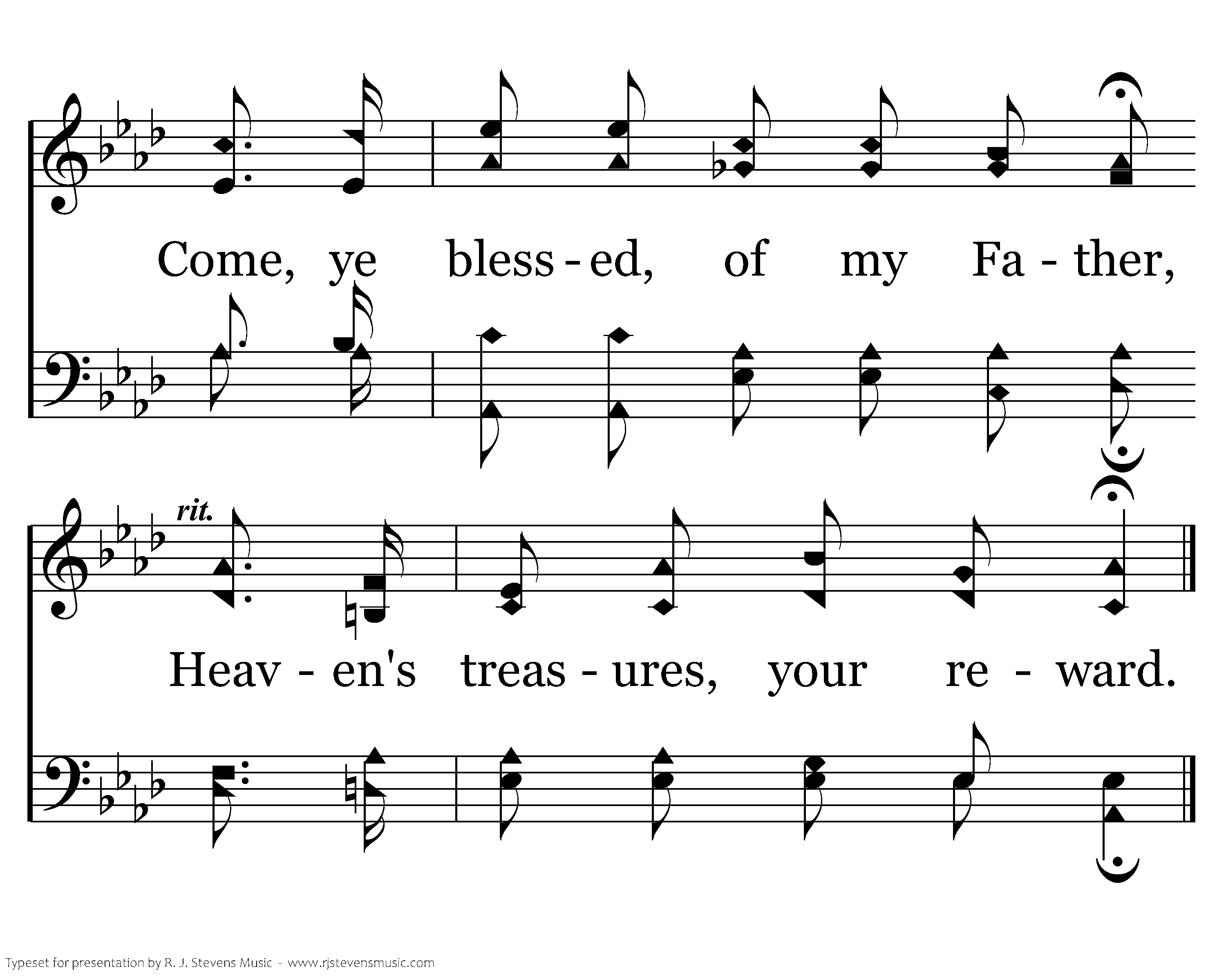 Come, ye blessed, come, ye blessed, into the joy of the Lord. Come, ye blessed, of my Father, Heaven's treasures, your reward.