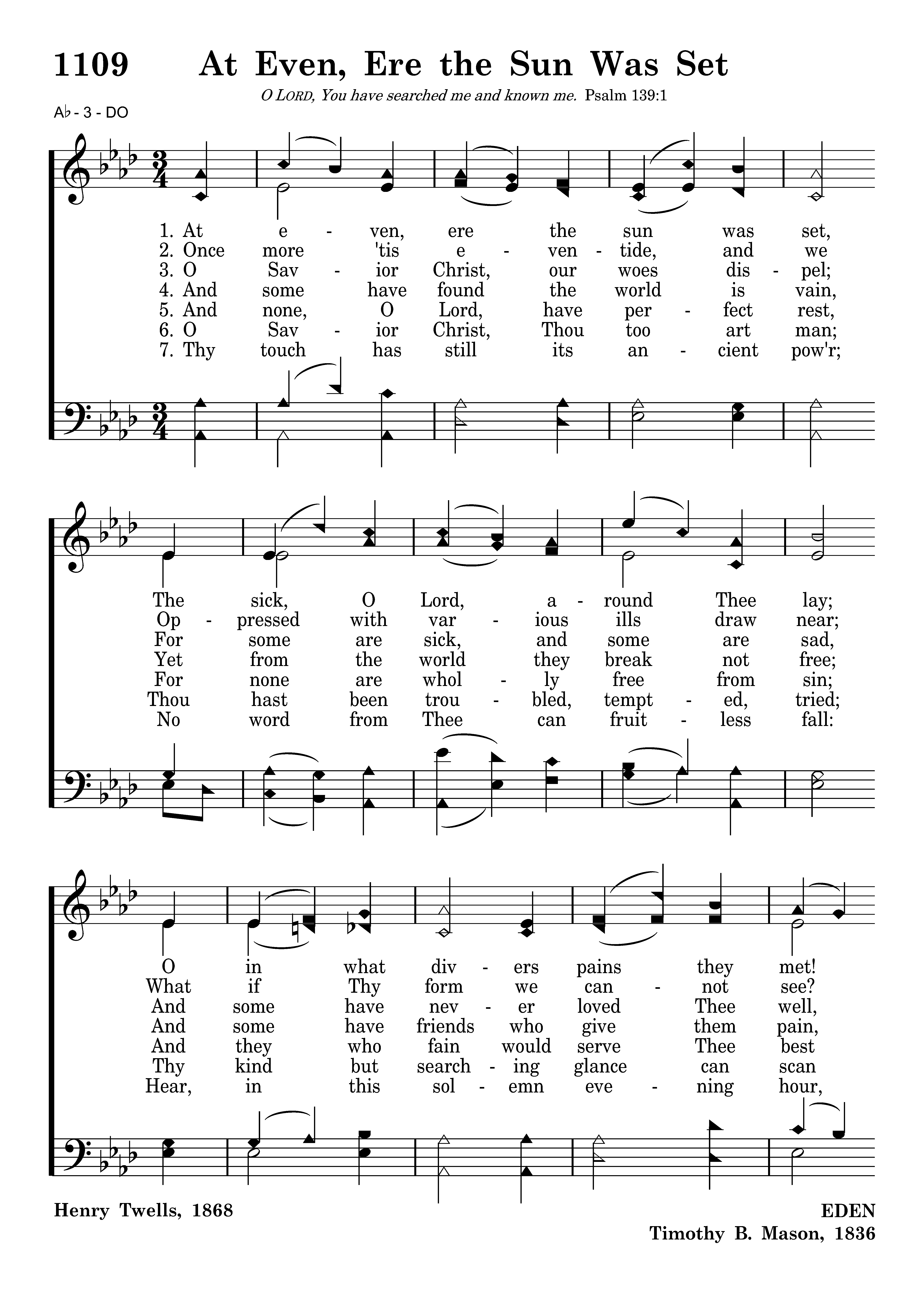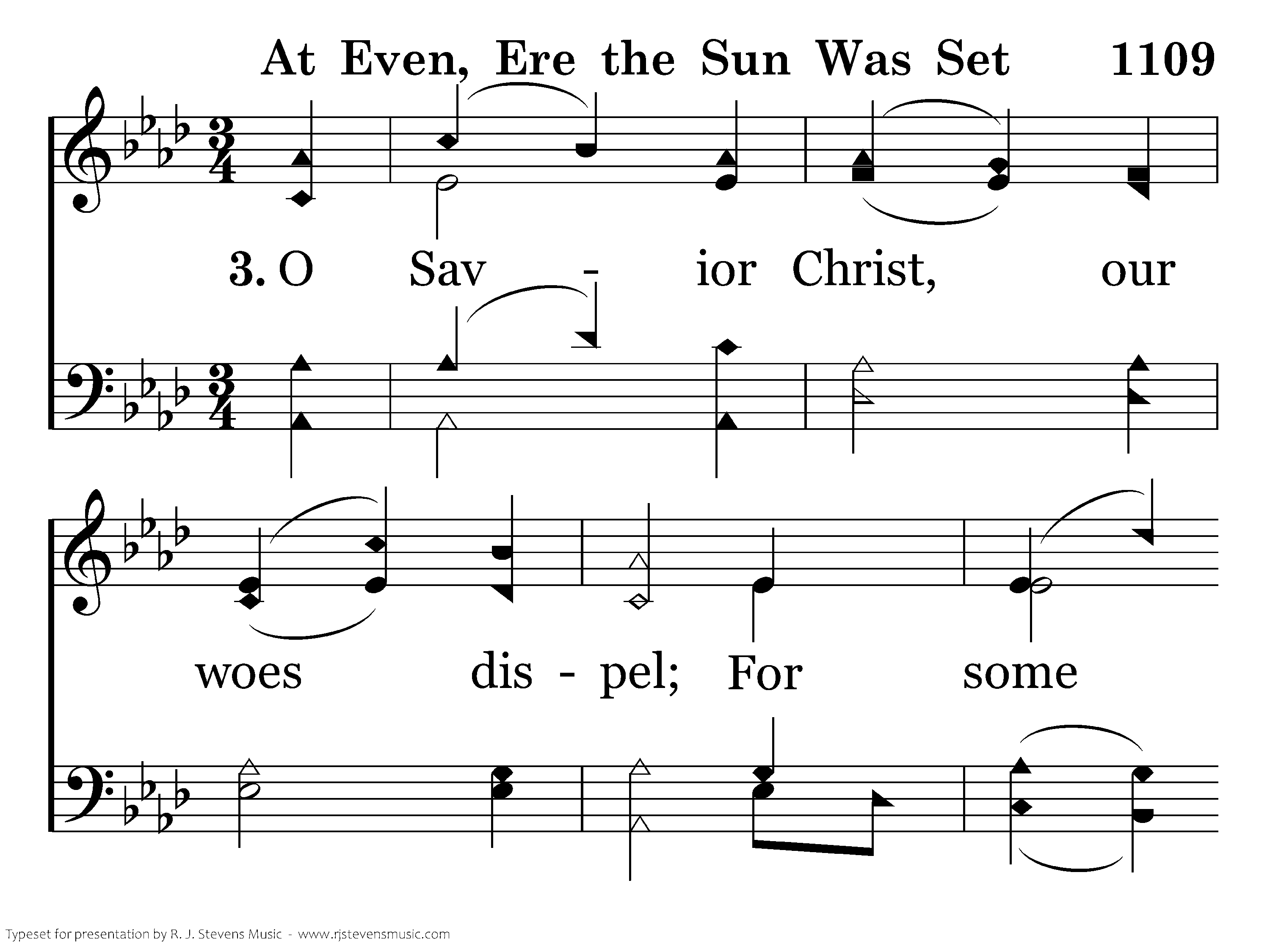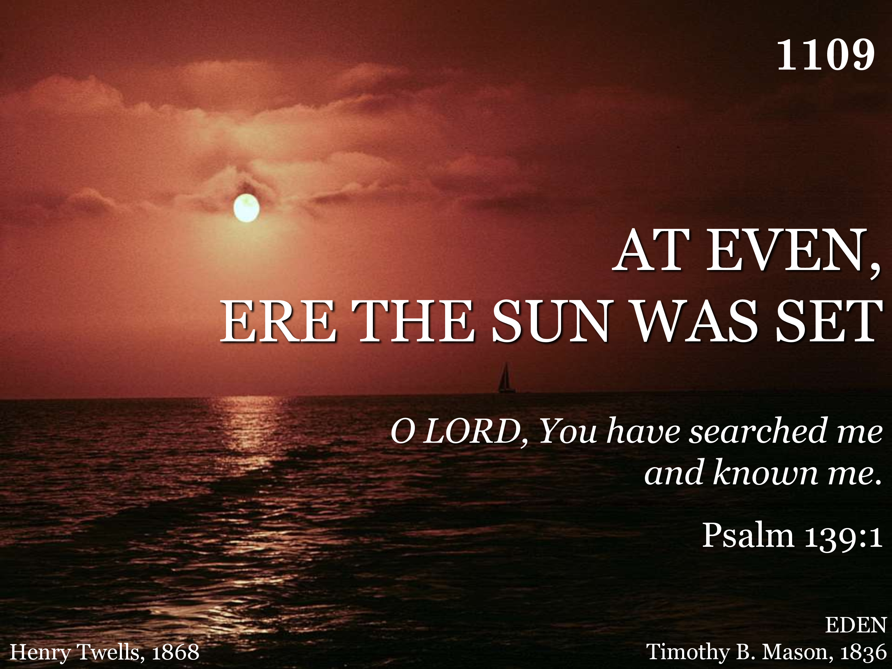 At even, ere the sun was set, The sick, O Lord, around Thee lay; O in what divers pains they met! O with what joy they went away!