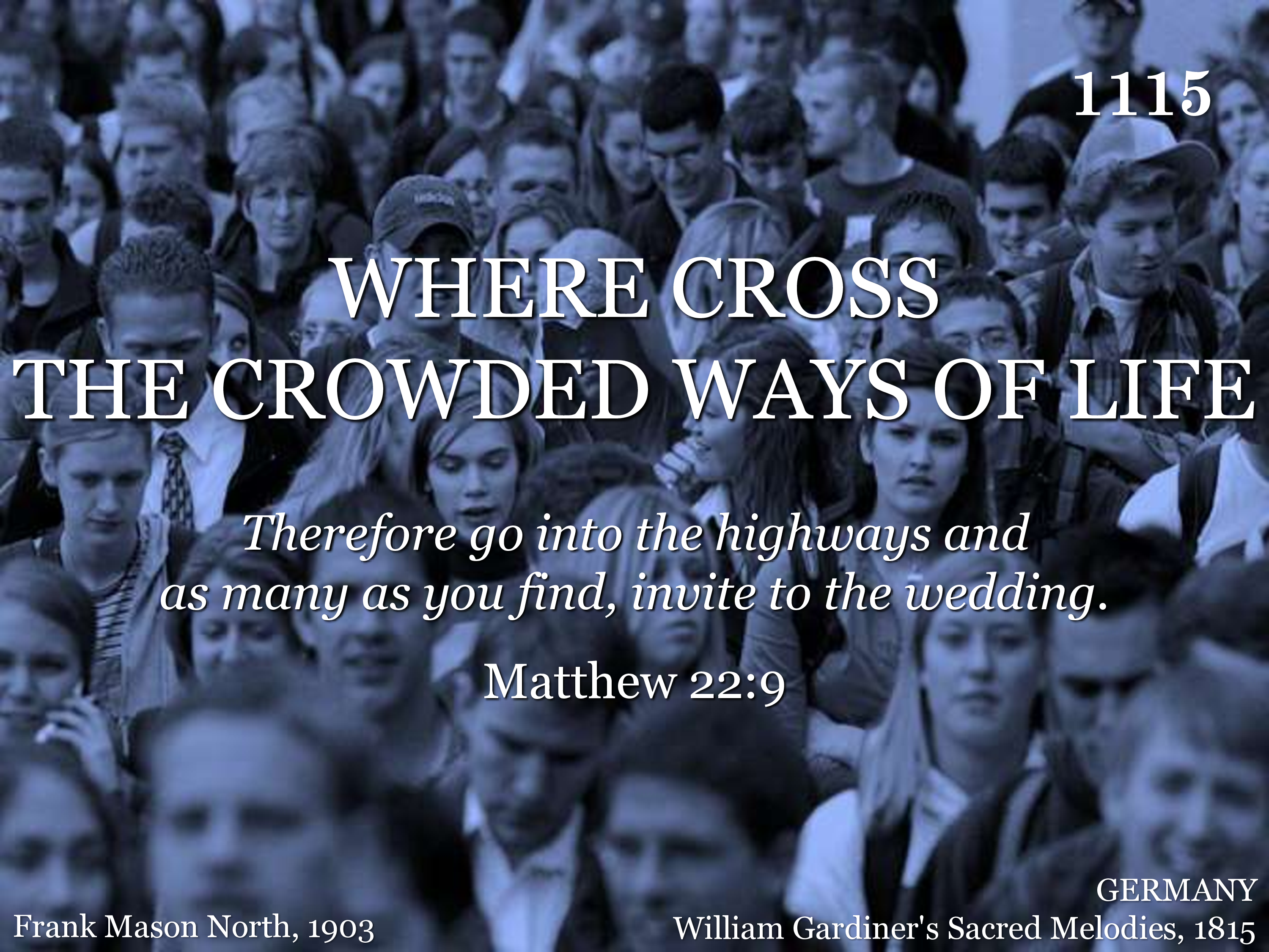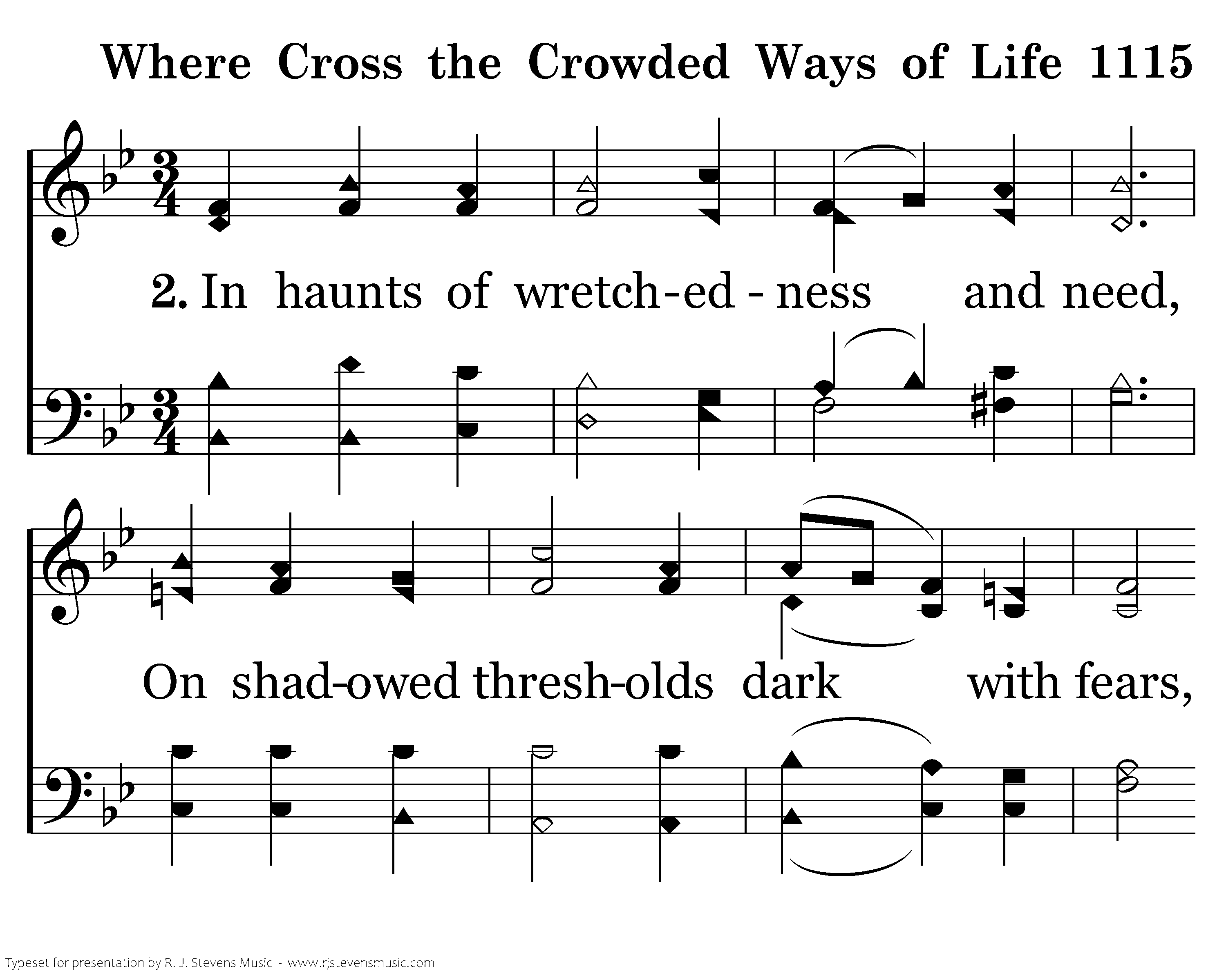 Where cross the crowded ways of life, Where sound the cries of race and clan A-bove the noise of selfish strife, We hear Your voice, O Son of Man.