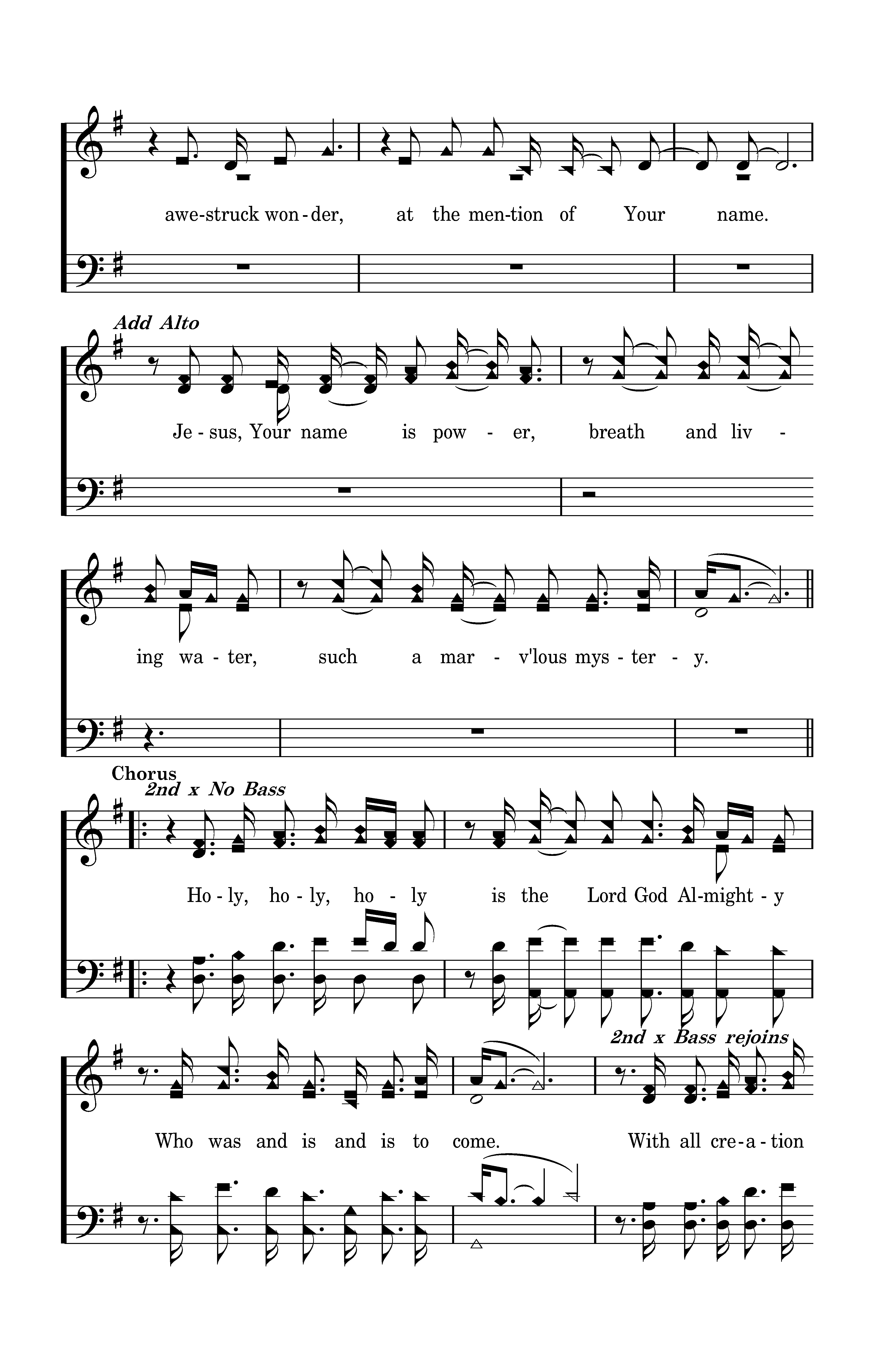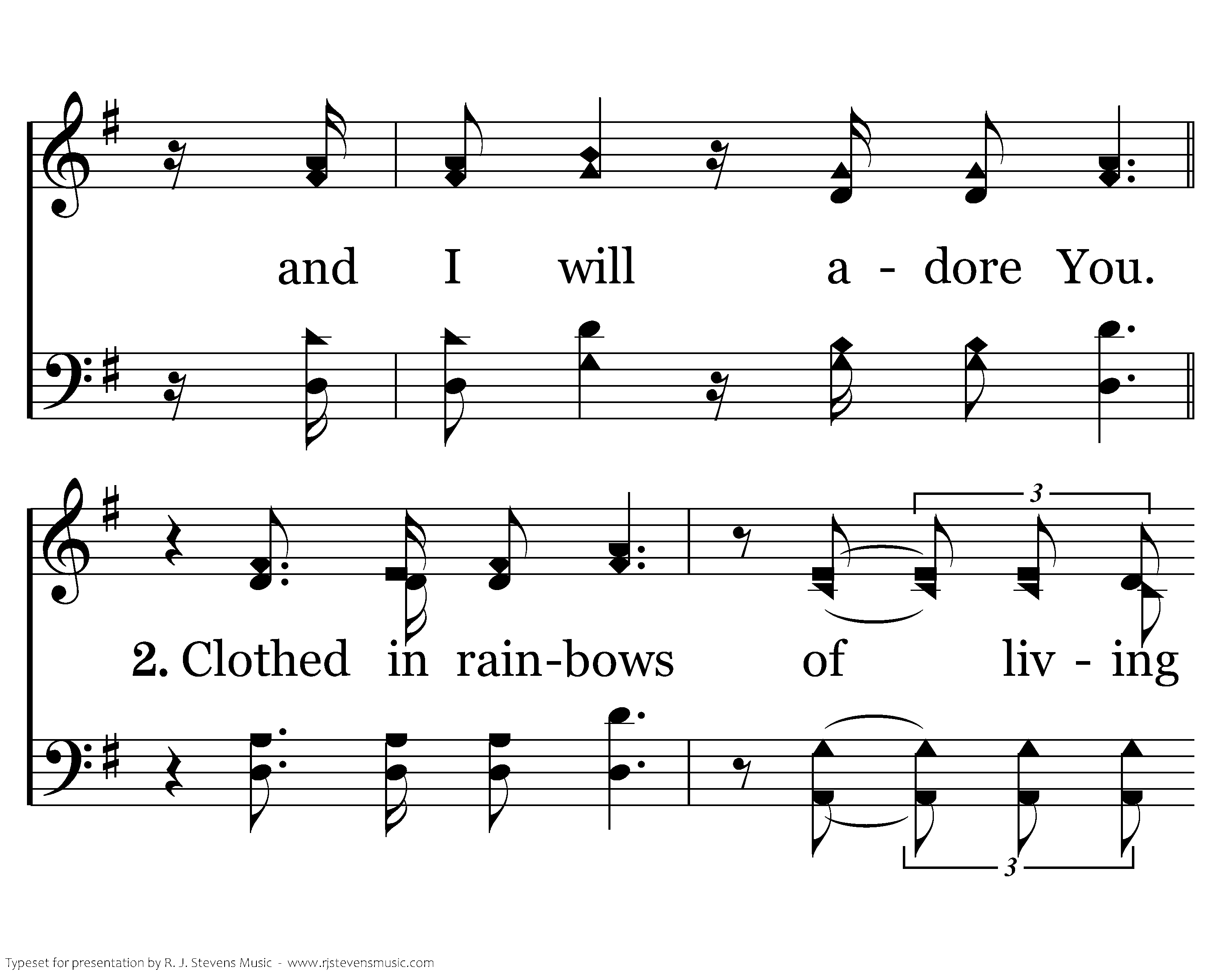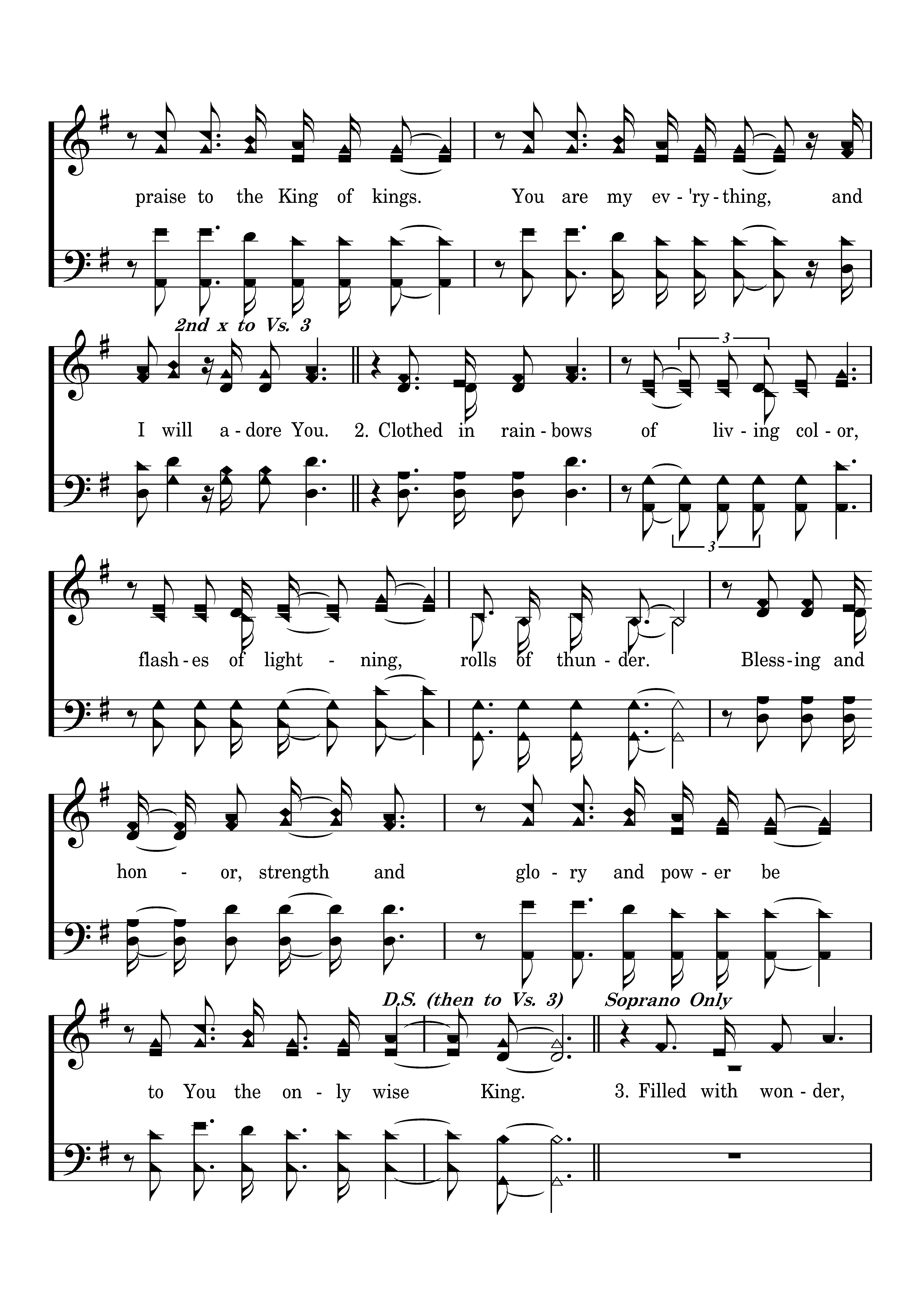 Worthy is the Lamb who was slain, holy, holy is He. Sing a new song to Him who sits on heaven's mercy seat. Holy, holy, holy is the Lord God Almighty, who was and is and is to come. With all creation I sing praise to the King of kings. You are my ev'rything, and I will adore You. Clothed in rainbows of living color, flashes of lightning, rolls of thunder. Blessing and honor, strength and glory and power be to You the only wise King. Filled with wonder, awestruck wonder, at the mention of Your name. Jesus, Your name is power, breath and living water, such a marv'lous mystery. Holy, holy, holy is the Lord God Almighty Who was and is and is to come. With all creation I sing praise to the King of kings. You are my ev'rything, and I will adore You. I will adore You. I will adore You.