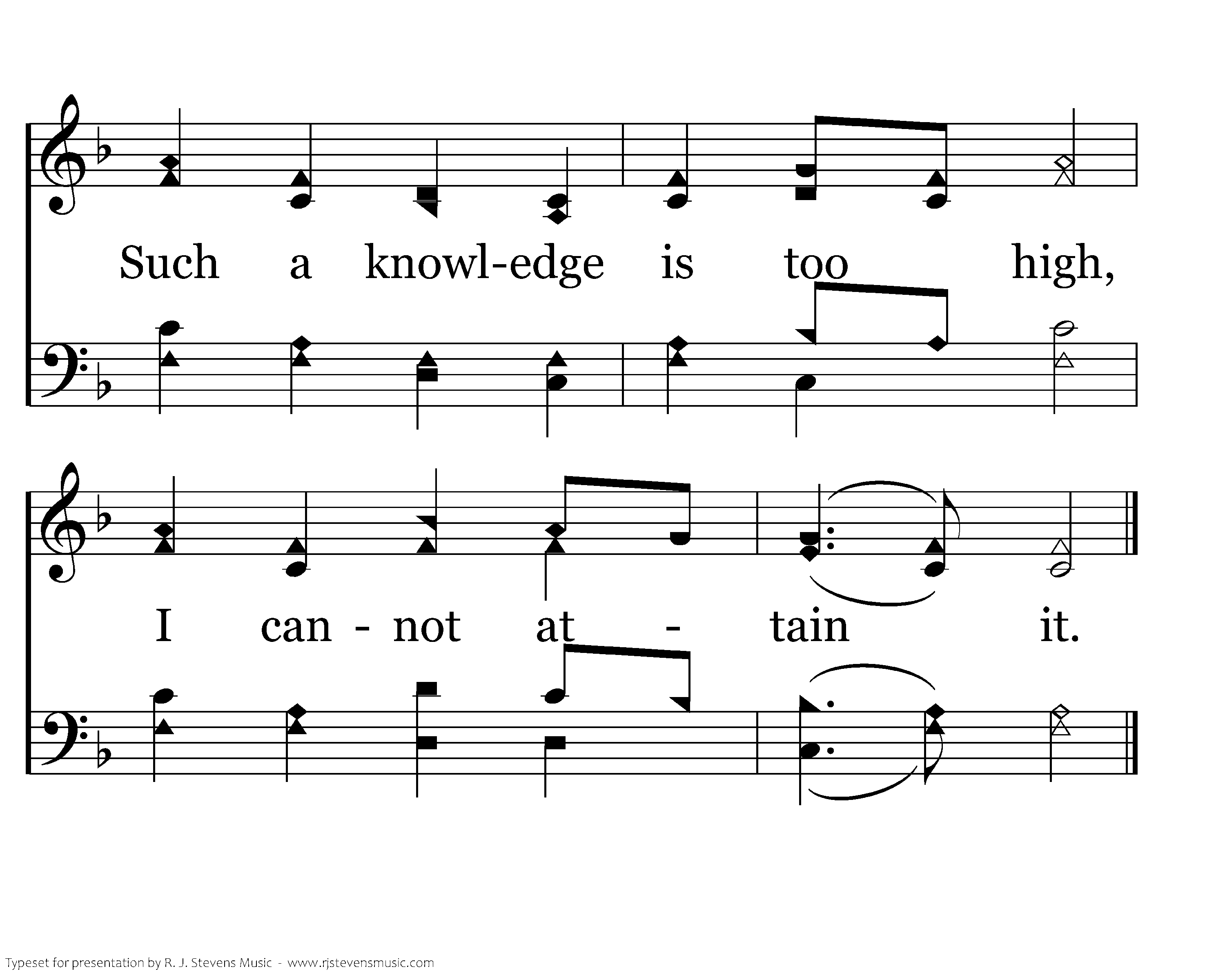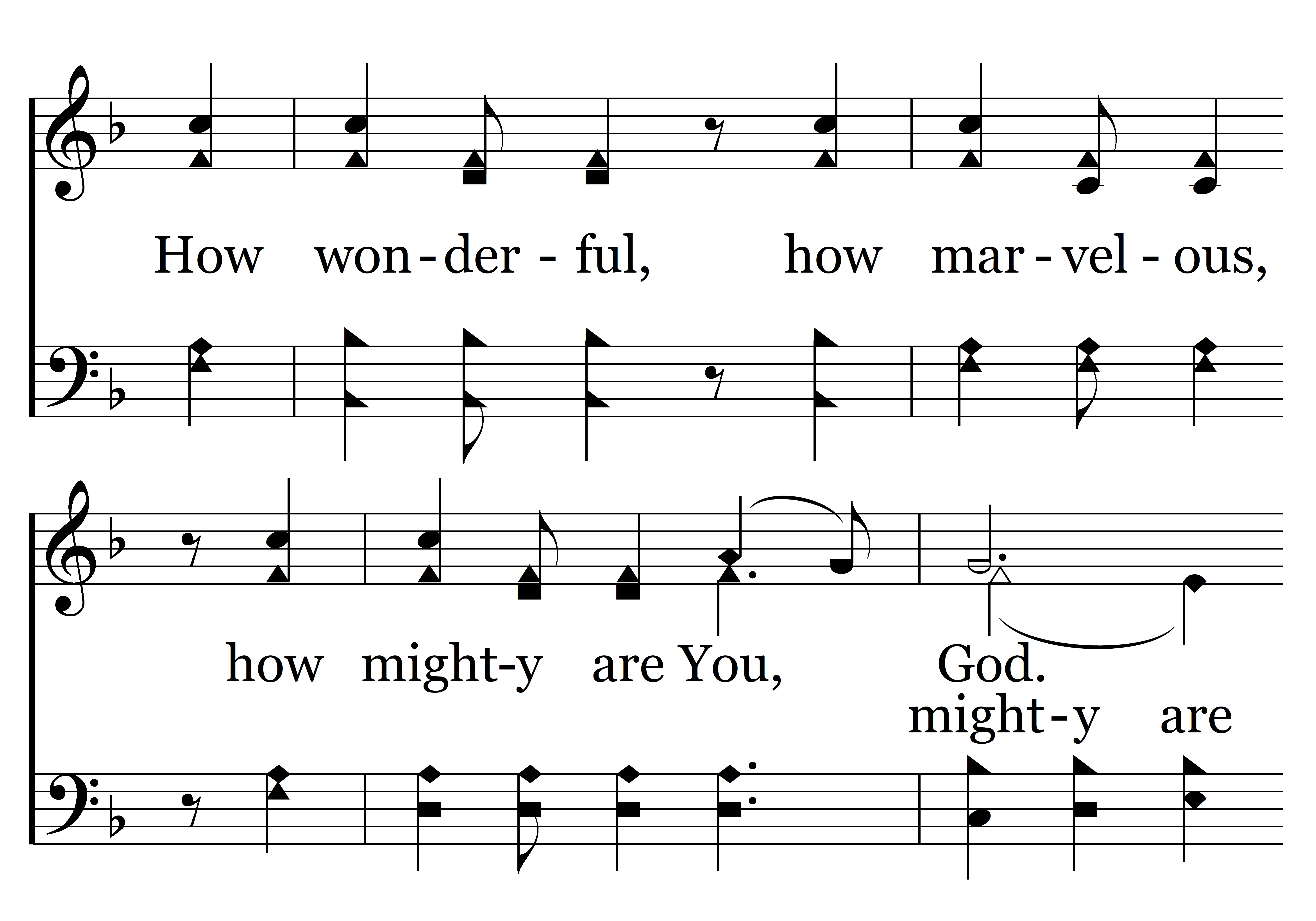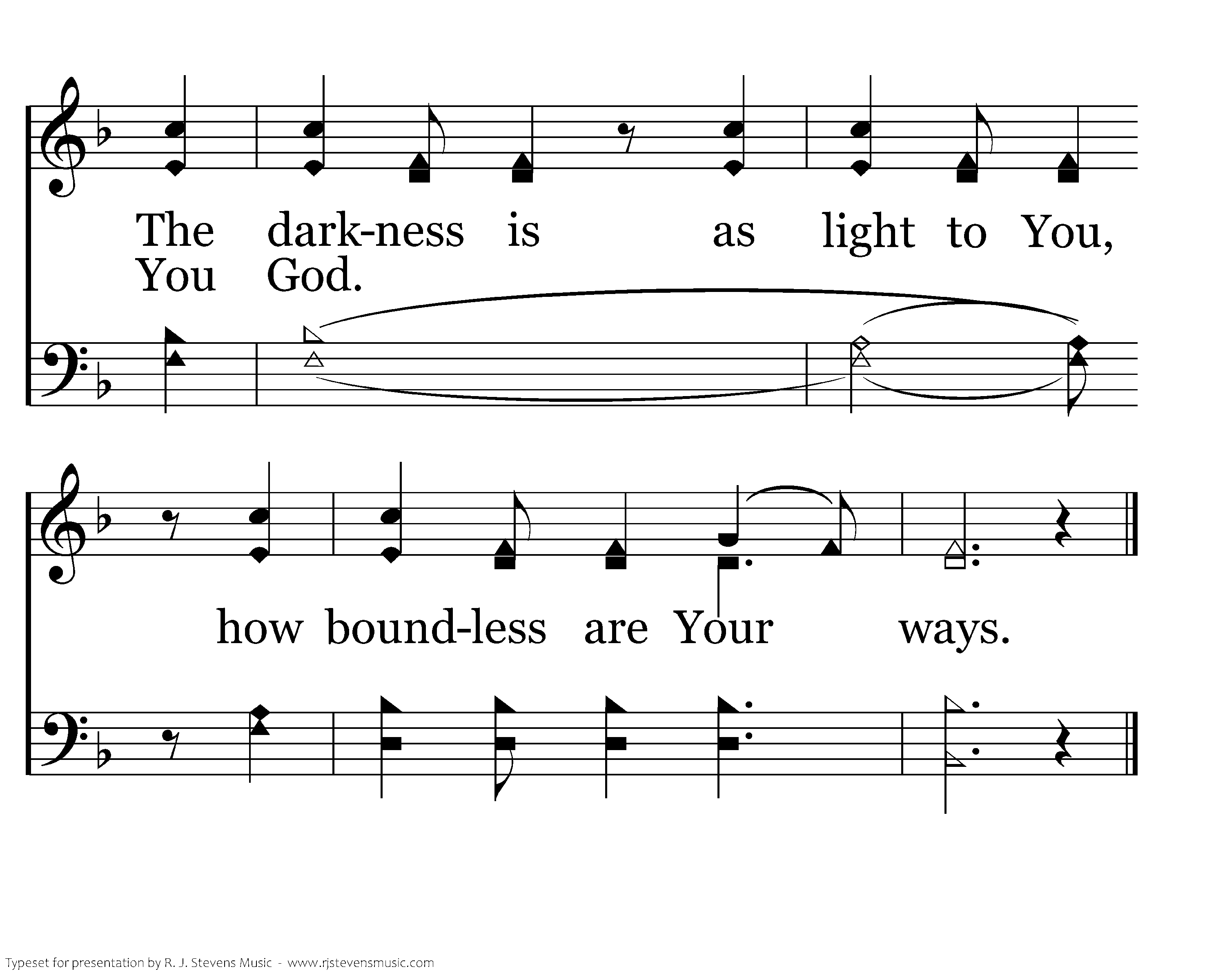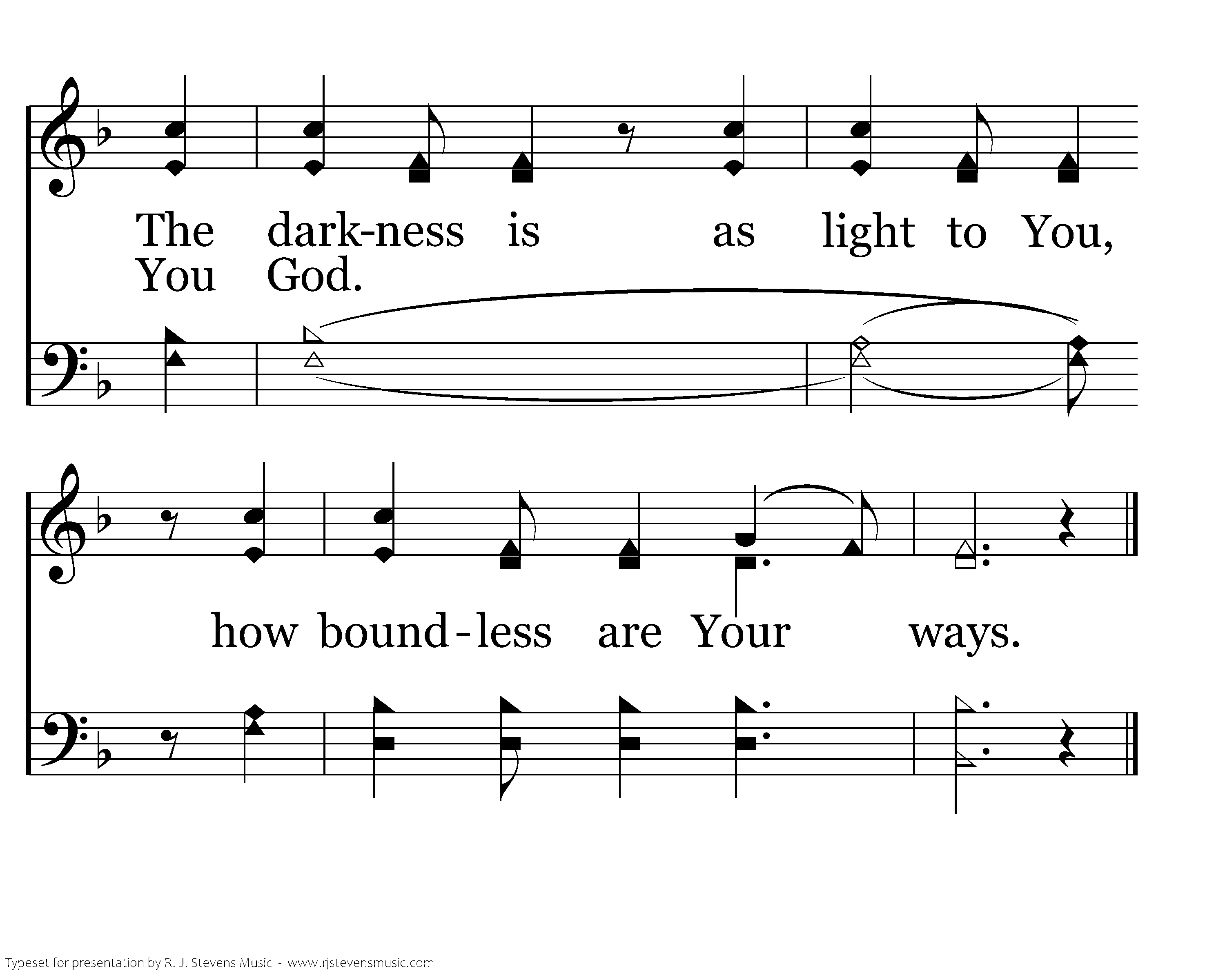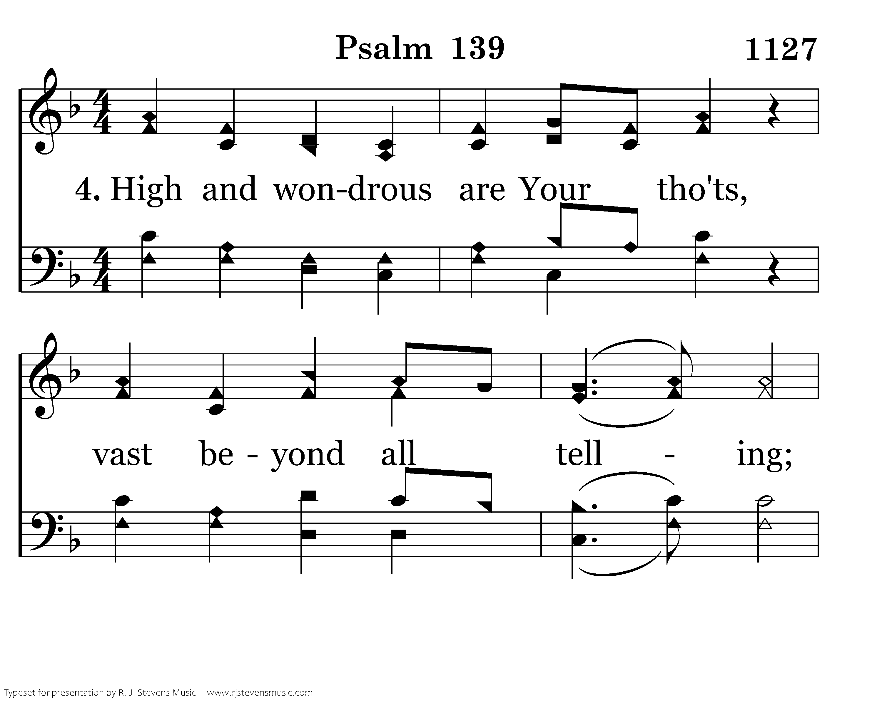 High and wondrous are Your tho'ts, vast beyond all telling; If I count them they grow more, I can never grasp them. Search me, God, and know my heart, let evil nev-er find me. Lead me on Your righteous path, How wonderful, how marvelous, how mighty are You, God. The darkness is as light to You, how boundless are Your ways.