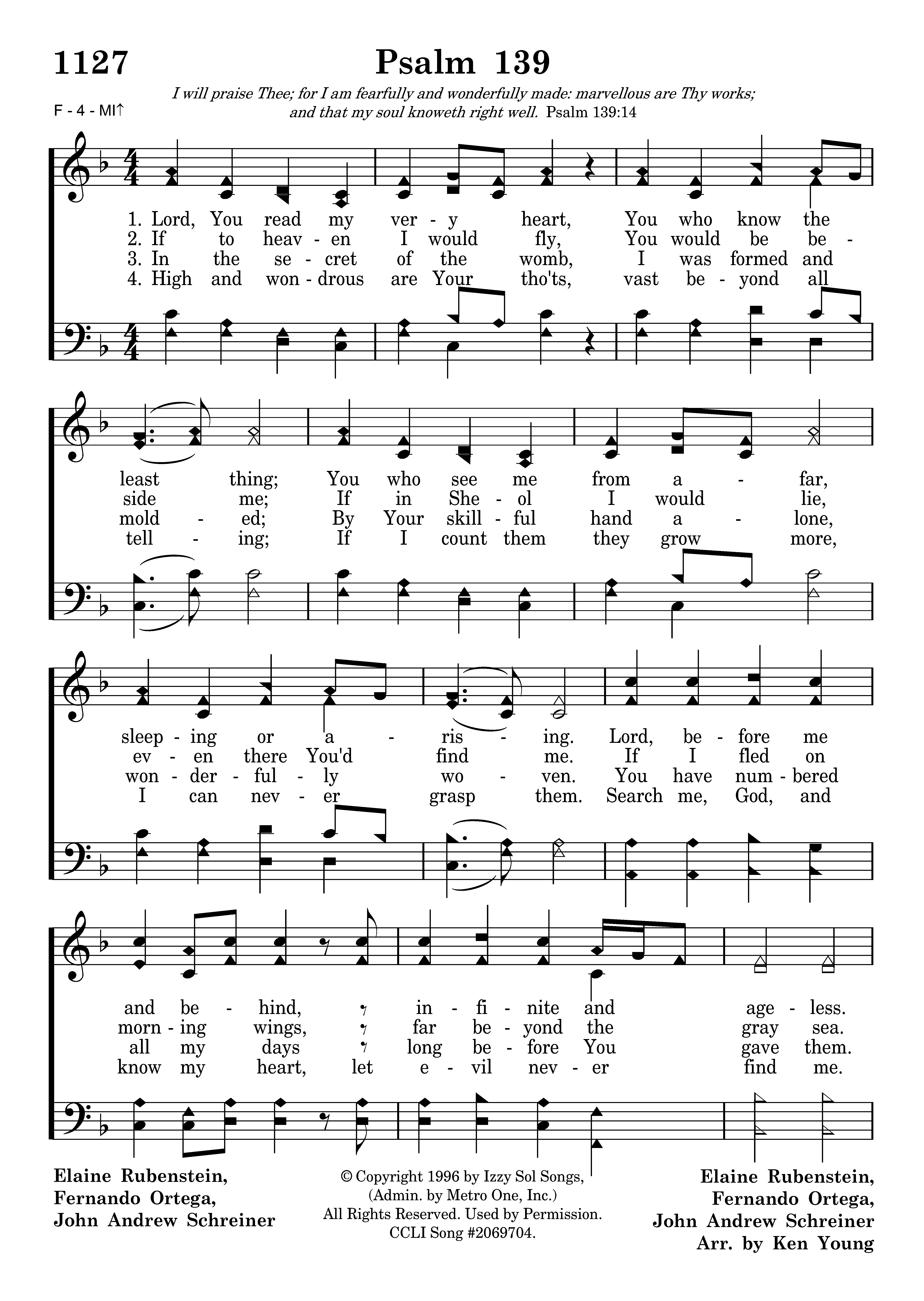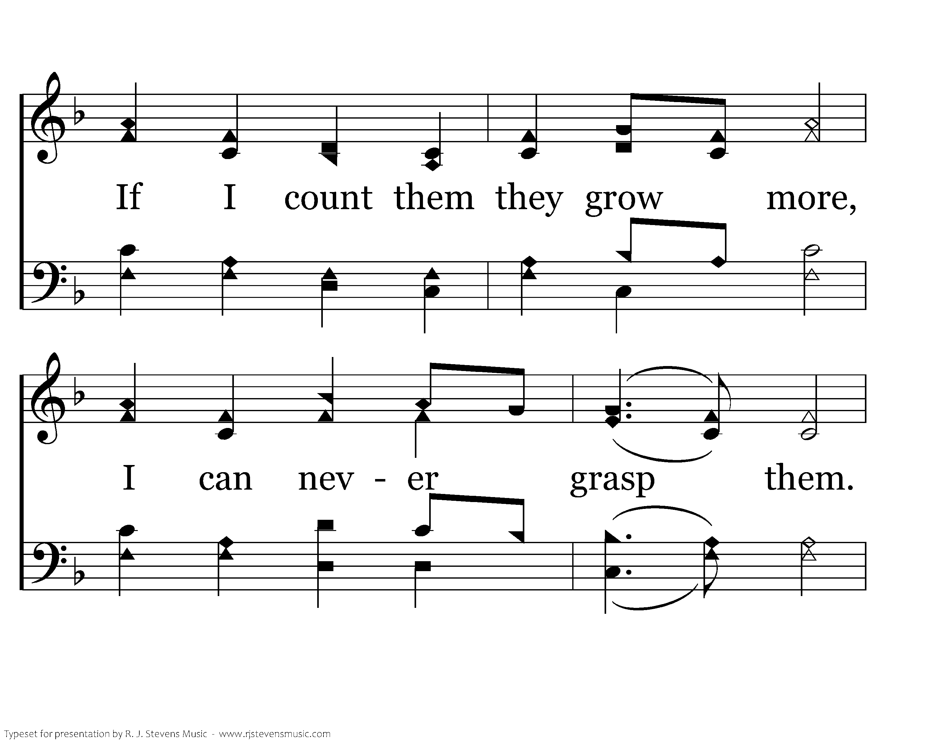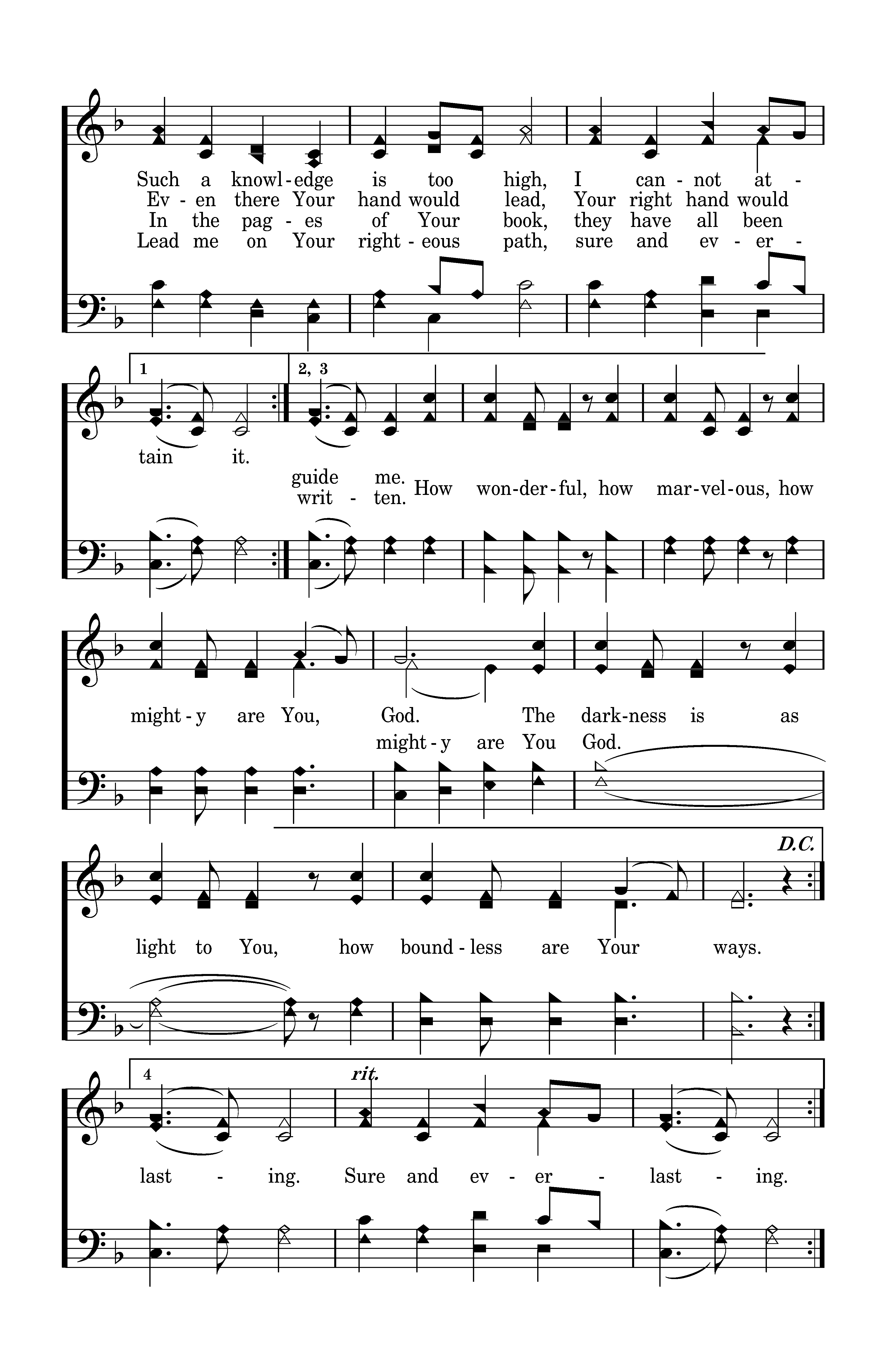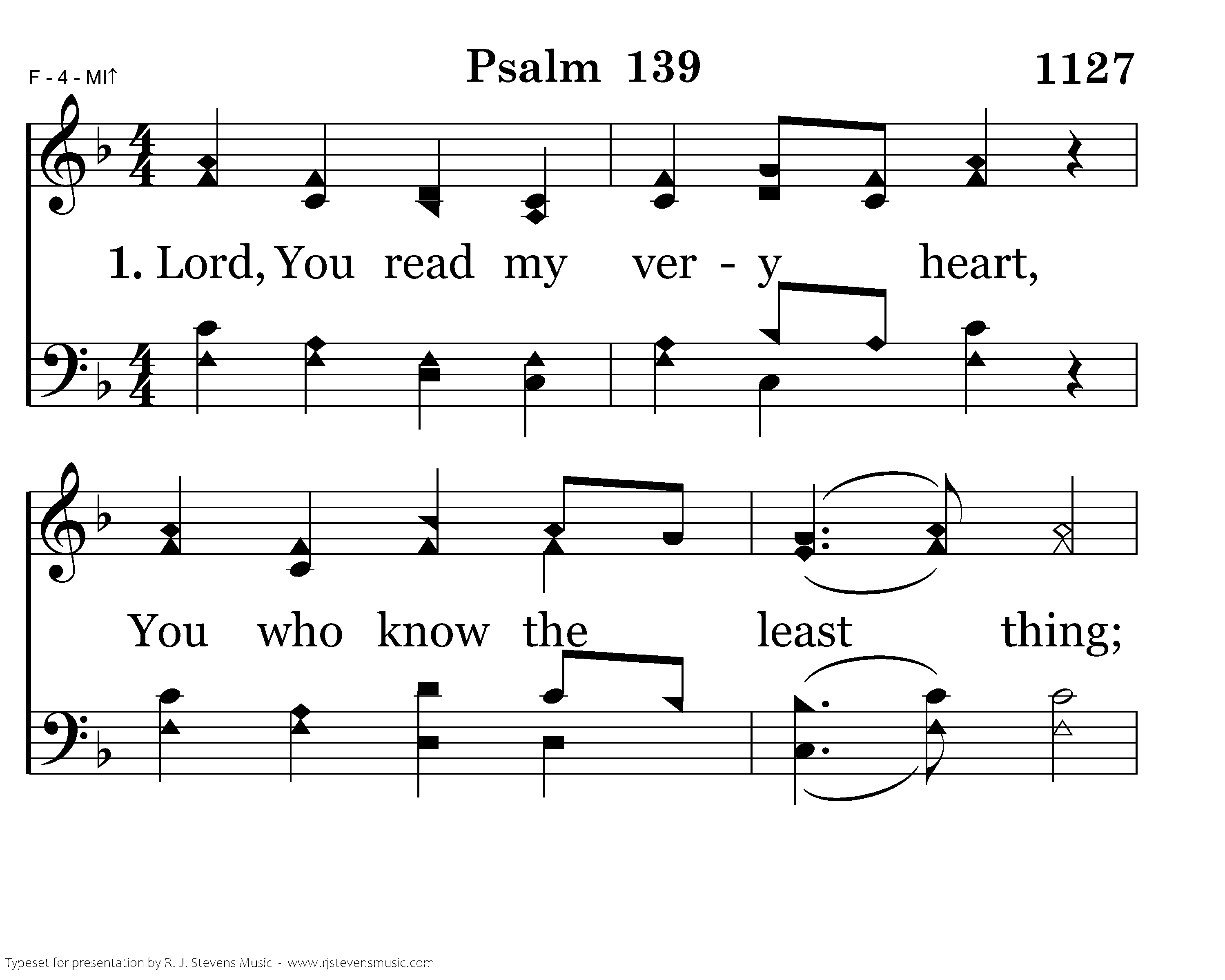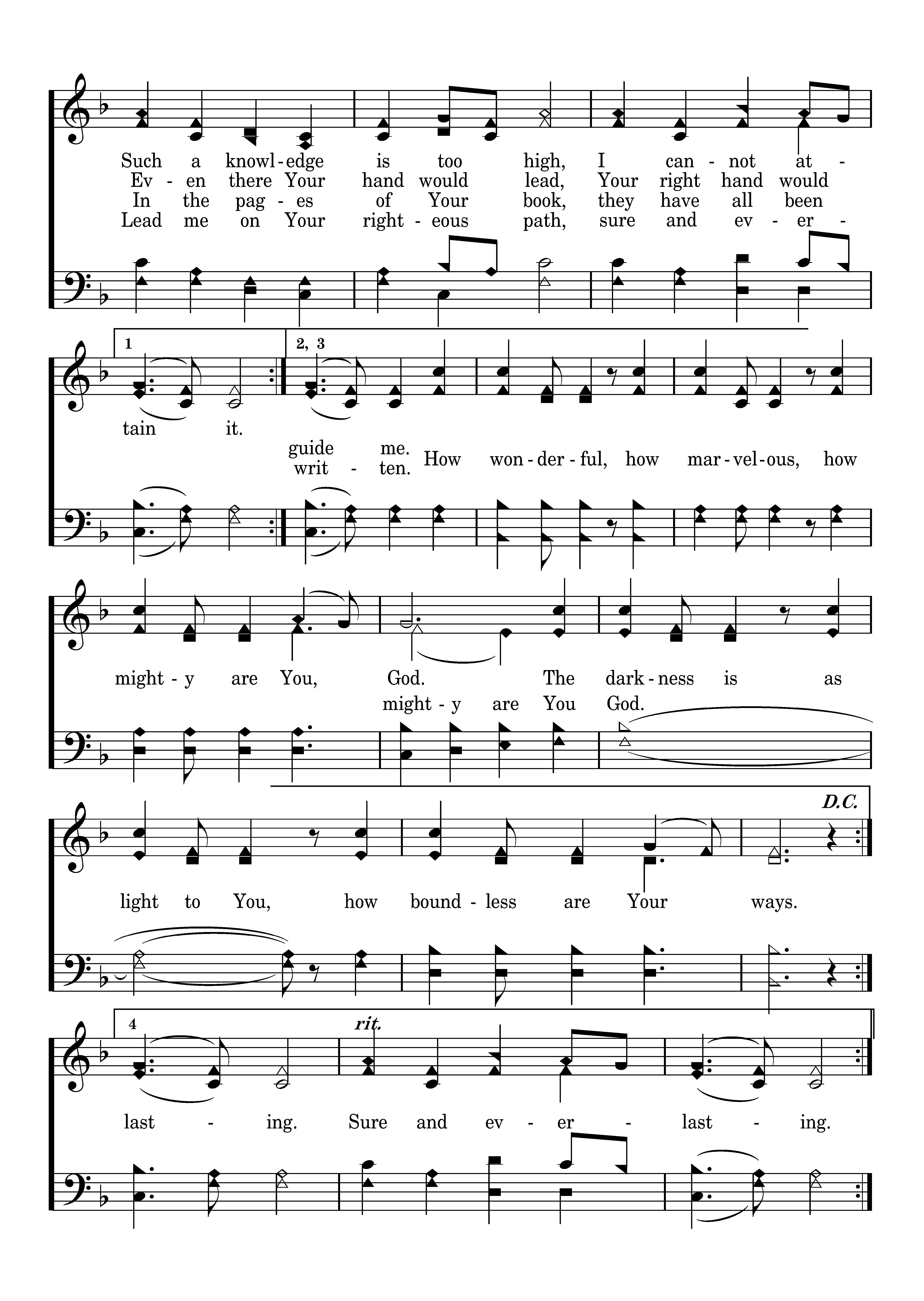 High and wondrous are Your tho'ts, vast beyond all telling; If I count them they grow more, I can never grasp them. Search me, God, and know my heart, let evil nev-er find me. Lead me on Your righteous path, How wonderful, how marvelous, how mighty are You, God. The darkness is as light to You, how boundless are Your ways.