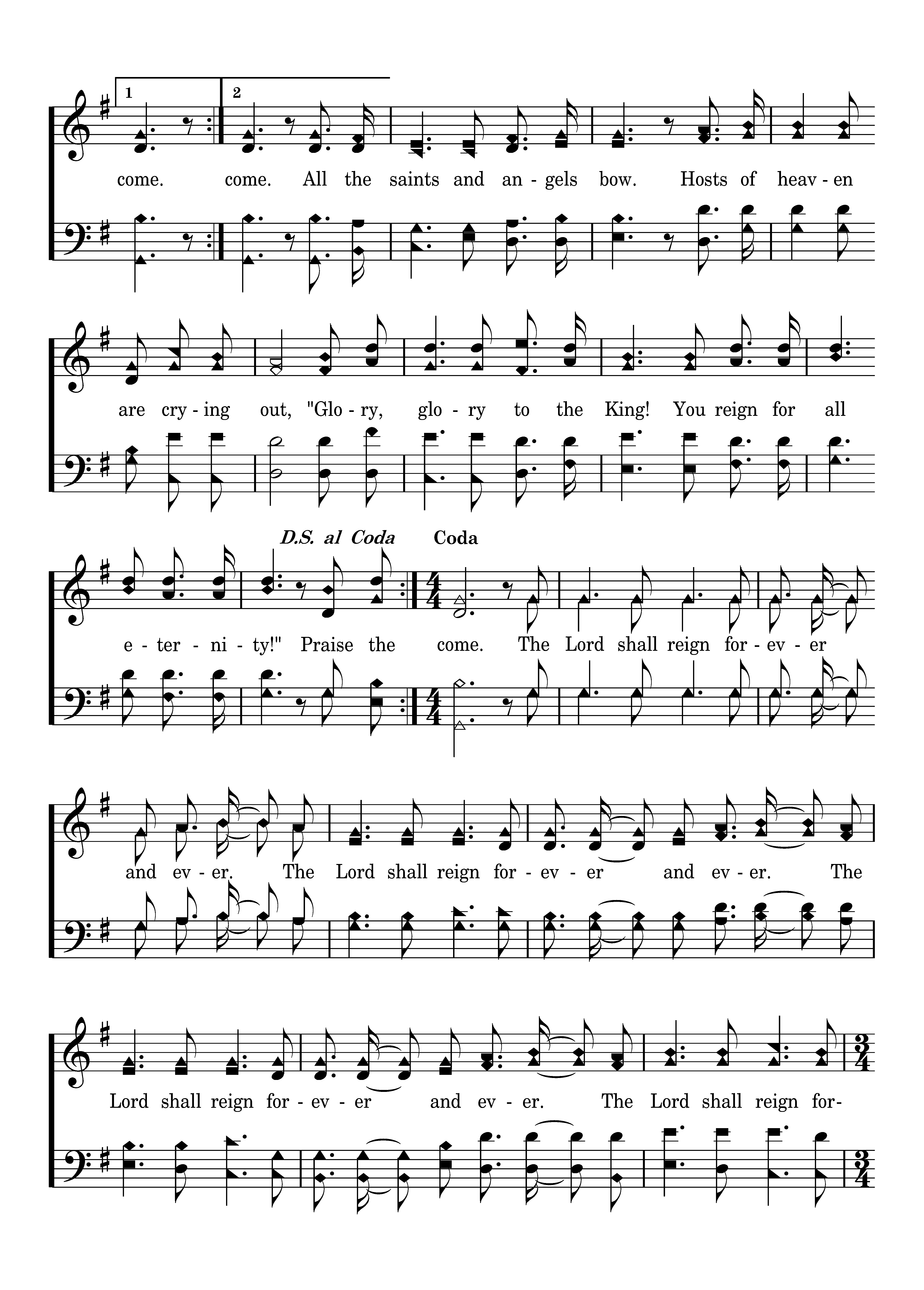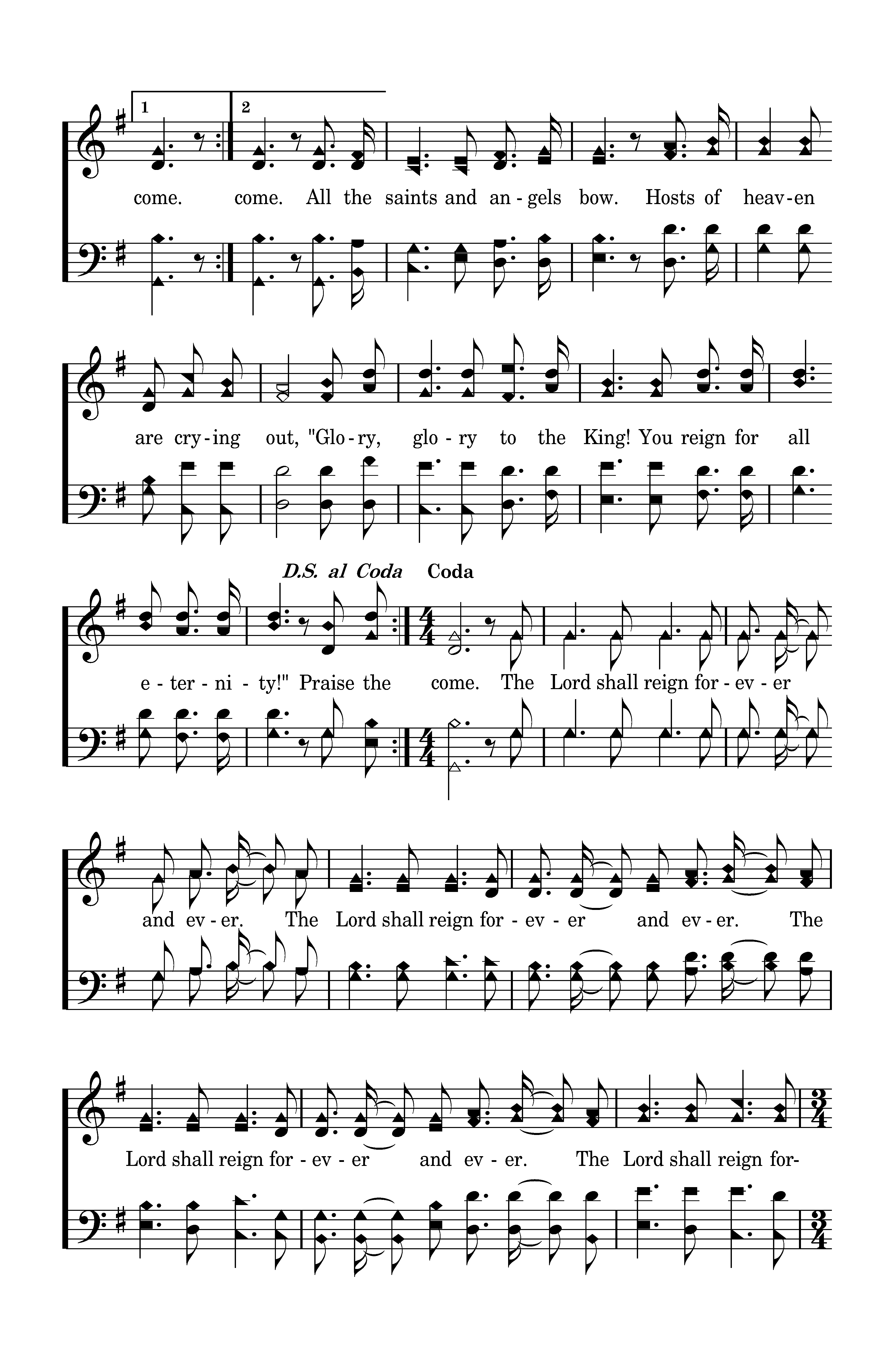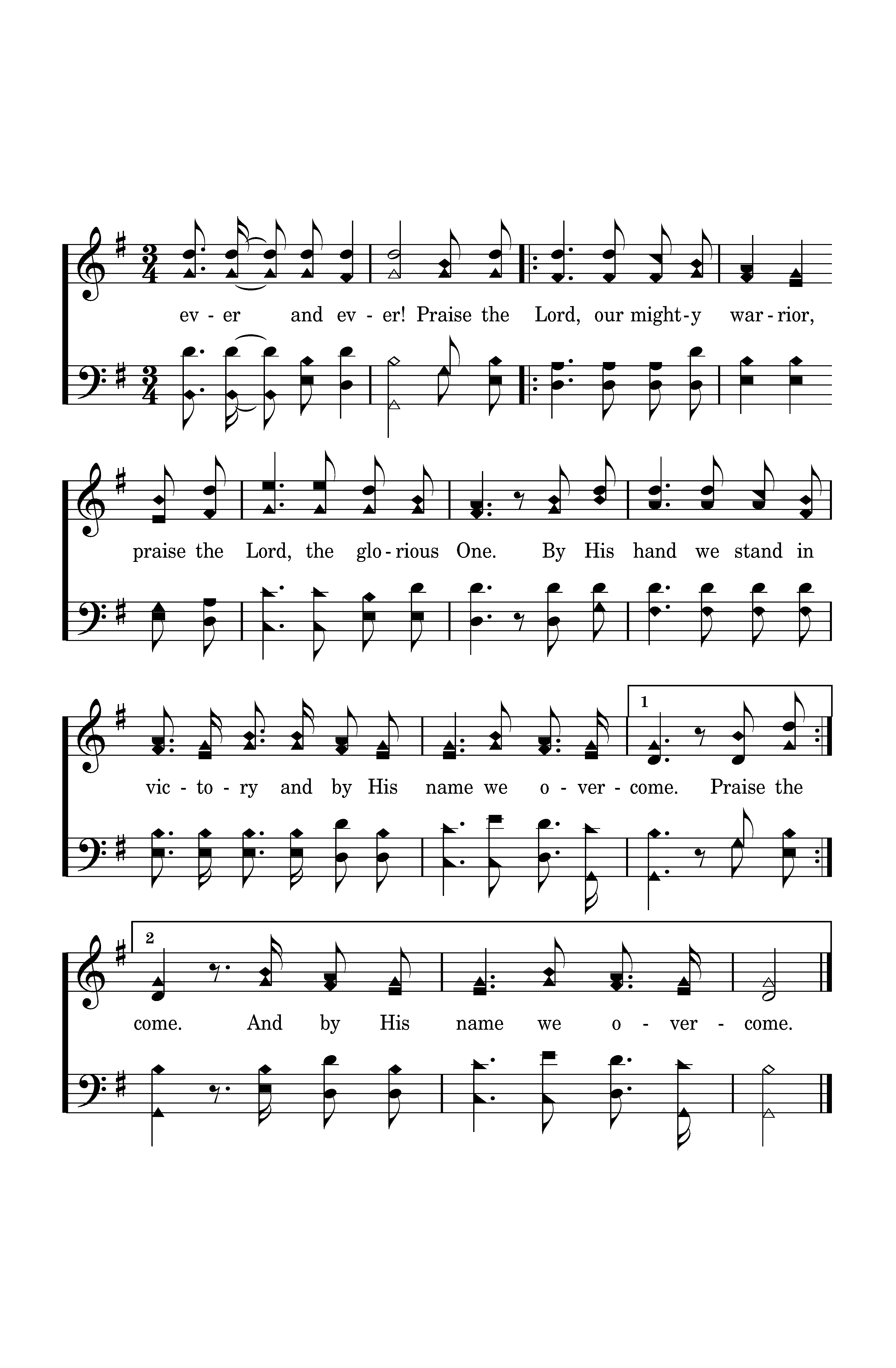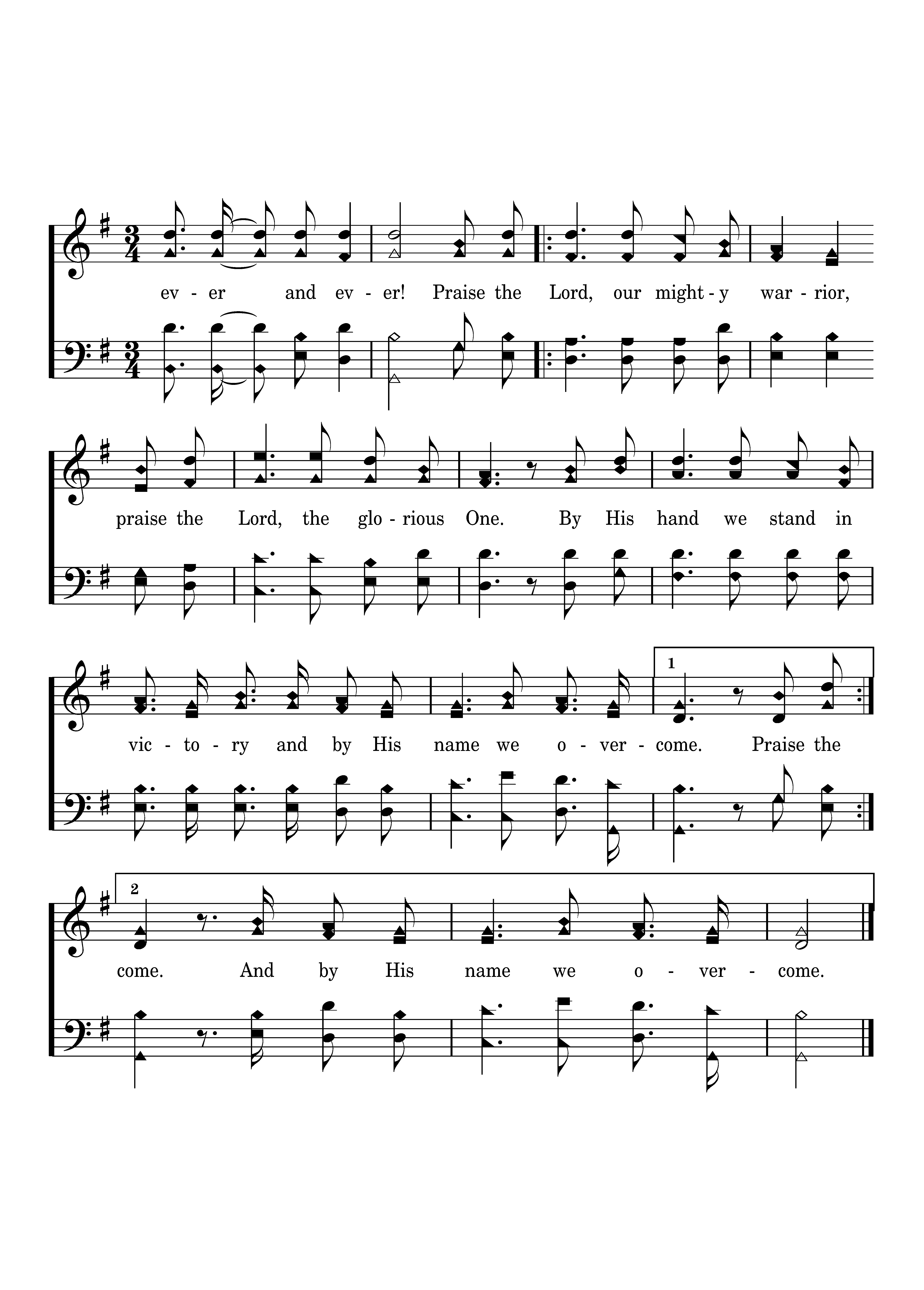 O the Lord, our strength and song, Highest praise to Him belongs; Christ the Lord, our conq'ring King, Your name we raise, Your triumphs sing. Praise the Lord, our mighty warrior, praise the Lord, the glorious One. By His hand we stand in victory and by His name we overcome. Tho' the storms of hell pursue, in darkest night, we worship You. You divide the raging sea. From death to life, You safely lead. Praise the Lord, our mighty warrior, praise the Lord, the glorious One. By His hand we stand in victory and by His name we overcome. All the saints and angels bow. Hosts of heaven are crying out, "Glory, glory to the King! You reign for all eternity!" The Lord shall reign forever and ever. The Lord shall reign forever and ever. The Lord shall reign forever and ever. The Lord shall reign forever and ever.