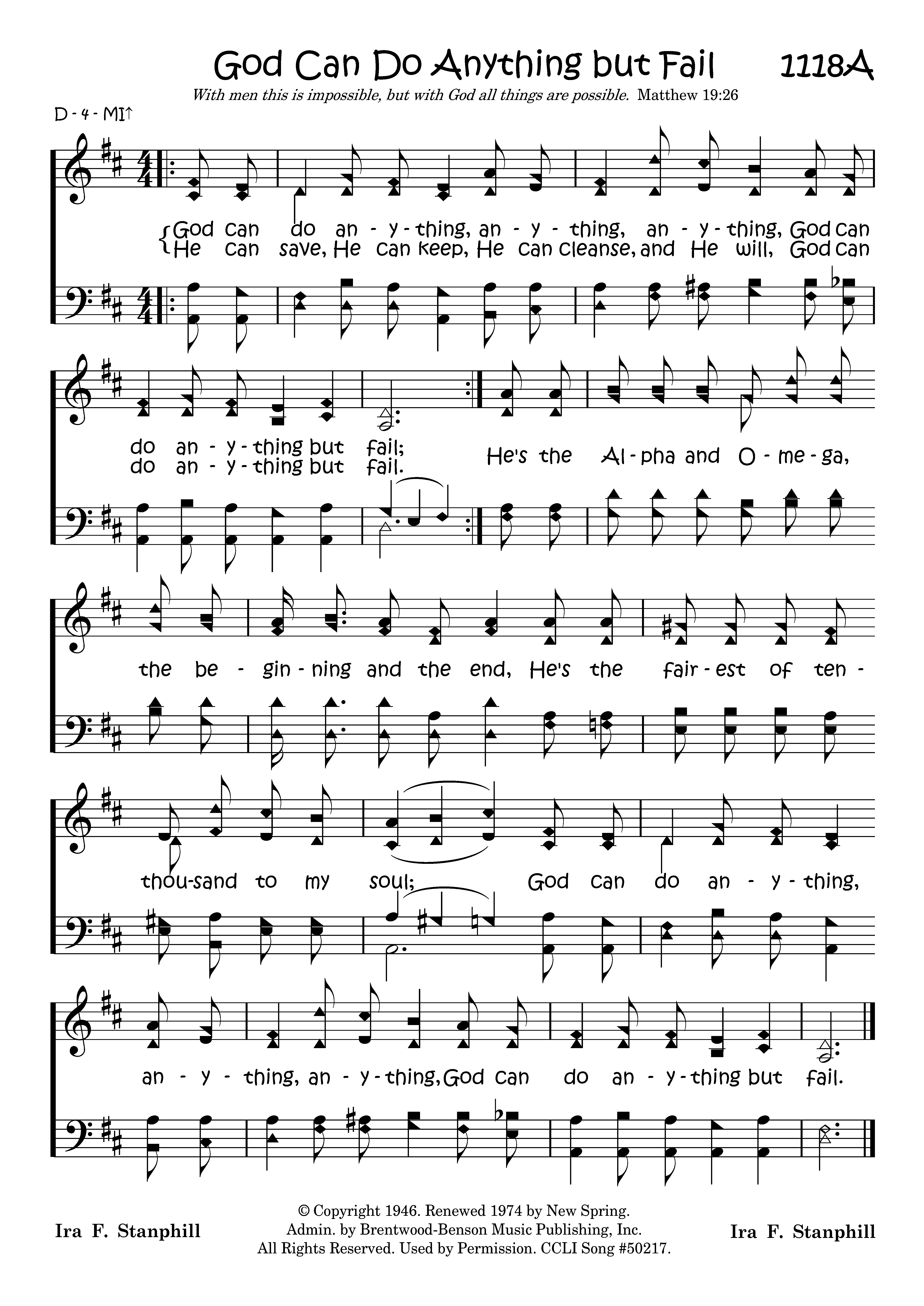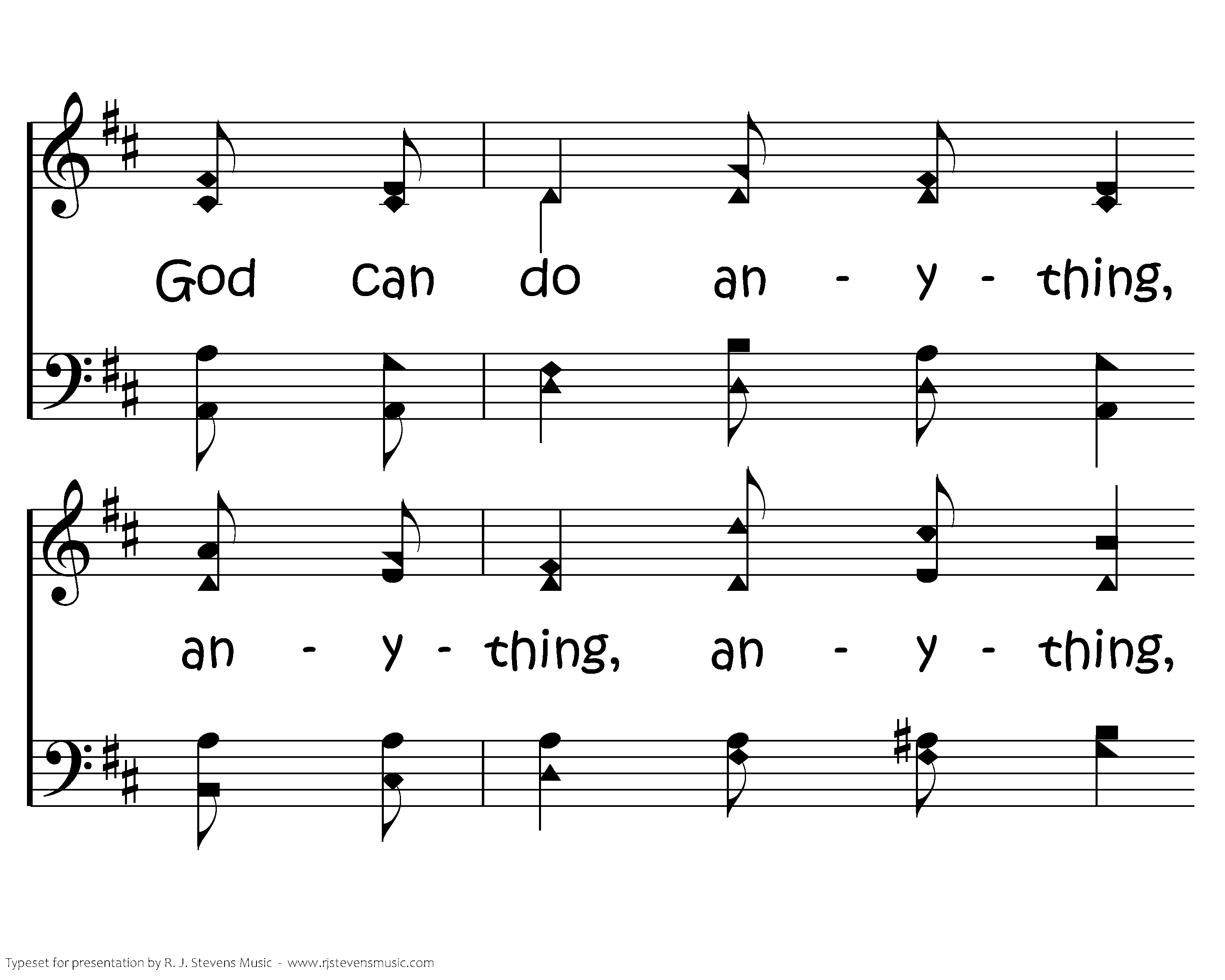 God can do anything, anything, anything, God can do anything but fail; He can save, He can keep, He can cleanse, and He will, God can do anything but fail. He's the Alpha and Omega, the beginning and the end, He's the fairest of tenthousand to my soul; God can do anything, anything, anything, God can do anything but fail.