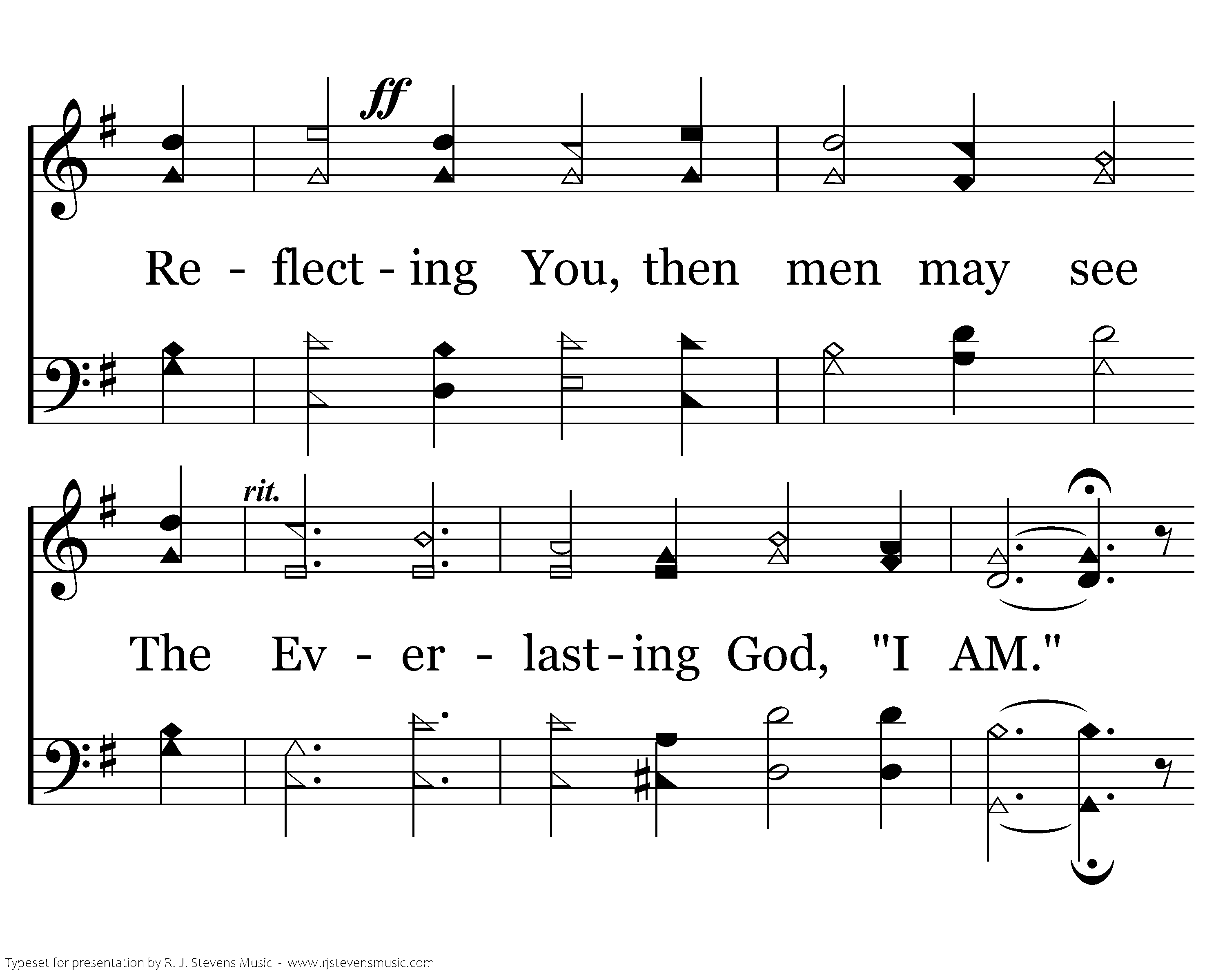Created in Your righteousness and made to glorify Your name. Transformed to live in holiness to be presented without blame. Your radiance then shines forth in us and all made perfect by the Lamb. Reflecting You, then men may see The Everlasting God, "I AM." O God, be glorified in me.