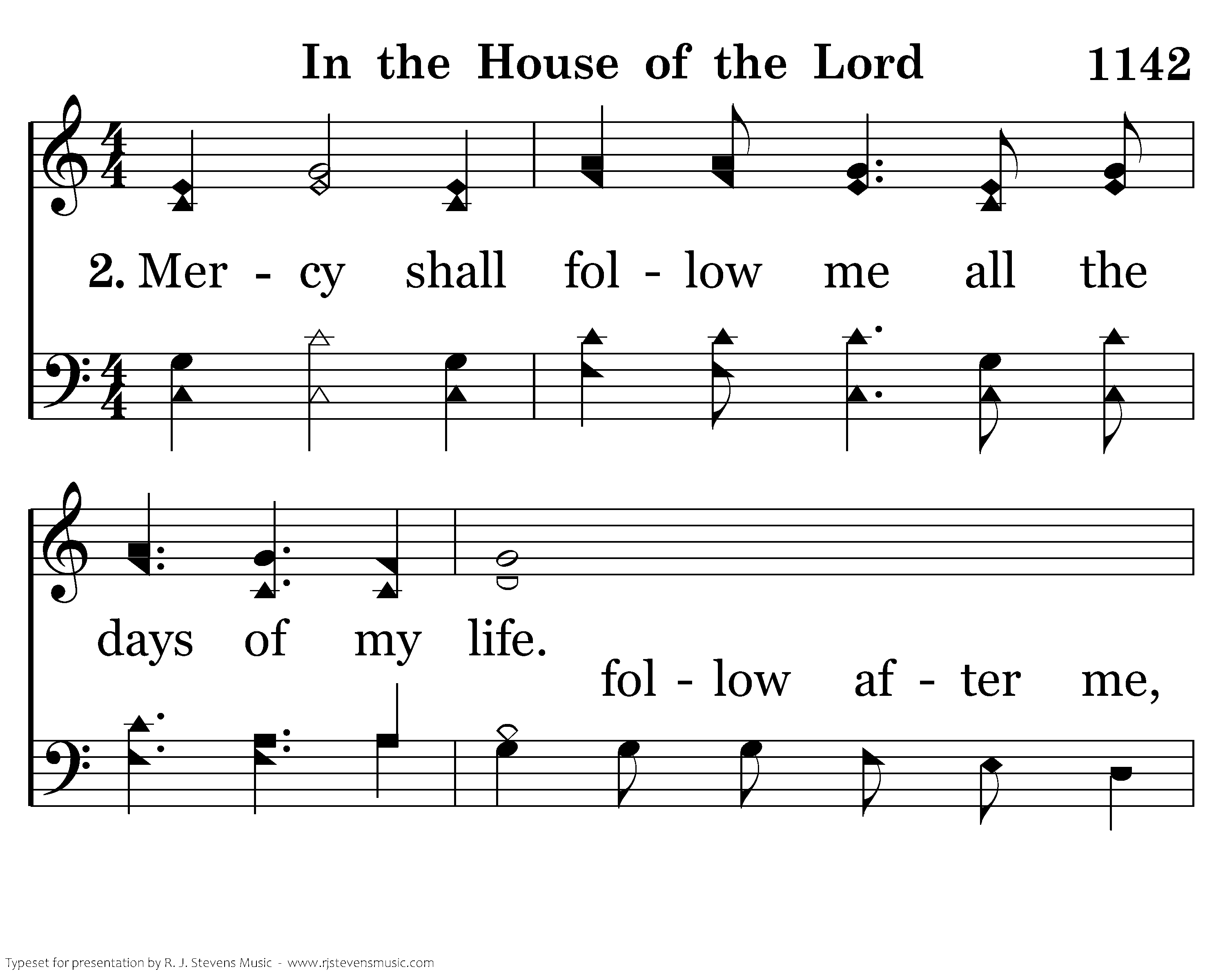 Mercy shall follow me all the days of my life. Mercy shall follow me all the days of my life. And I shall dwell, And I shall dwell, And I shall dwell, And I shall dwell in the house, I shall dwell in the house of the Lord forevermore. I will dwell in the house of the Lord, evermore.