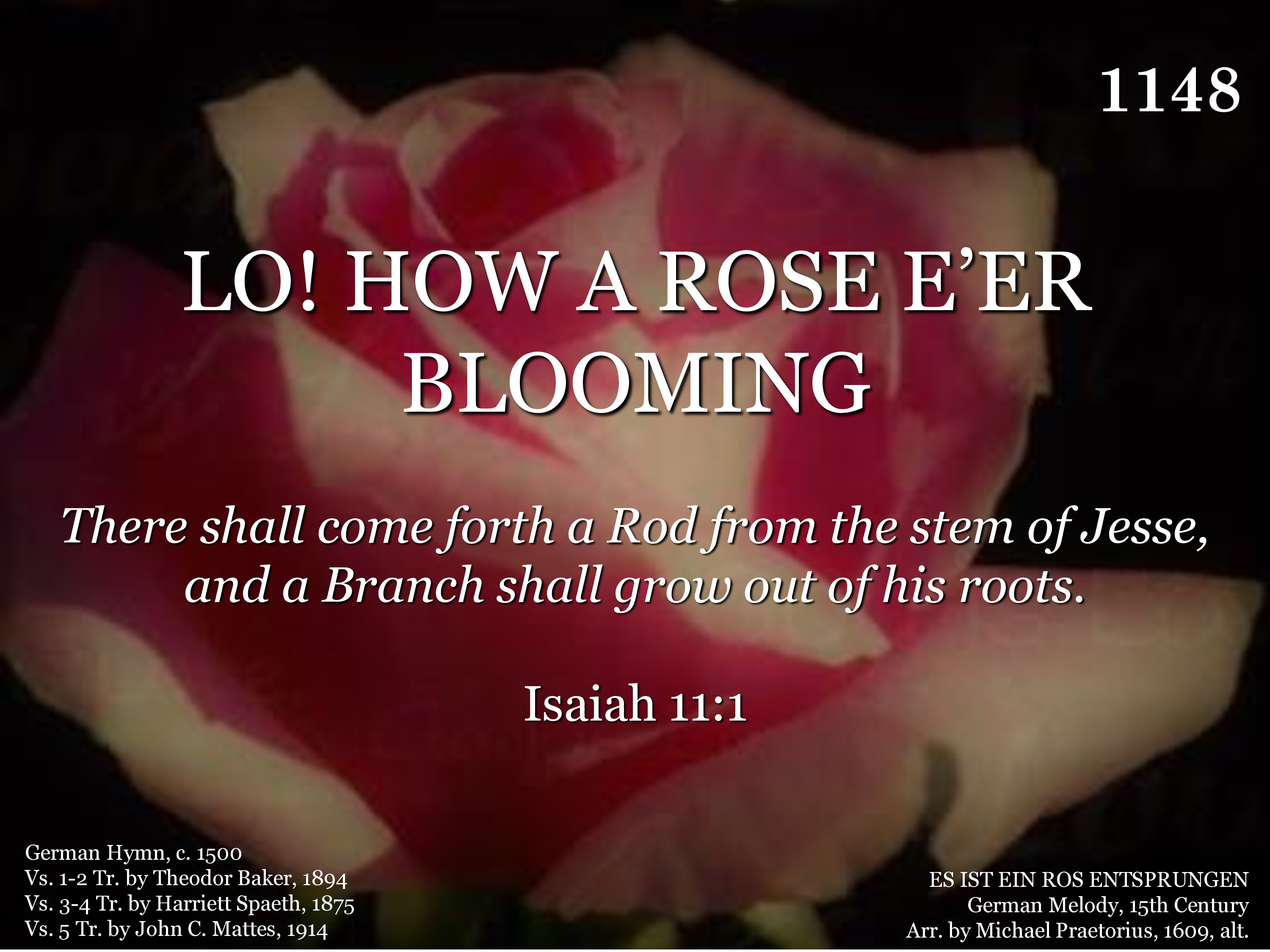 Lo! How a rose e'er blooming From tender stem has sprung, Of Jesse's lineage coming As saints of old have sung. Proclaimed by angels bright: How Christ, the Lord of glory Was born on earth this night.