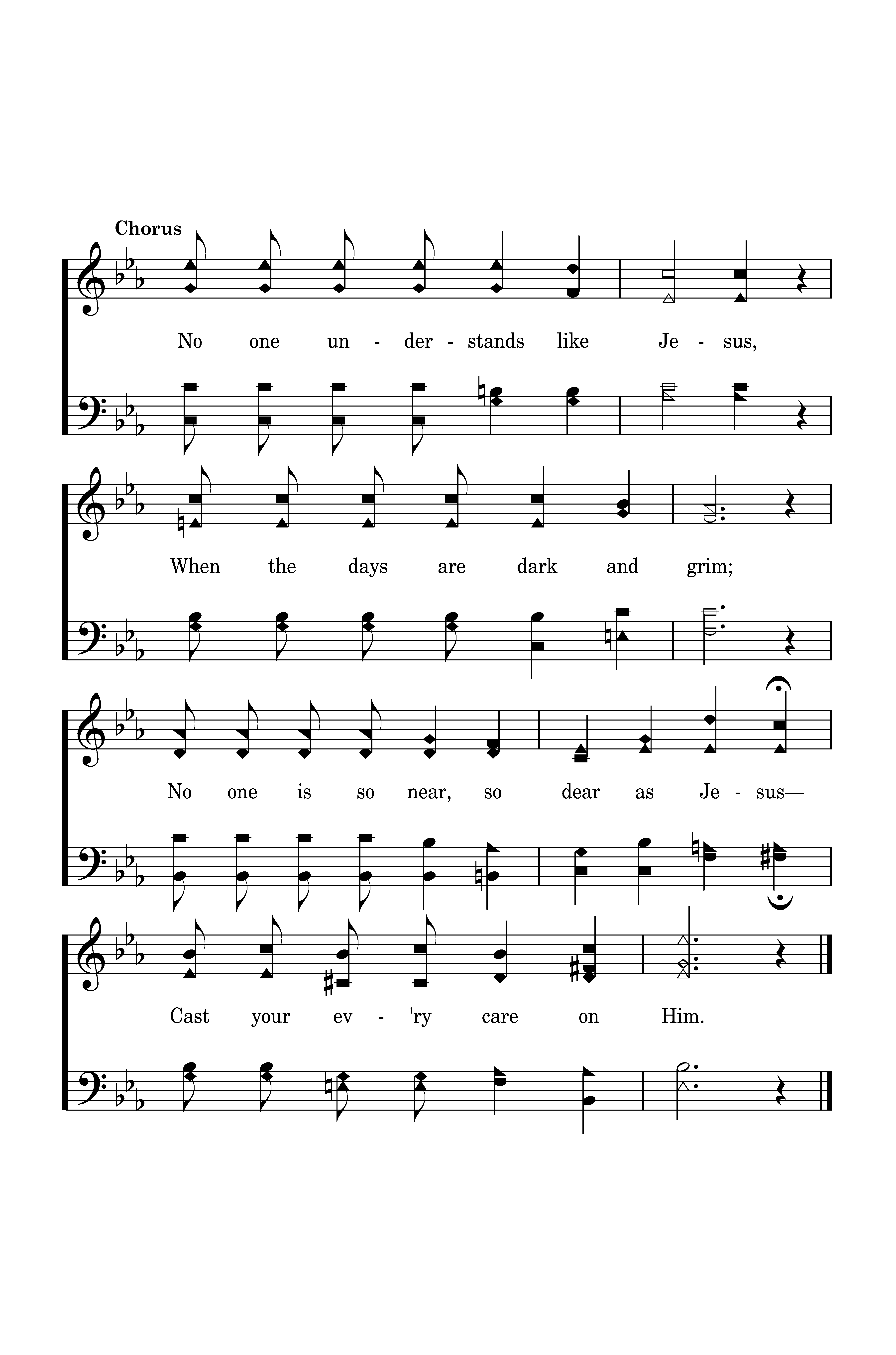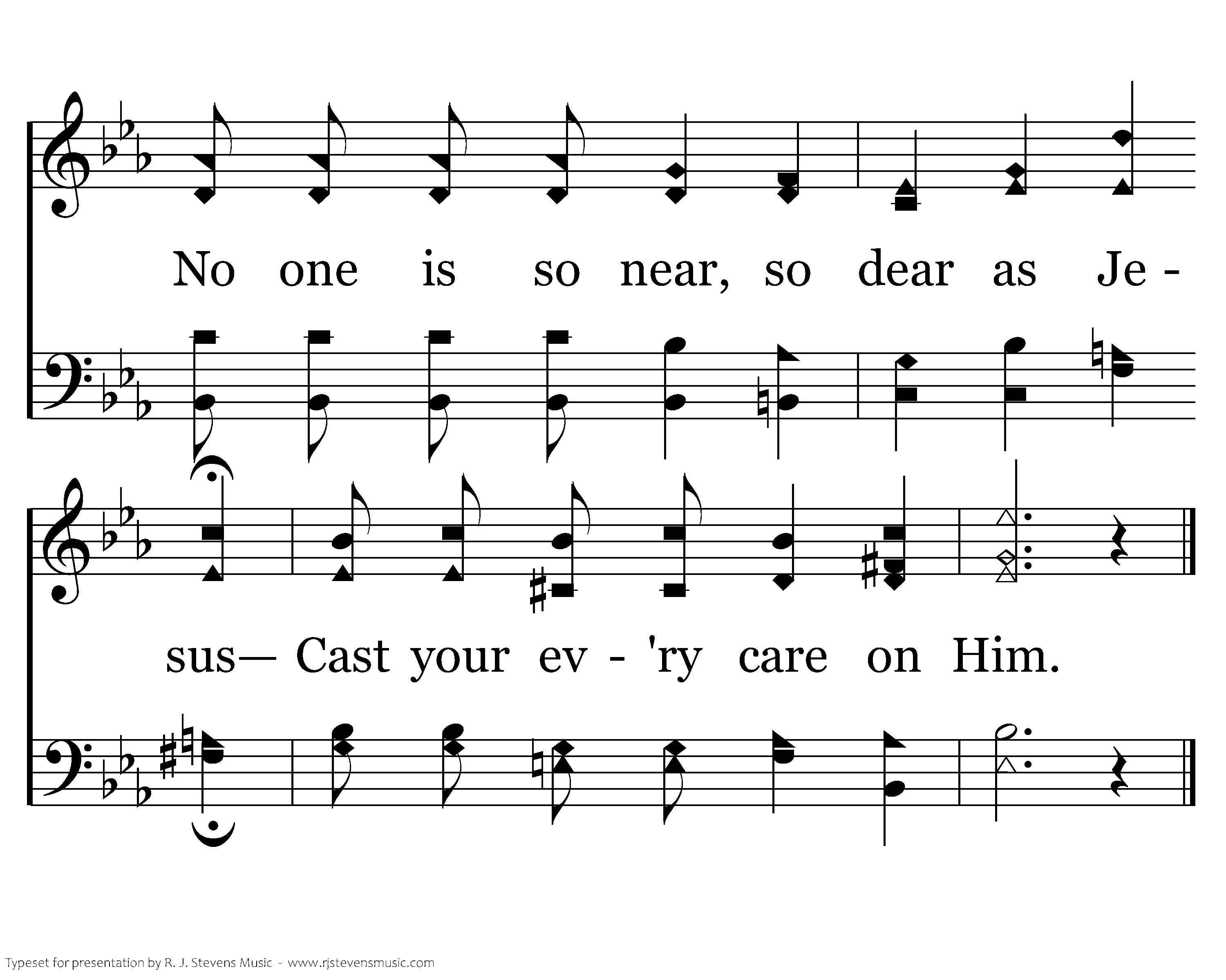 No one understands like Jesus, When the days are dark and grim; No one is so near, so dear as Je-sus Cast your ev'ry care on Him.