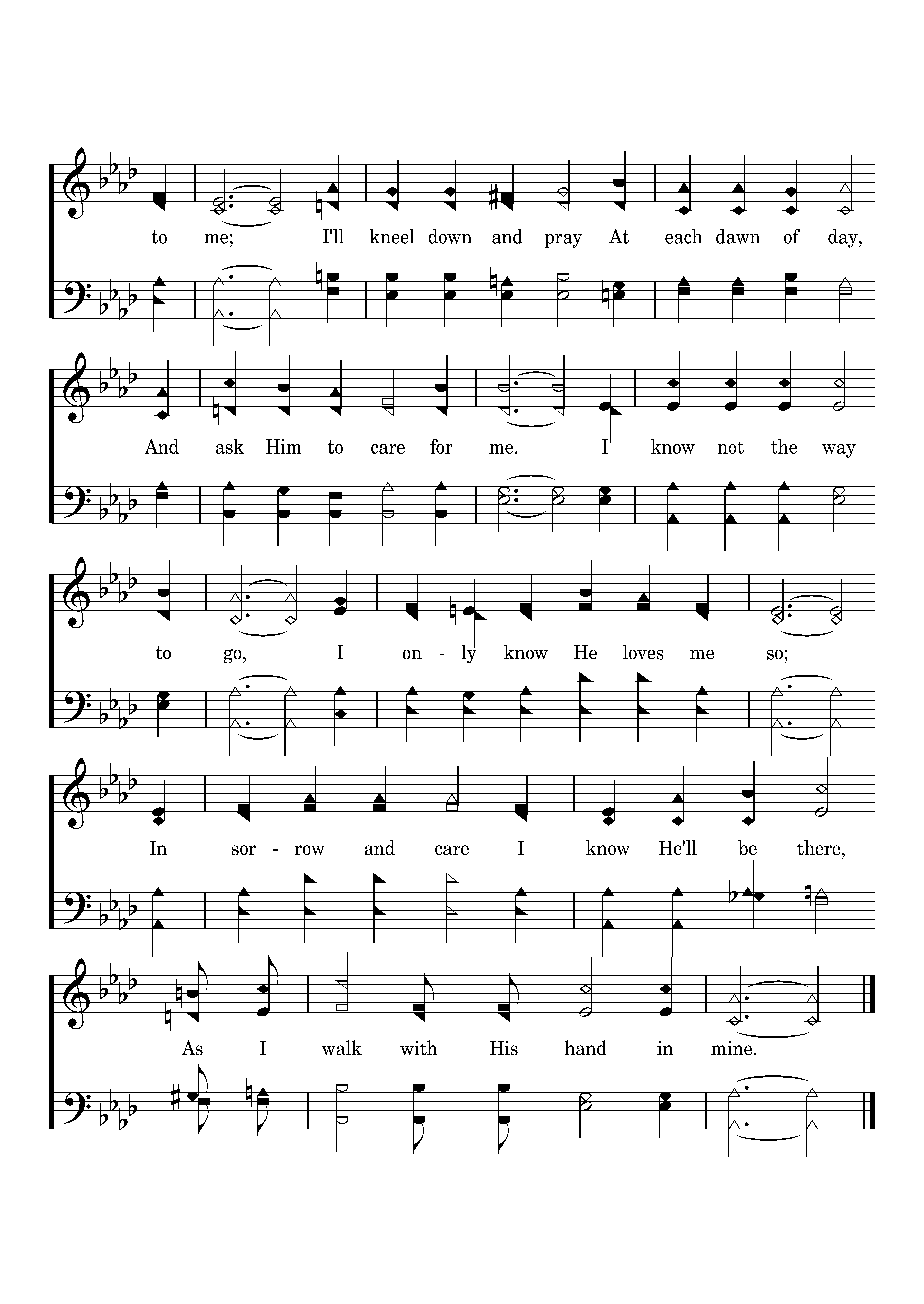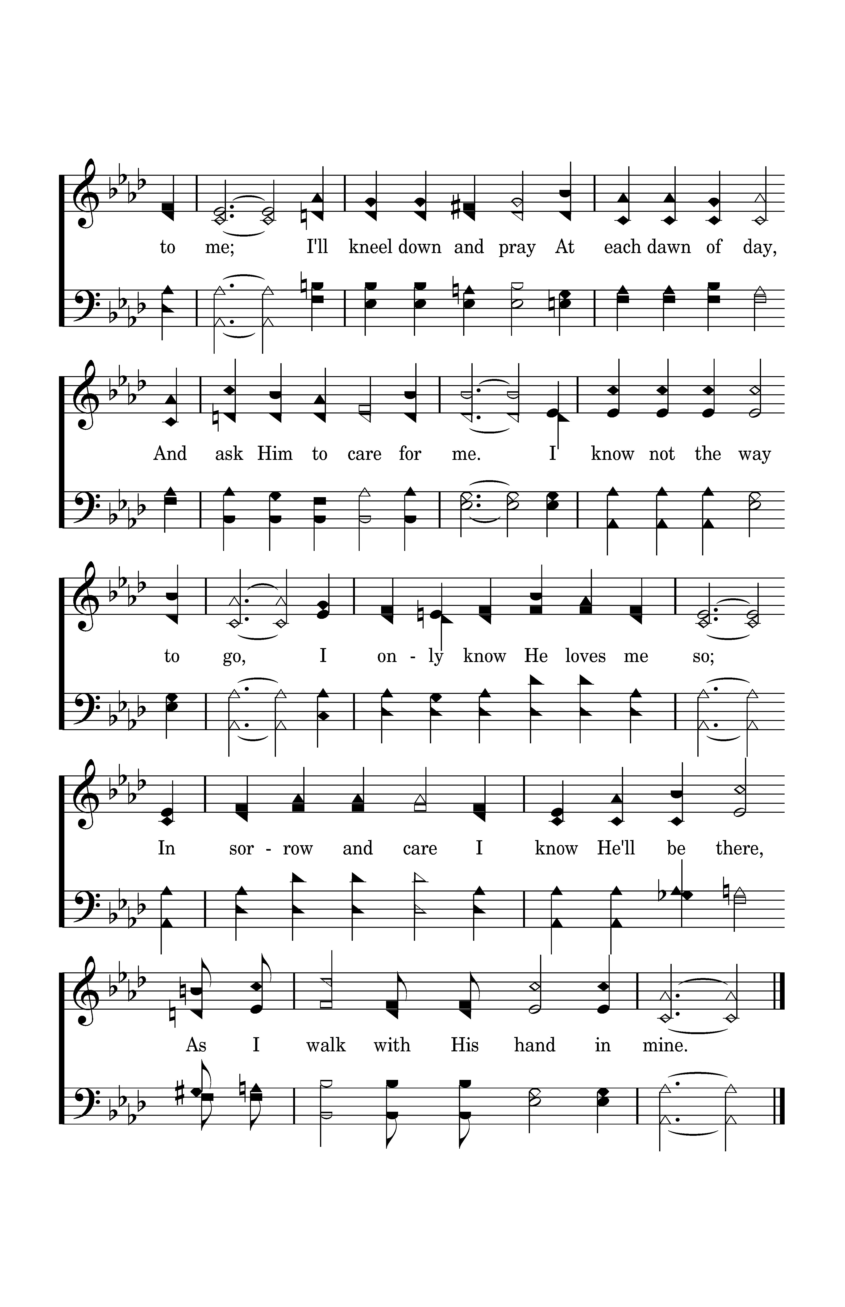 I walk with His hand in mine, For each day's a stranger to me; I'll kneel down and pray At each dawn of day, And ask Him to care for me. I know not the way to go, I only know He loves me so; In sorrow and care I know He'll be there, As I walk with His hand in mine.