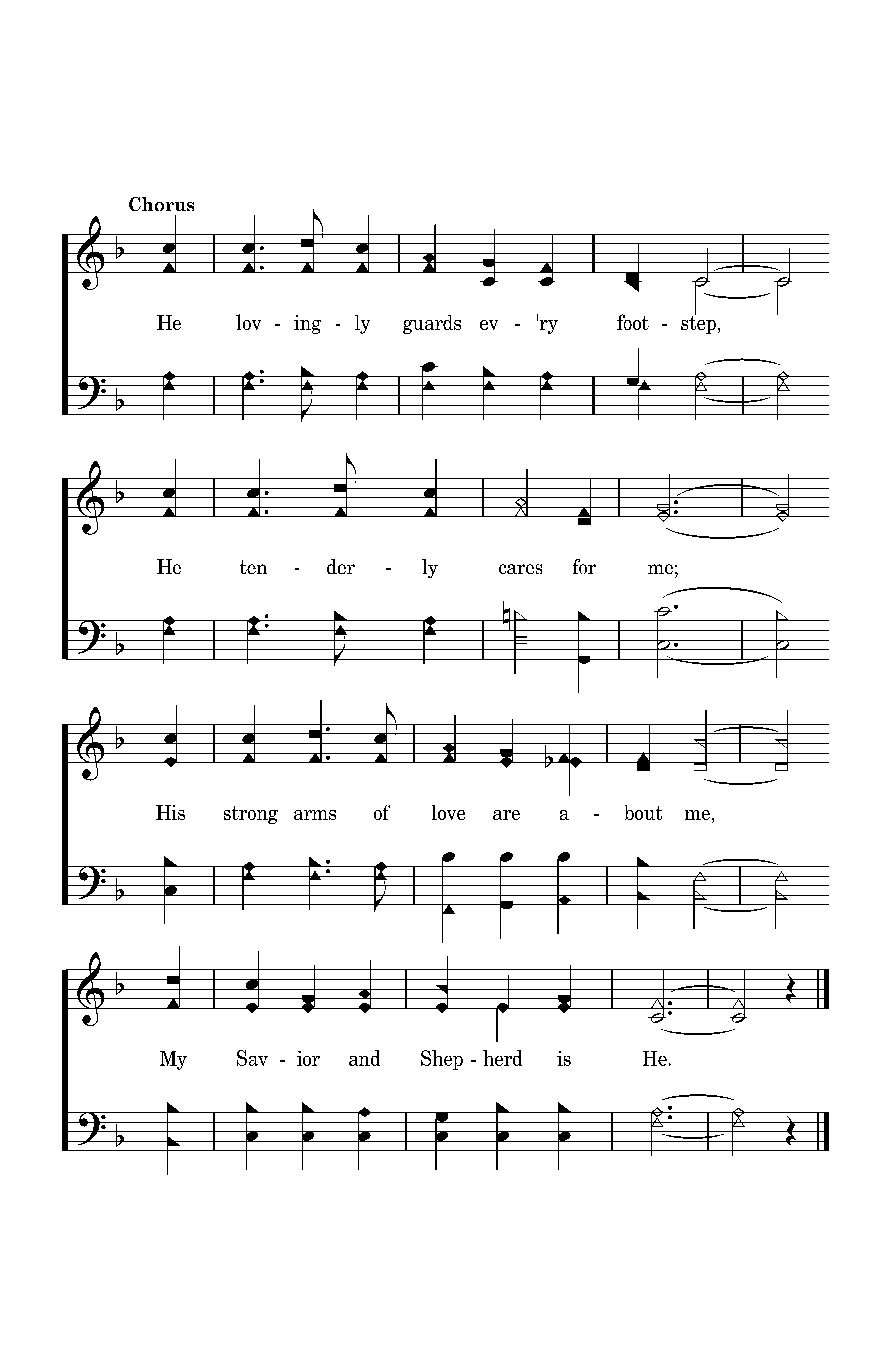 He lovingly guards ev'ry footstep, He tenderly cares for me; His strong arms of love are about me, My Savior and Shepherd is He.