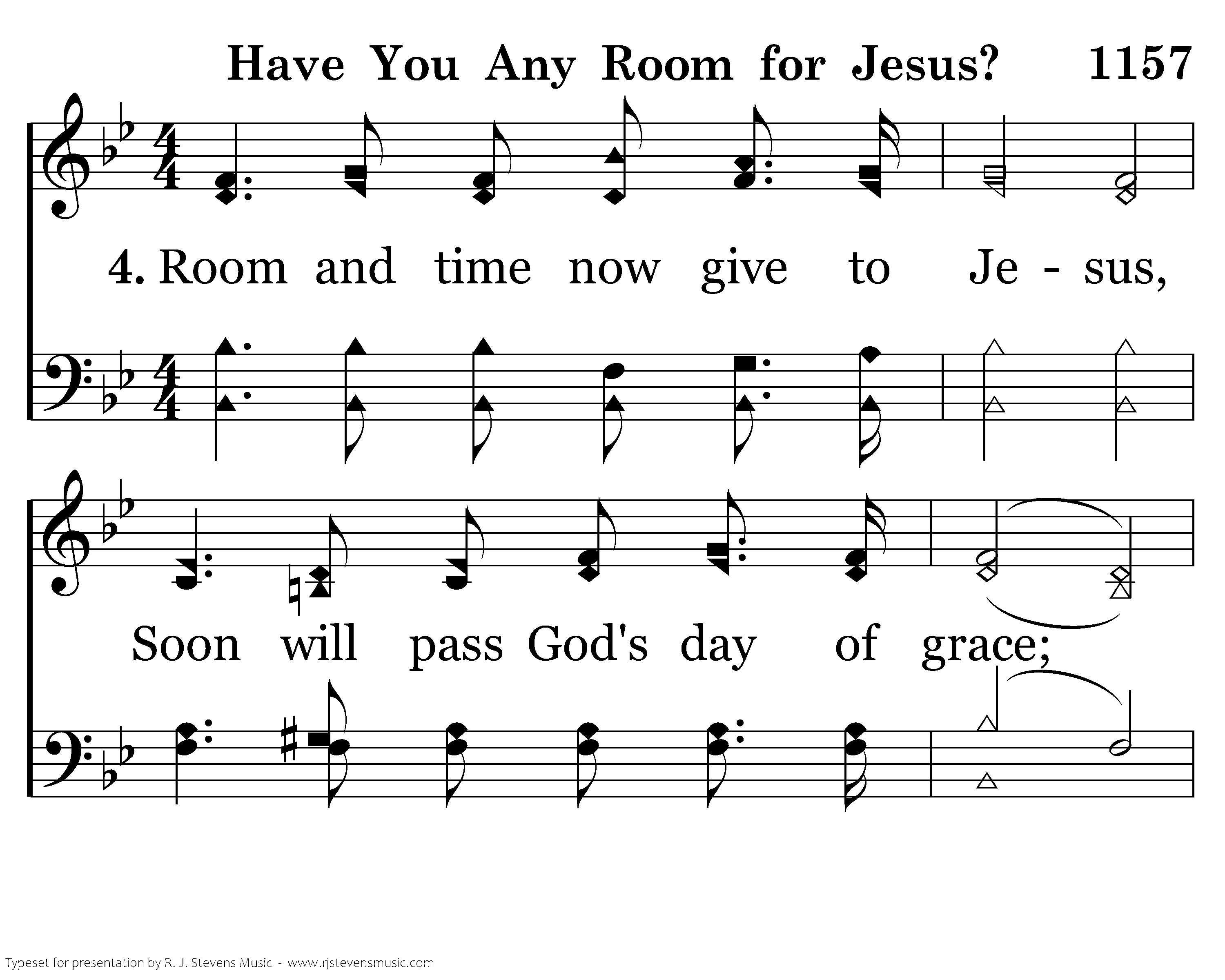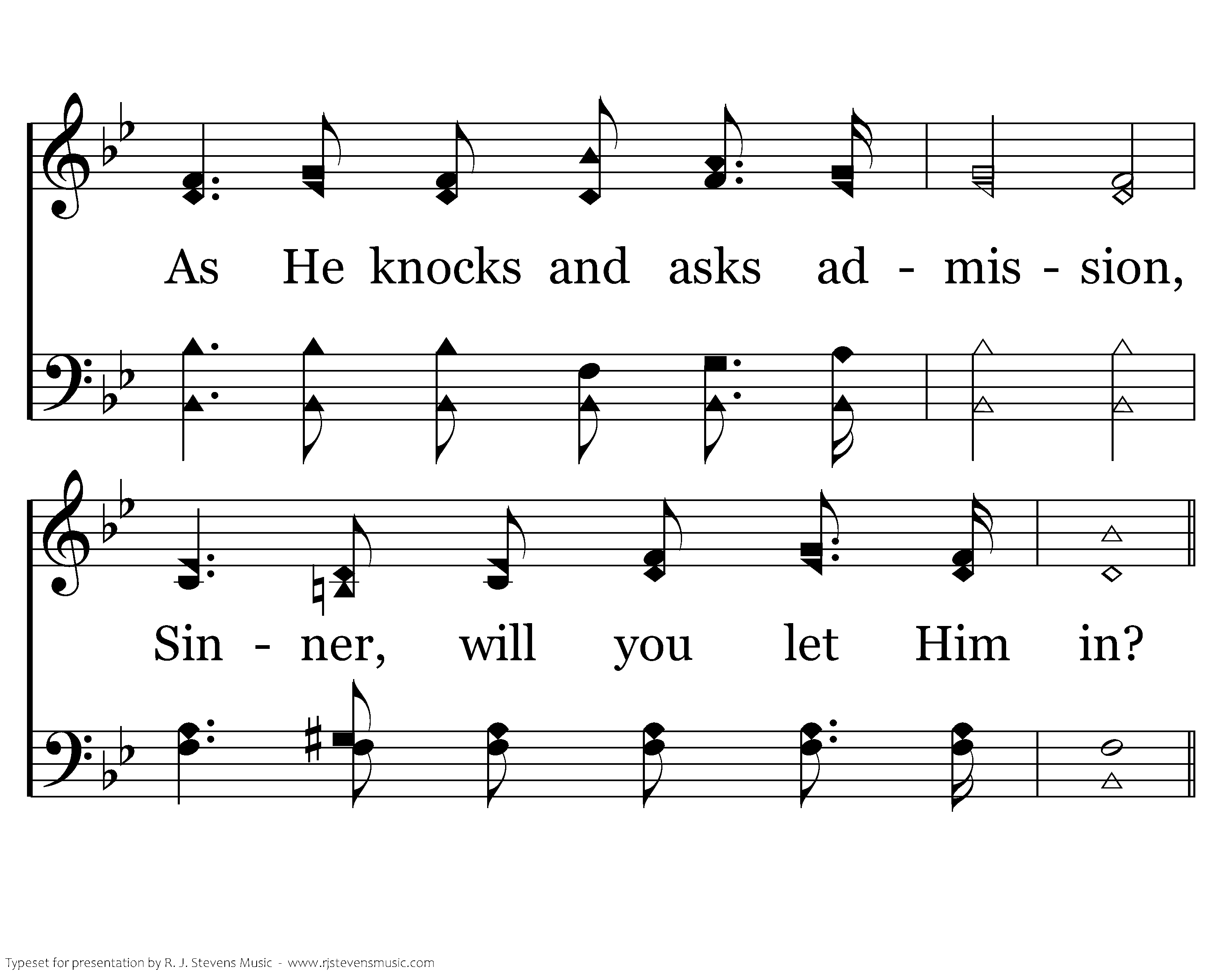 Have you any room for Jesus, He who bore your load of sin? As He knocks and asks admission, Sinner, will you let Him in?