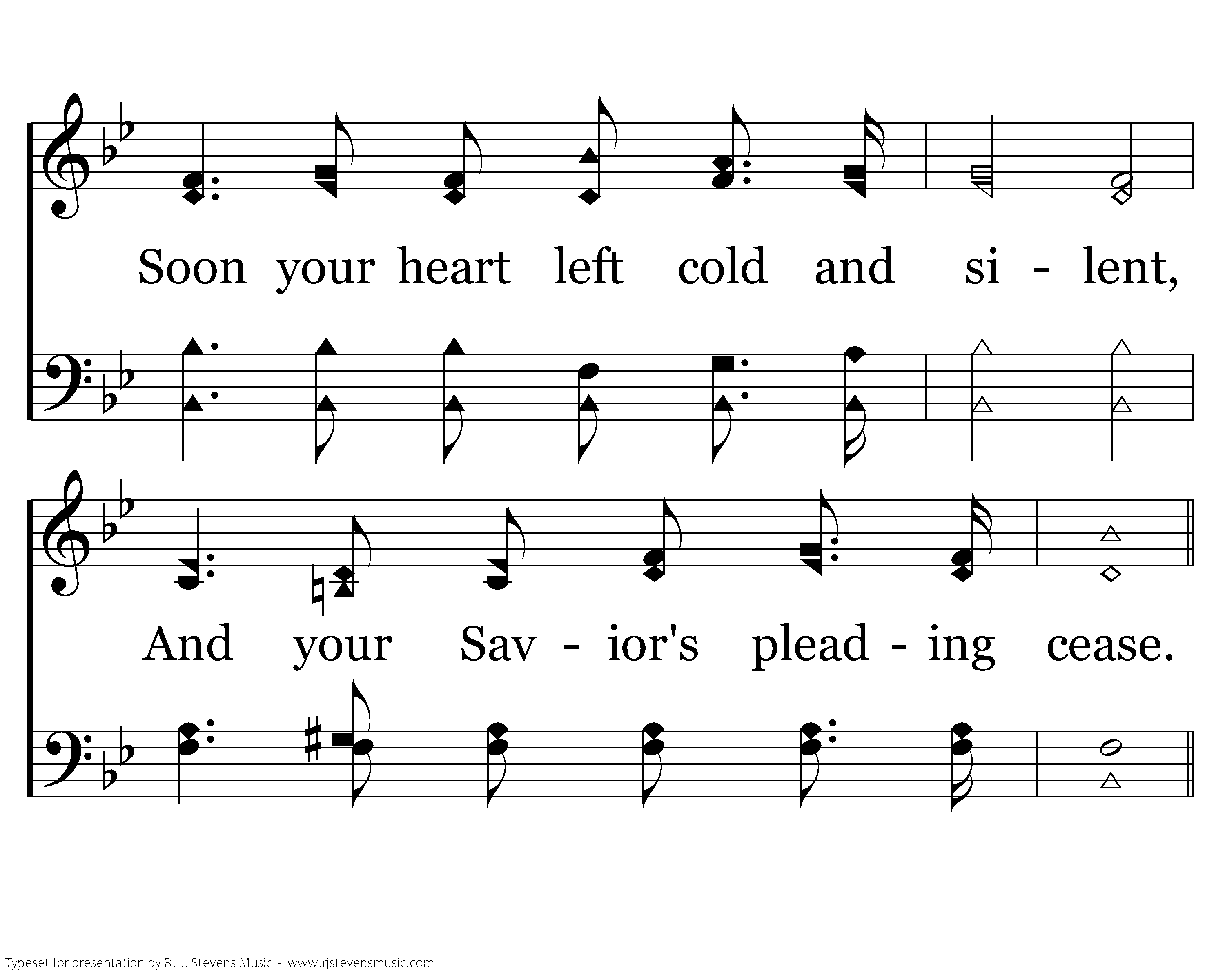 Room and time now give to Jesus, Soon will pass God's day of grace; Soon your heart left cold and silent, And your Savior's pleading cease.