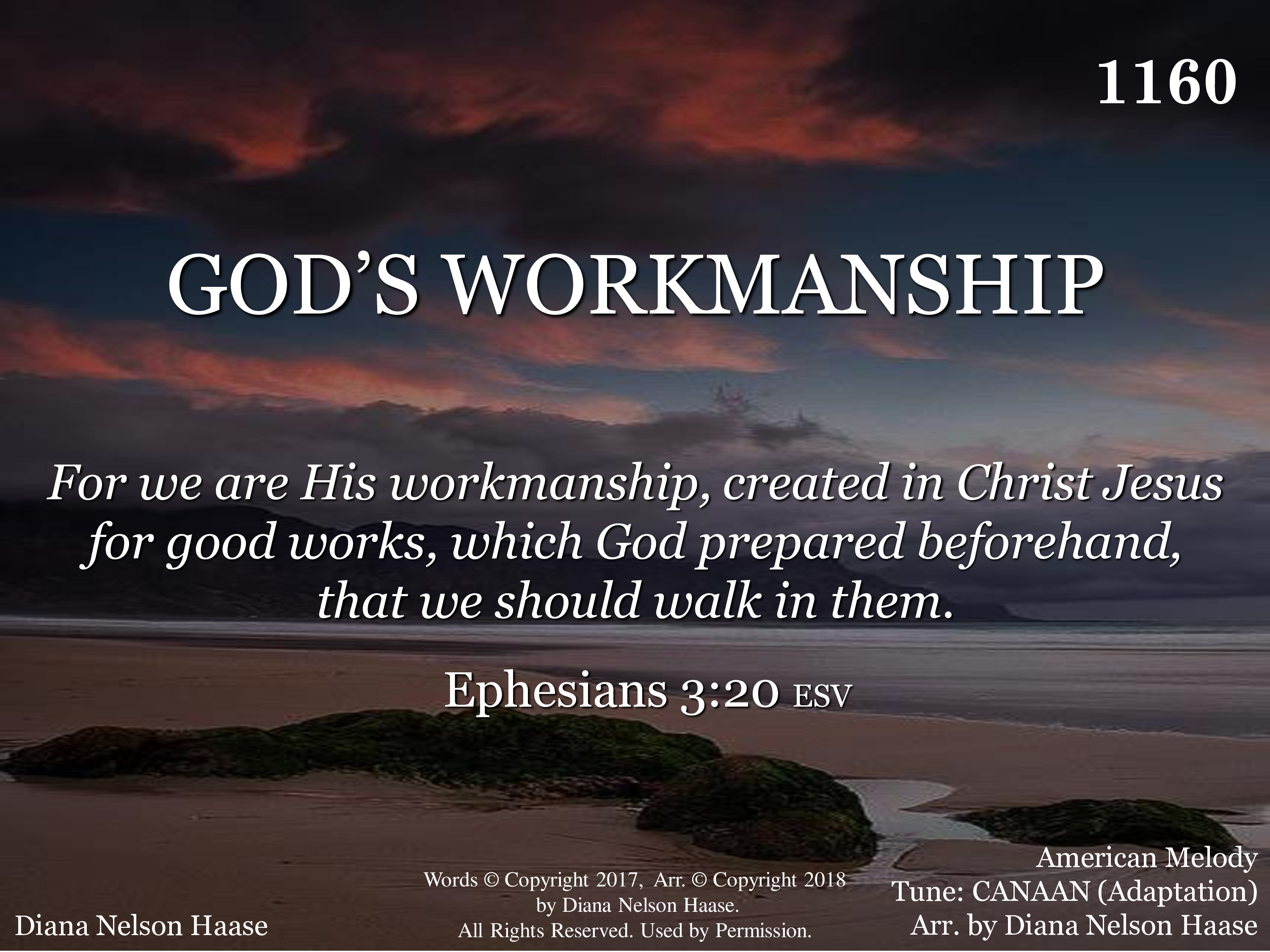 God's workmanship is evident; Our lives are God's formation. We walk in light from day to day; Good works are our vocation. "God's workmanship is evident," Should be our exclamation! From age to age, from birth to death, To heaven's jubilation!