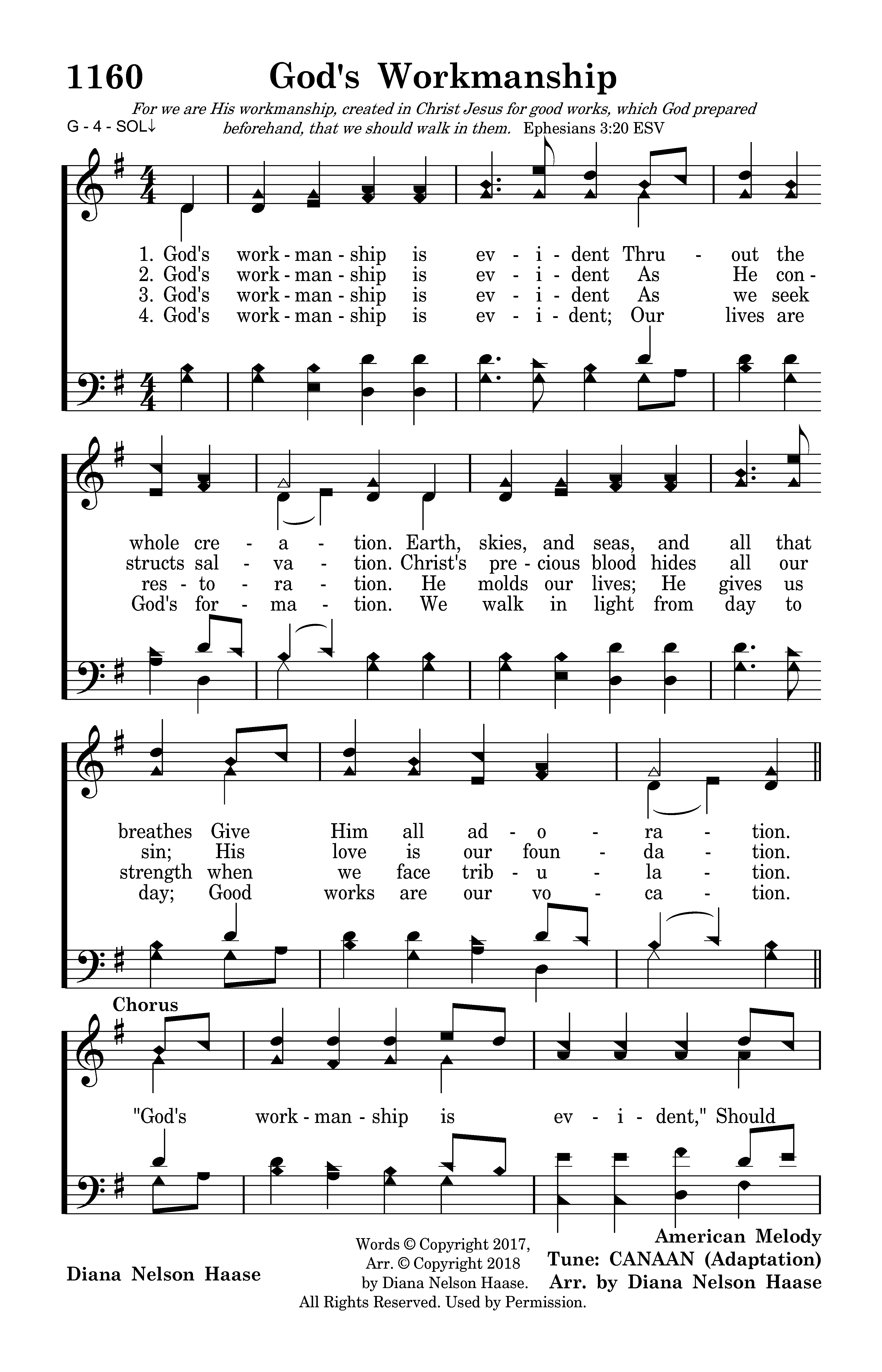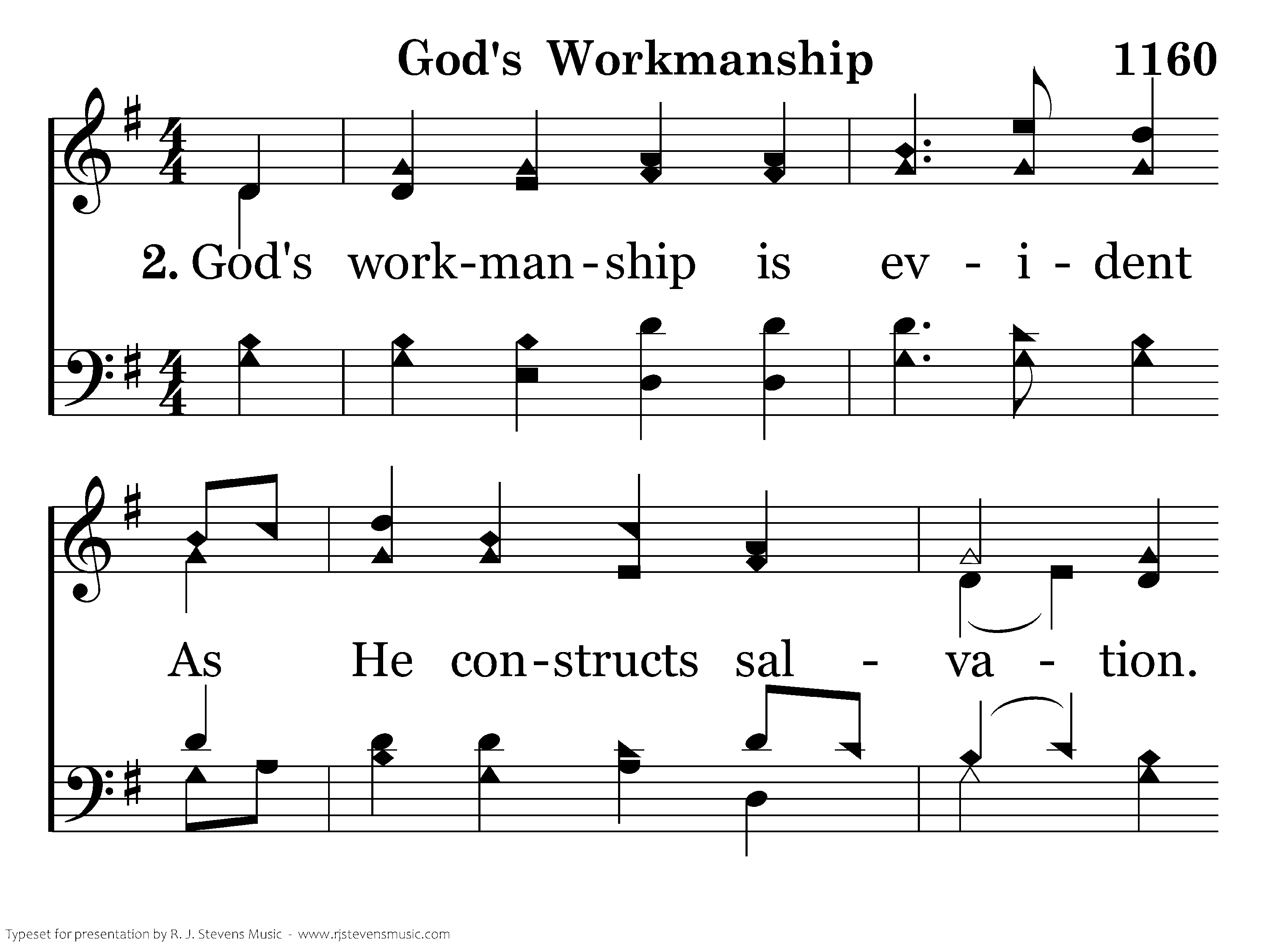 God's workmanship is evident As He constructs salvation. Christ's precious blood hides all our sin; His love is our foundation. "God's workmanship is evident," Should be our exclamation! From age to age, from birth to death, To heaven's jubilation!