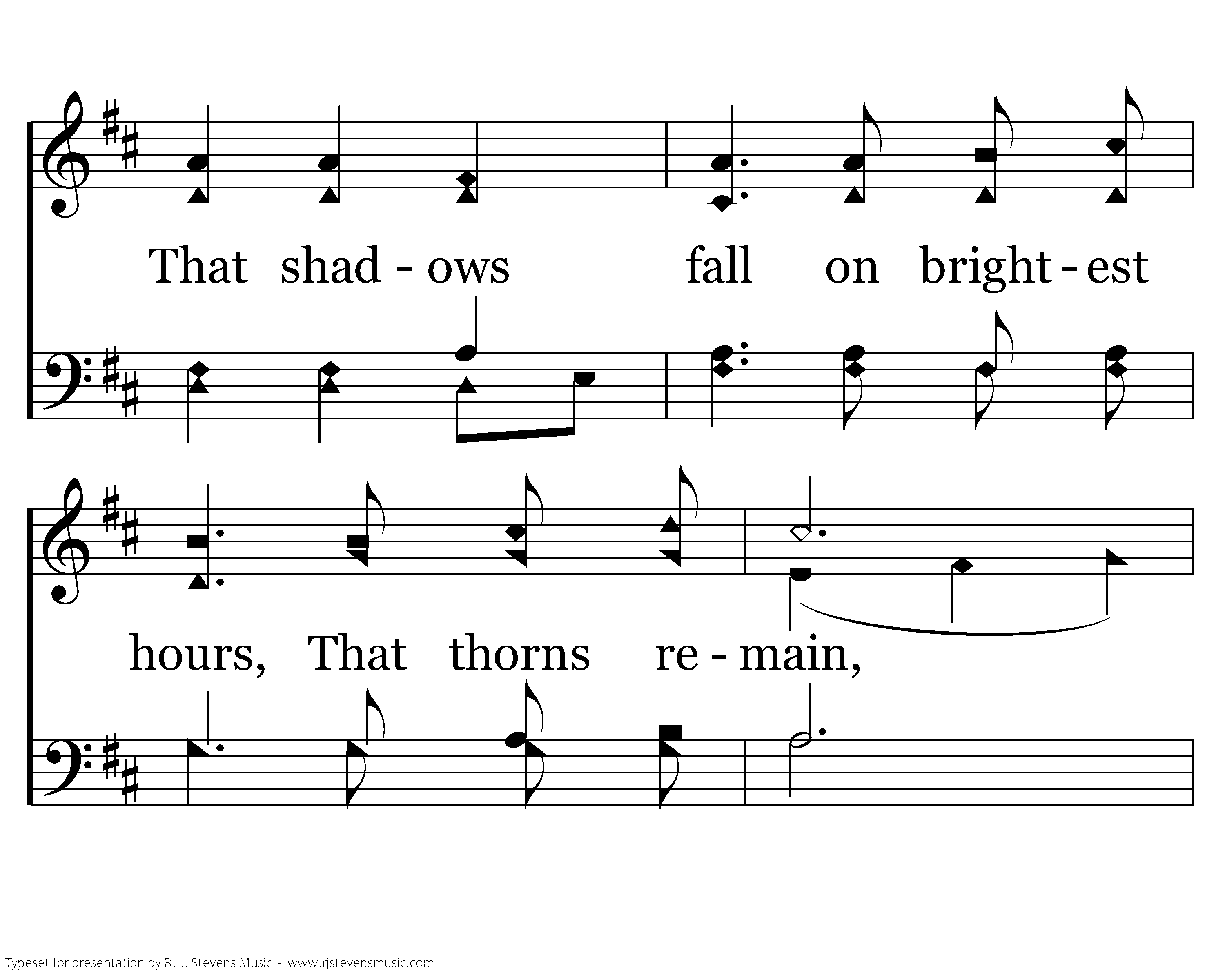I thank You more that all our joy Is touched with pain, That shadows fall on brightest hours, That thorns remain, So that earth's bliss may be our guide And not our chain.