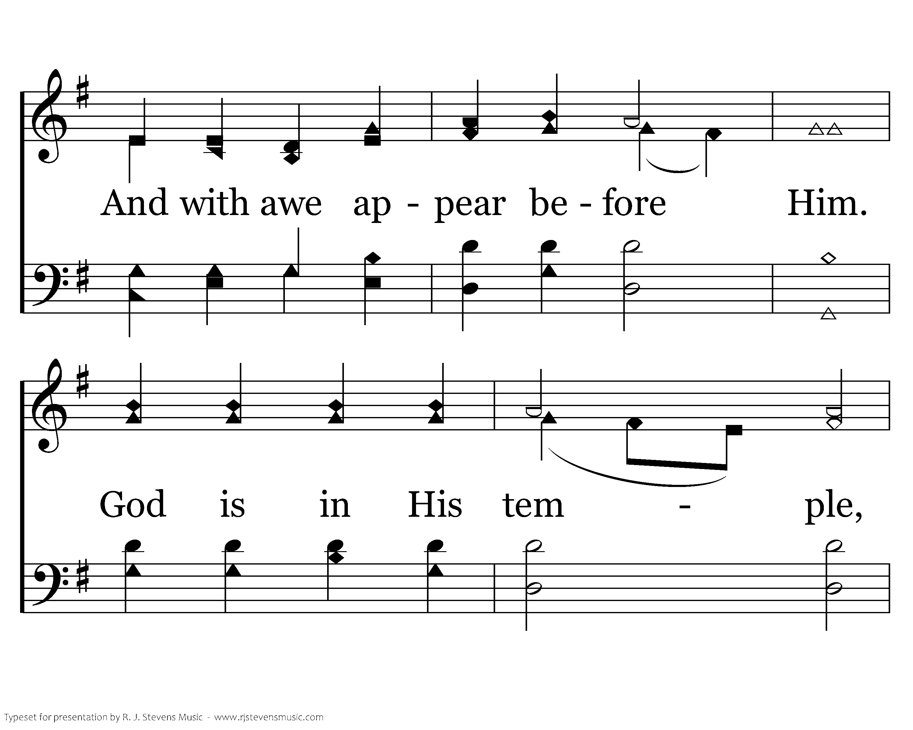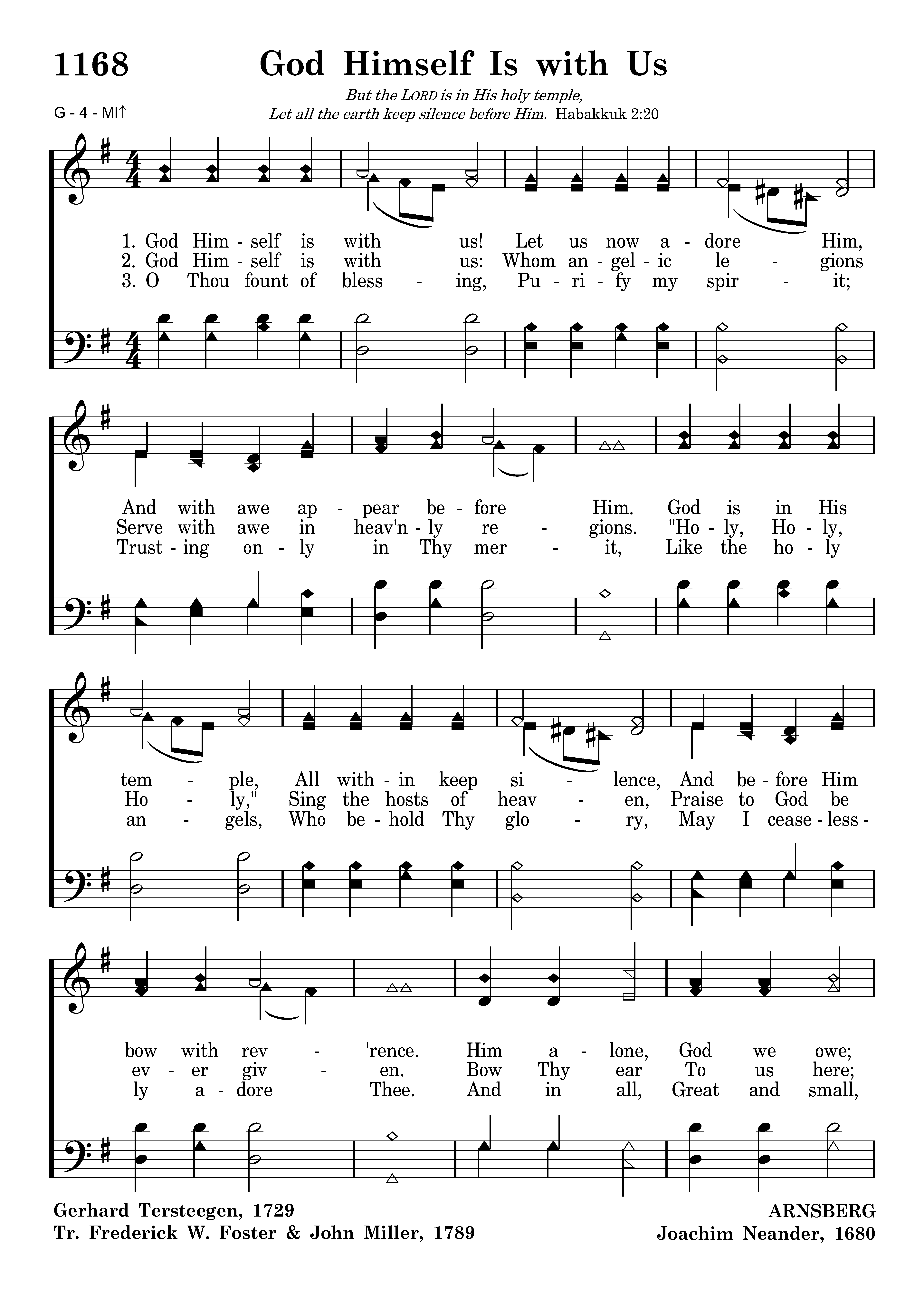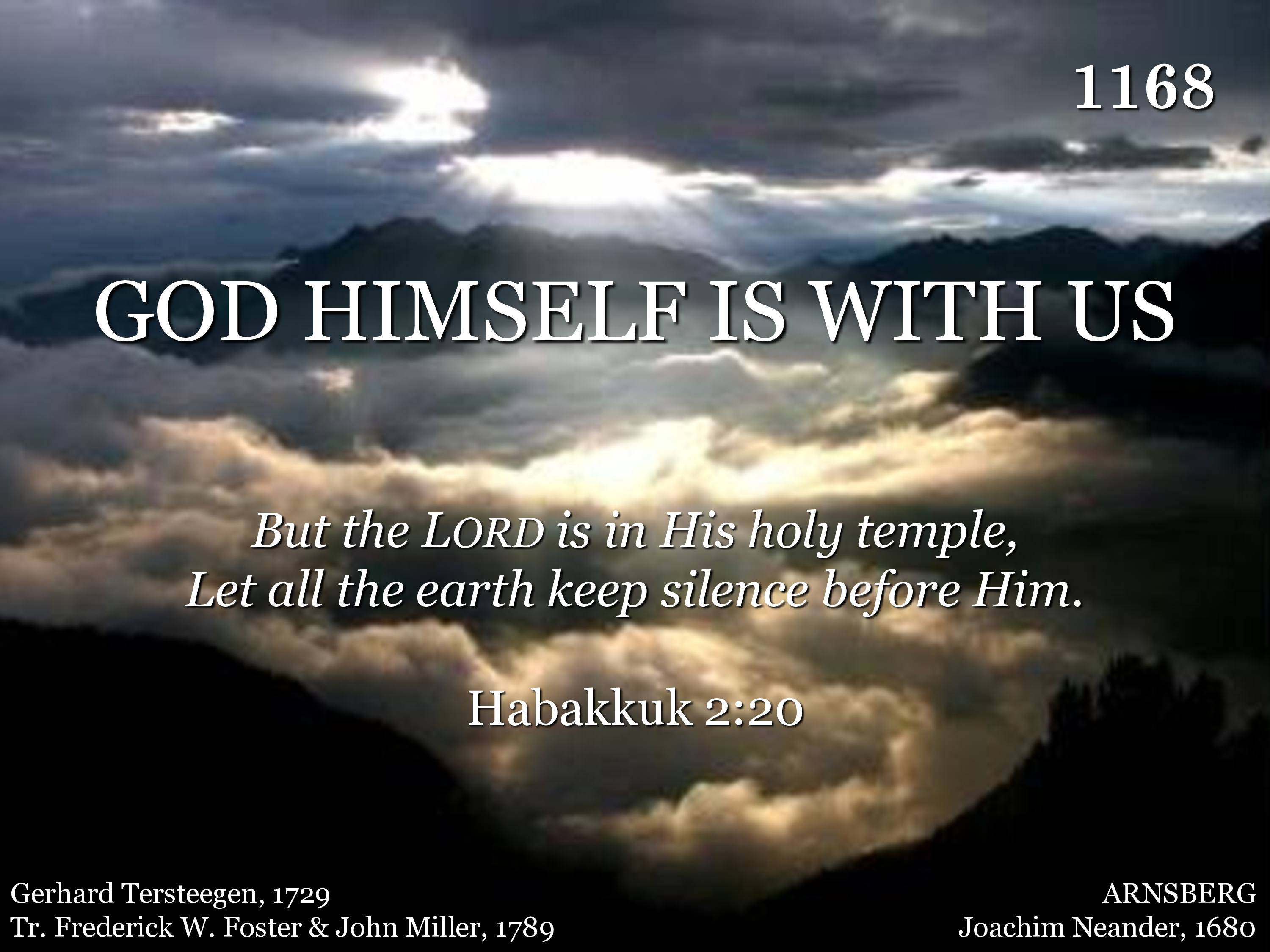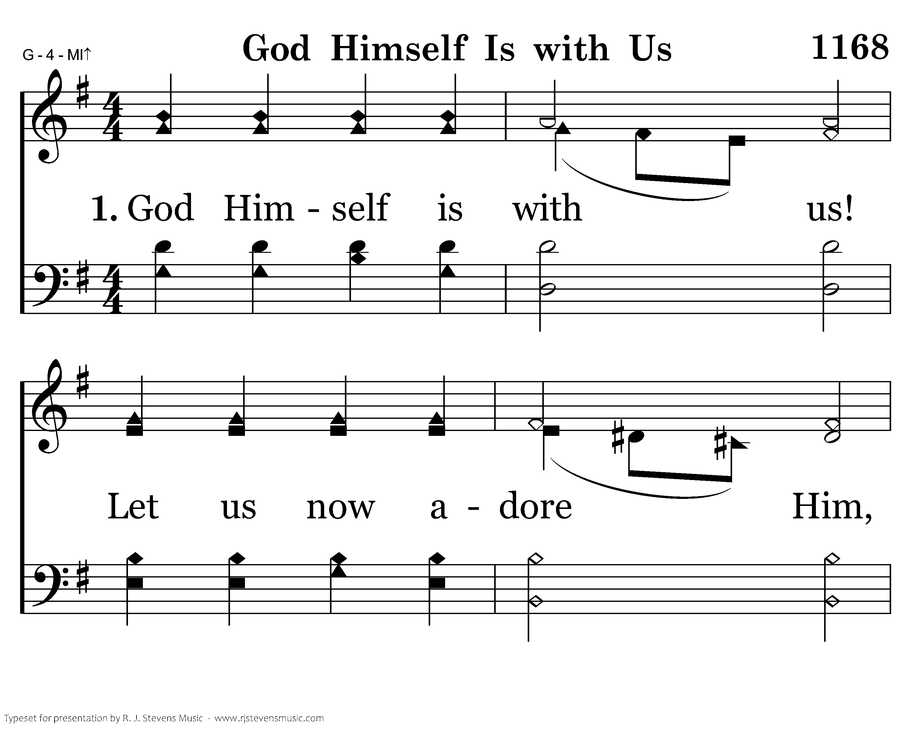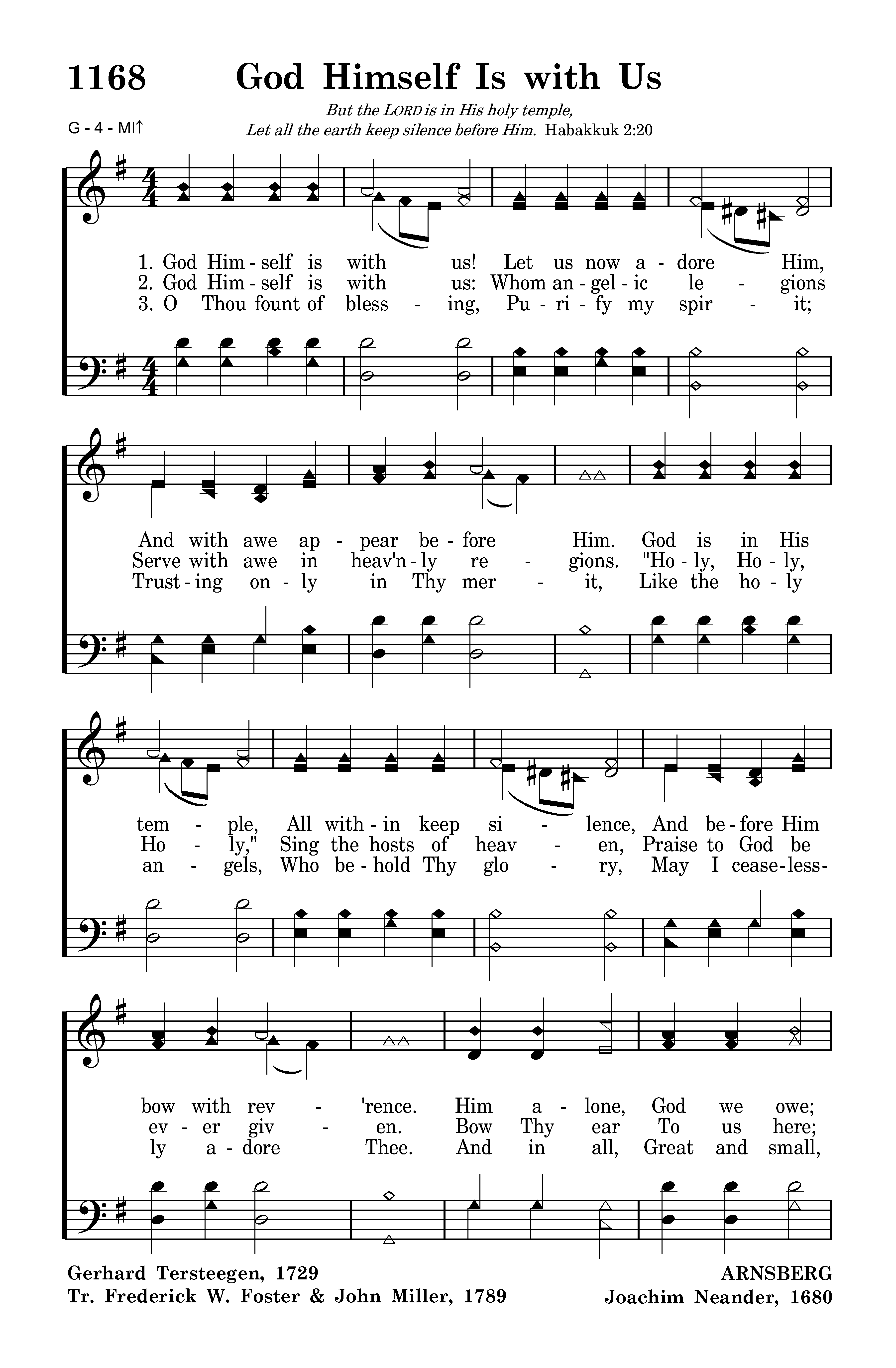 God Himself is with us! Let us now adore Him, And with awe appear before Him. God is in His temple, All within keep silence, And before Him bow with rev'rence. Him alone, God we own; To our Lord and Savior Praises sing forever.