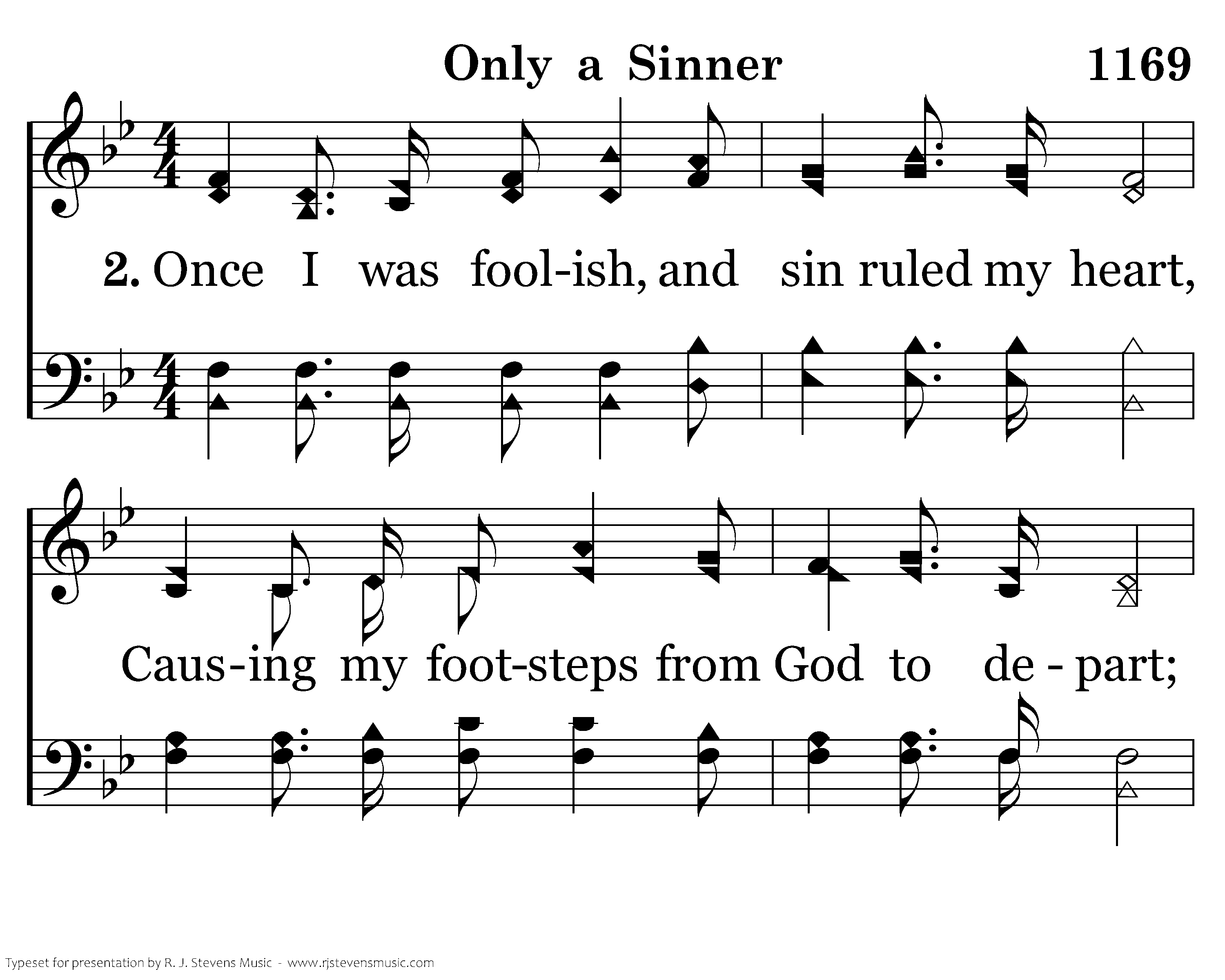 Once I was foolish, and sin ruled my heart, Causing my footsteps from God to depart; Jesus hath found me, happy my case; I now am a sinner saved by grace!