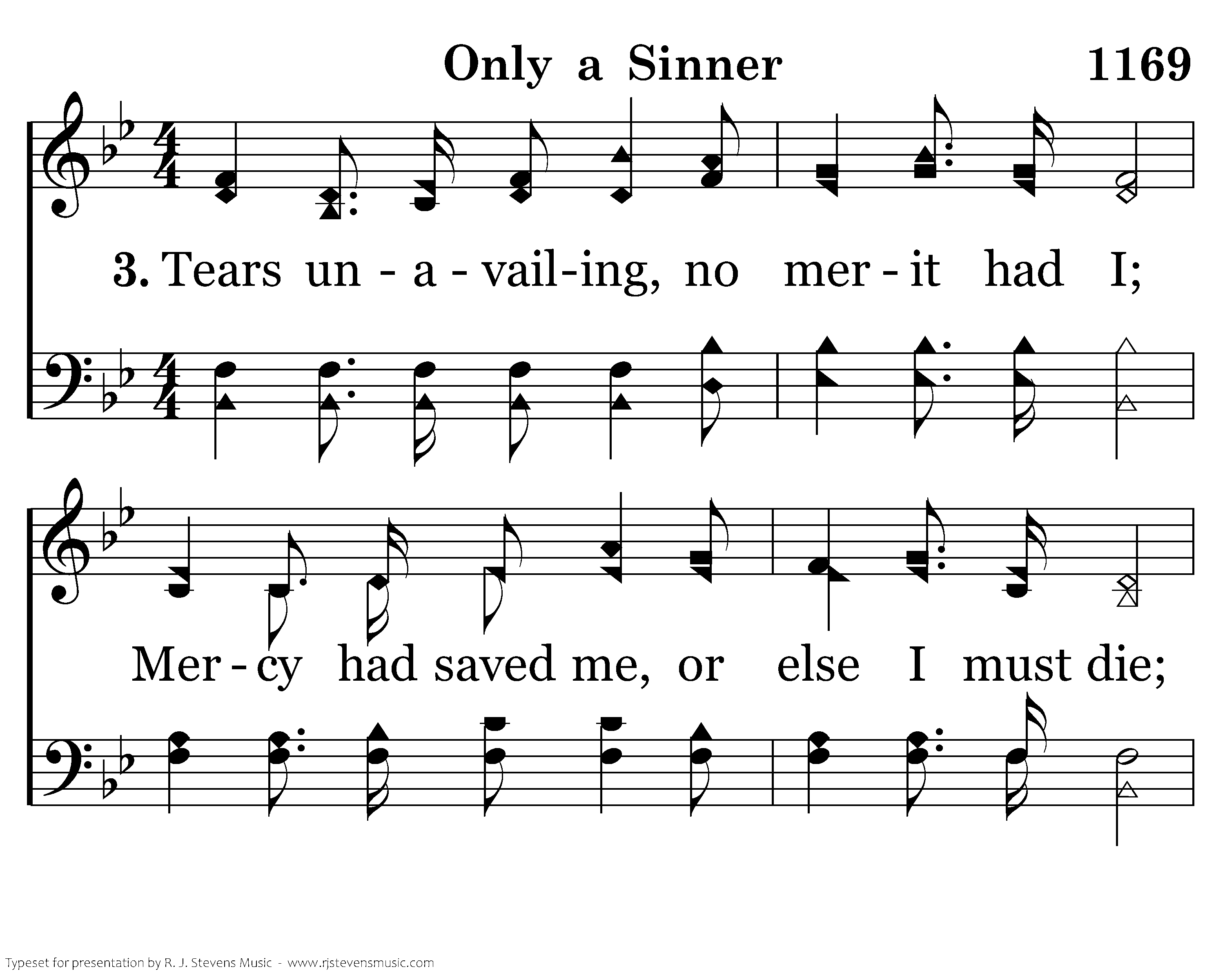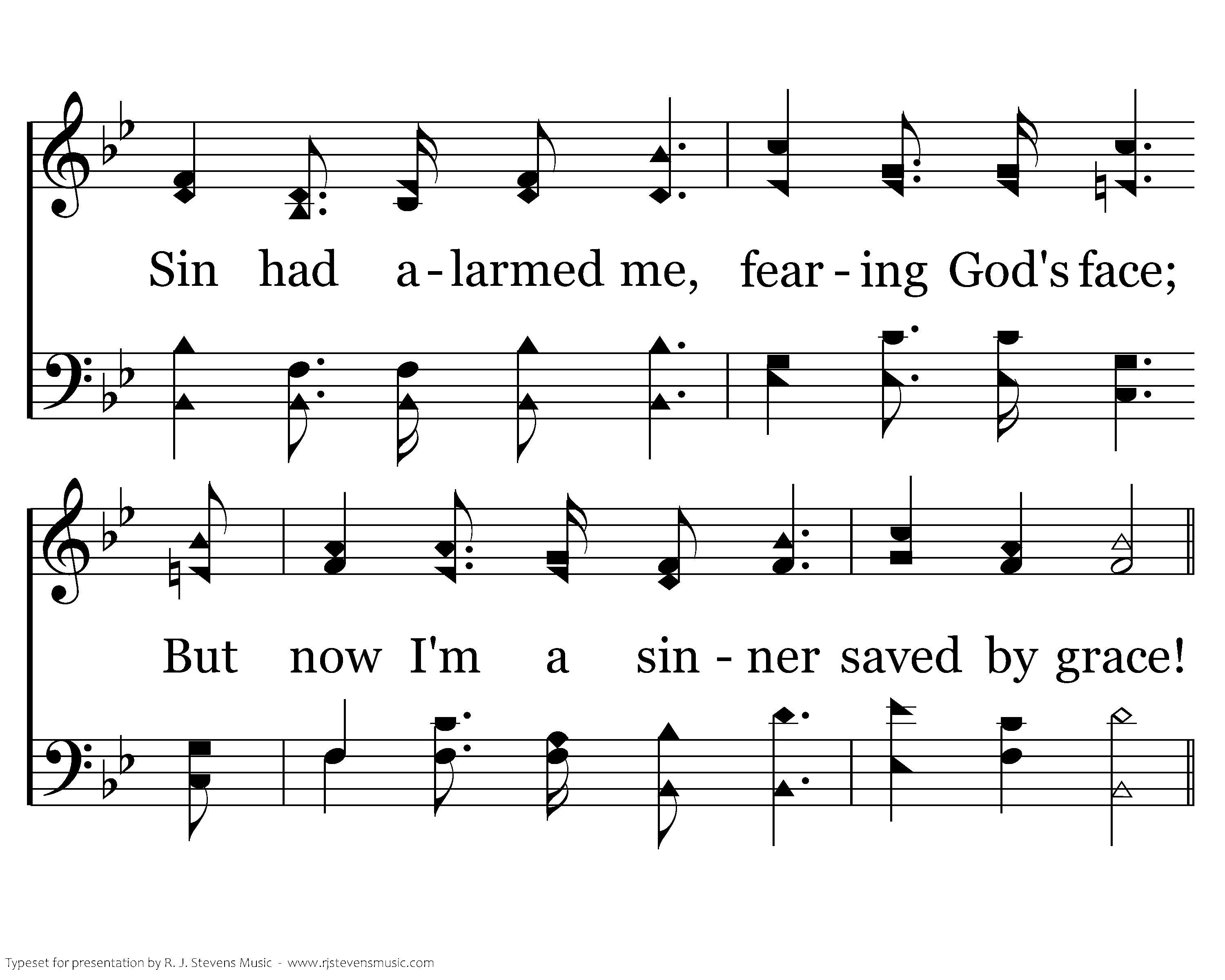 Tears unavailing, no merit had I; Mercy had saved me, or else I must die; Sin had alarmed me, fearing God's face; But now I'm a sinner saved by grace!