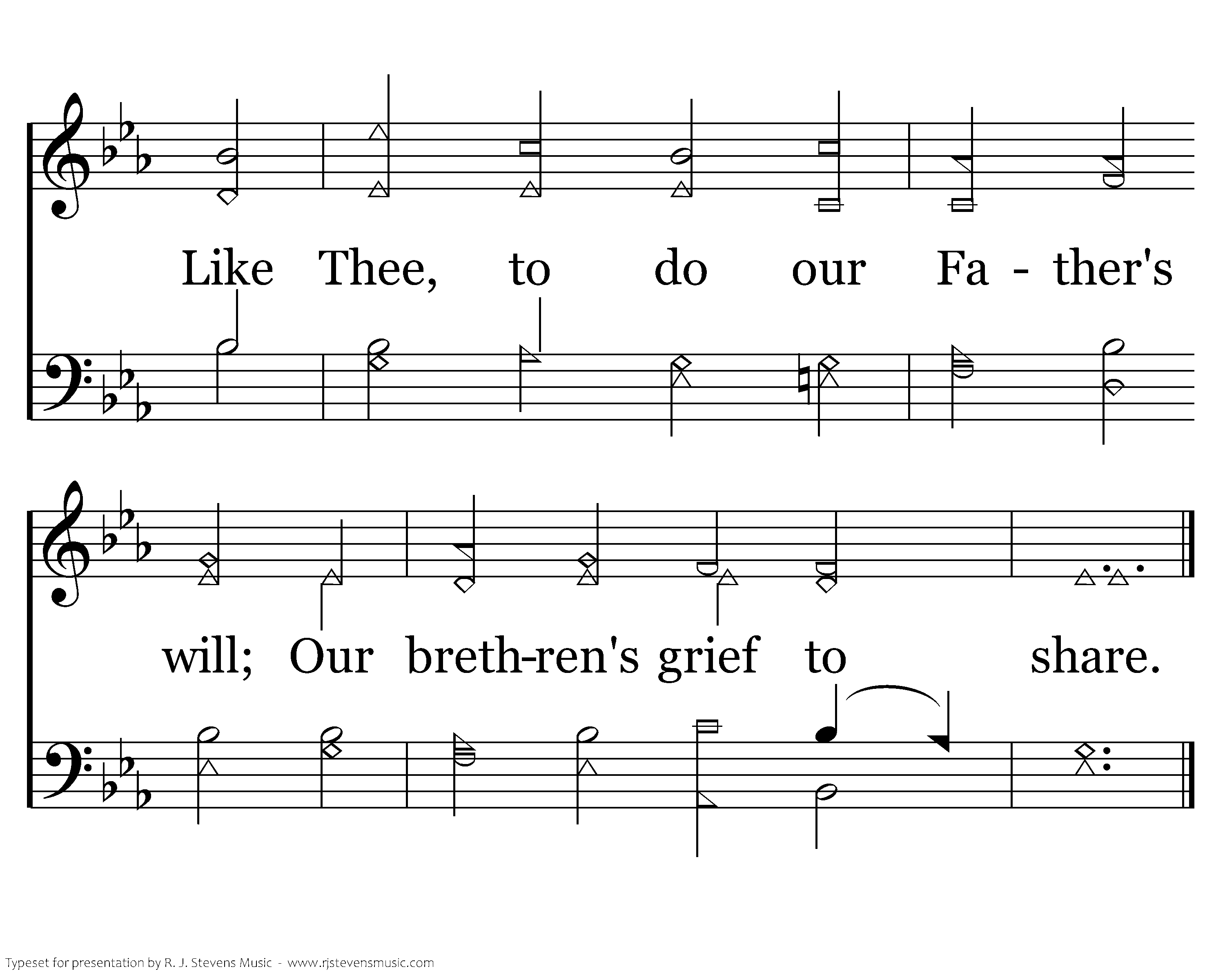 Help us, thru good report and ill, Our daily cross to bear; Like Thee, to do our Father's will; Our brethren's grief to share.