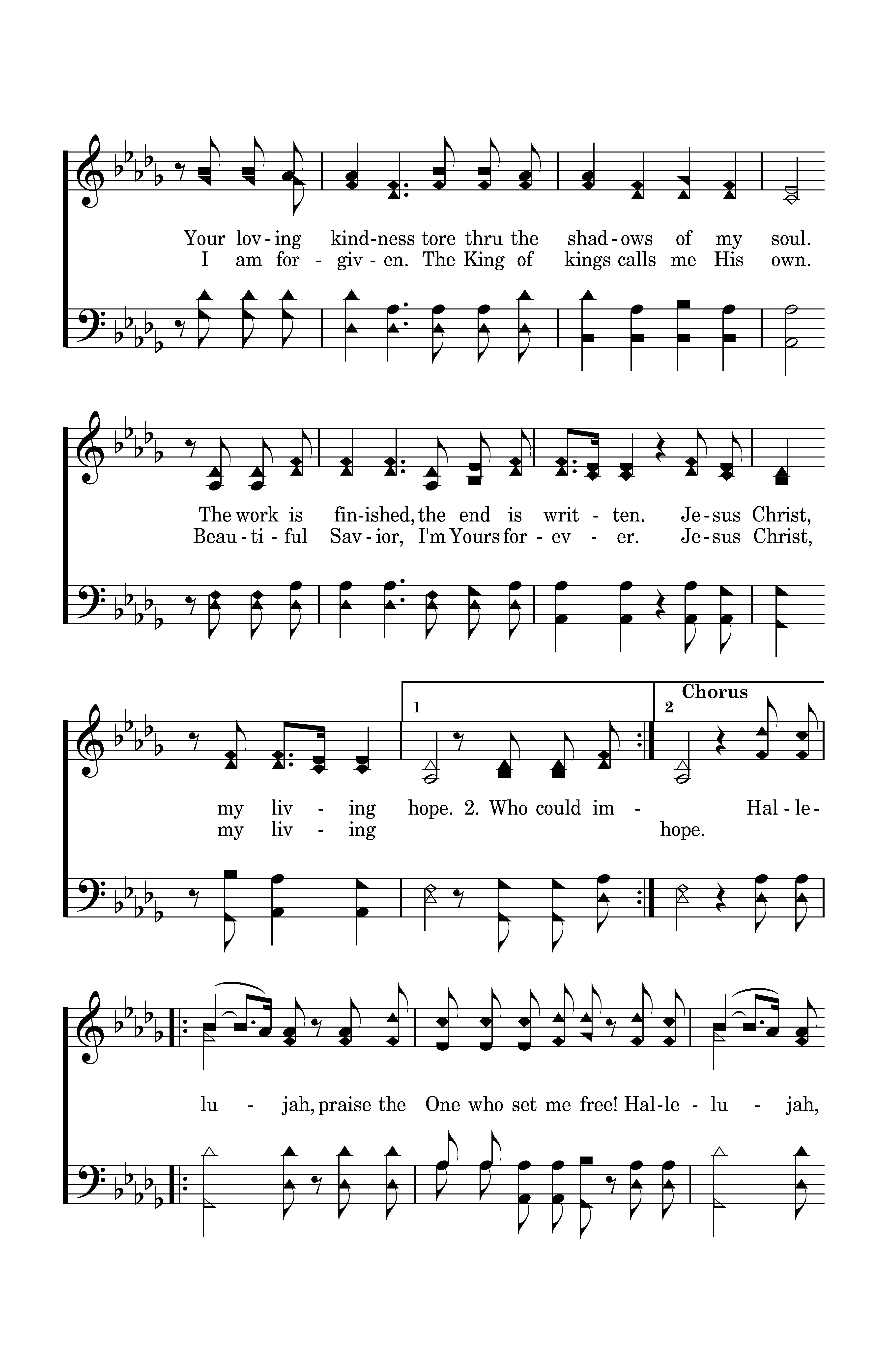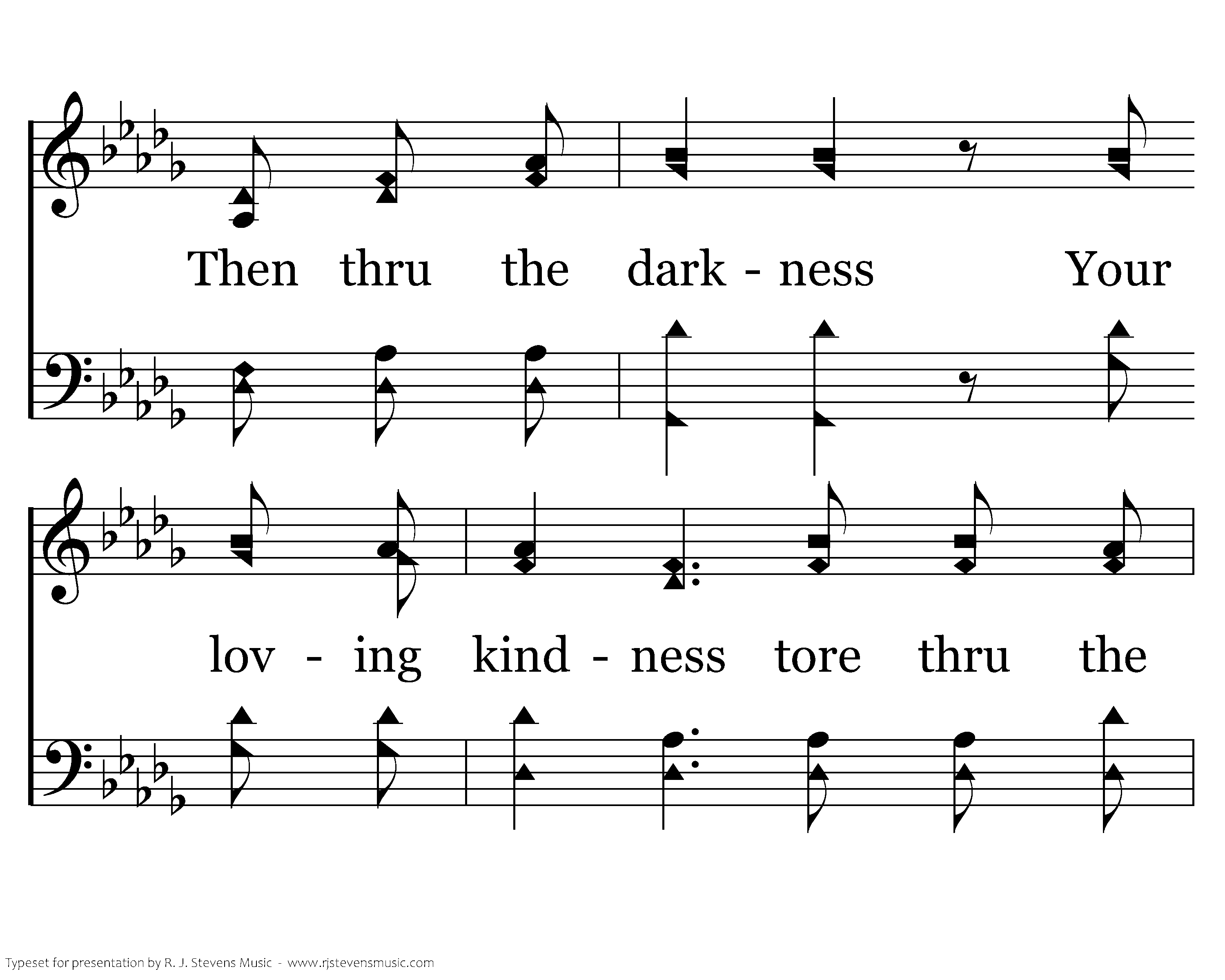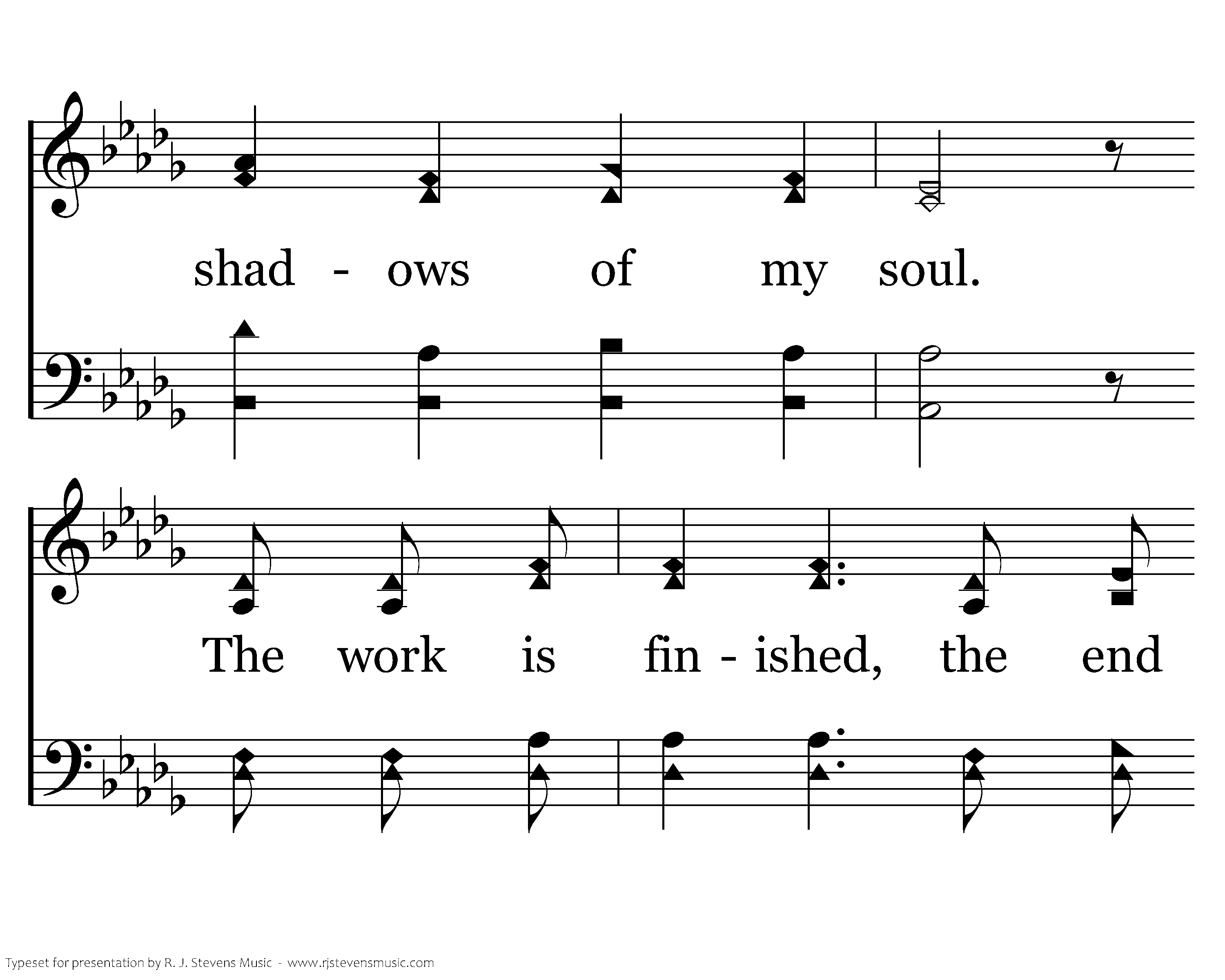 How great the chasm that lay between us. How high the mountain I could not climb. In desperation I turned to heaven and spoke Your name into the night. Then thru the darkness Your loving kindness tore thru the shadows of my soul. The work is finished, the end is written. Jesus Christ, my living hope.