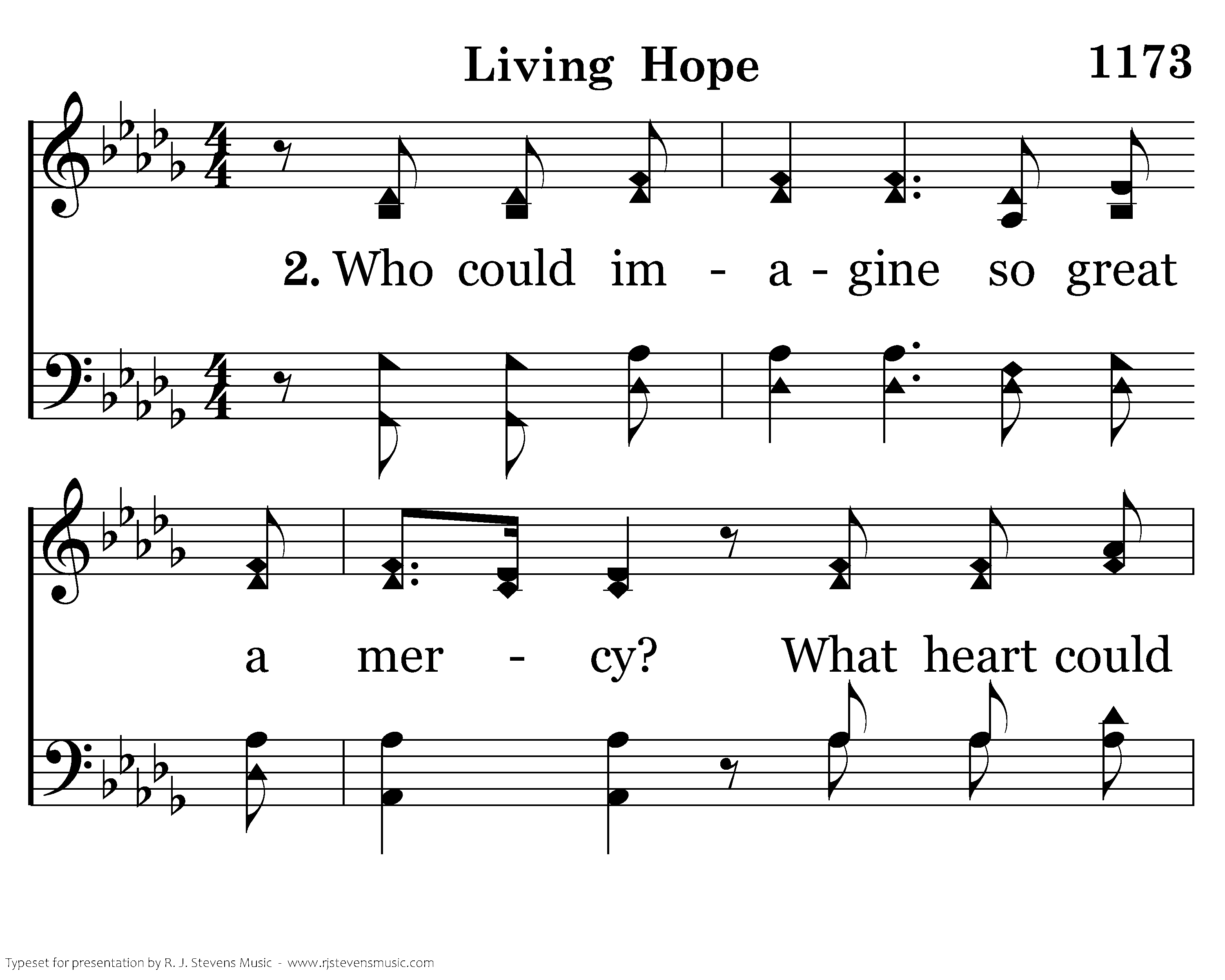 Who could imagine so great a mercy? What heart could fathom such boundless grace? The God of ages stepped down from glory to wear my sin and bear my shame. The cross has spoken; I am forgiven. The King of kings calls me His own. Beautiful Savior, I'm Yours forever. Jesus Christ, my living hope. Hallelujah, praise the One who set me free! Hallelujah, death has lost its grip on me! You have broken ev'ry chain. There's salvation in Your name. Jesus Christ, my living hope. Jesus Christ, my living hope. O God, You are my living hope.