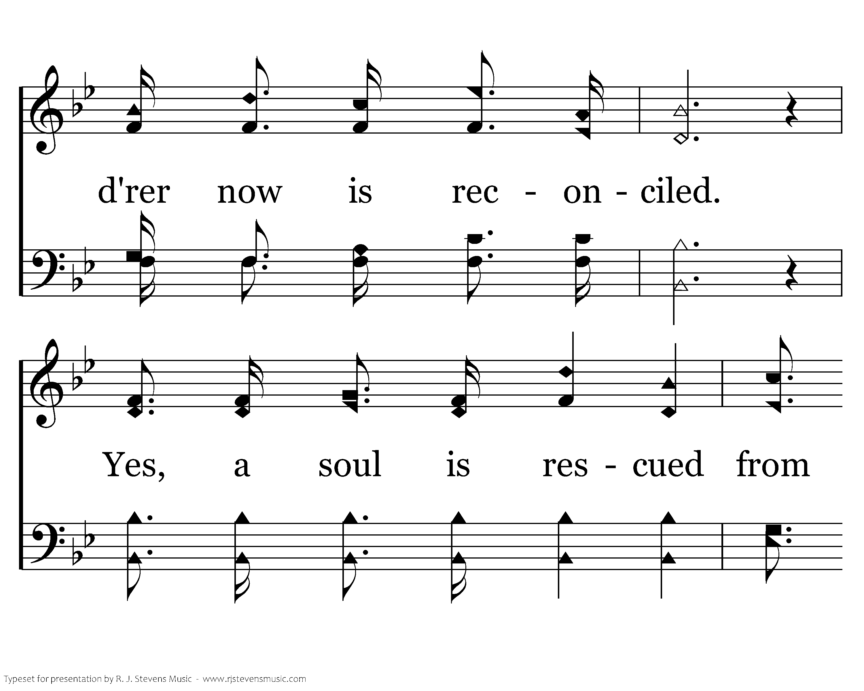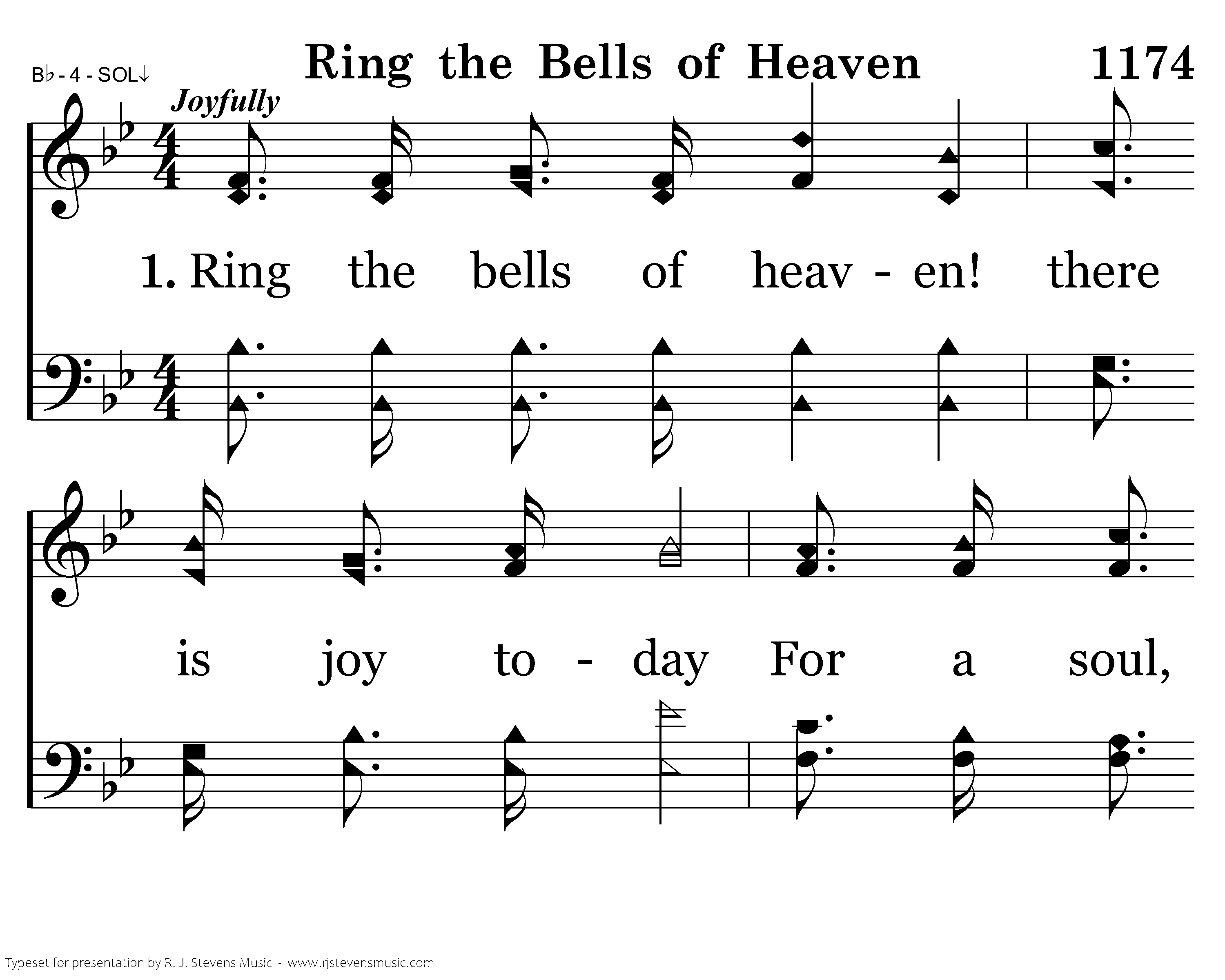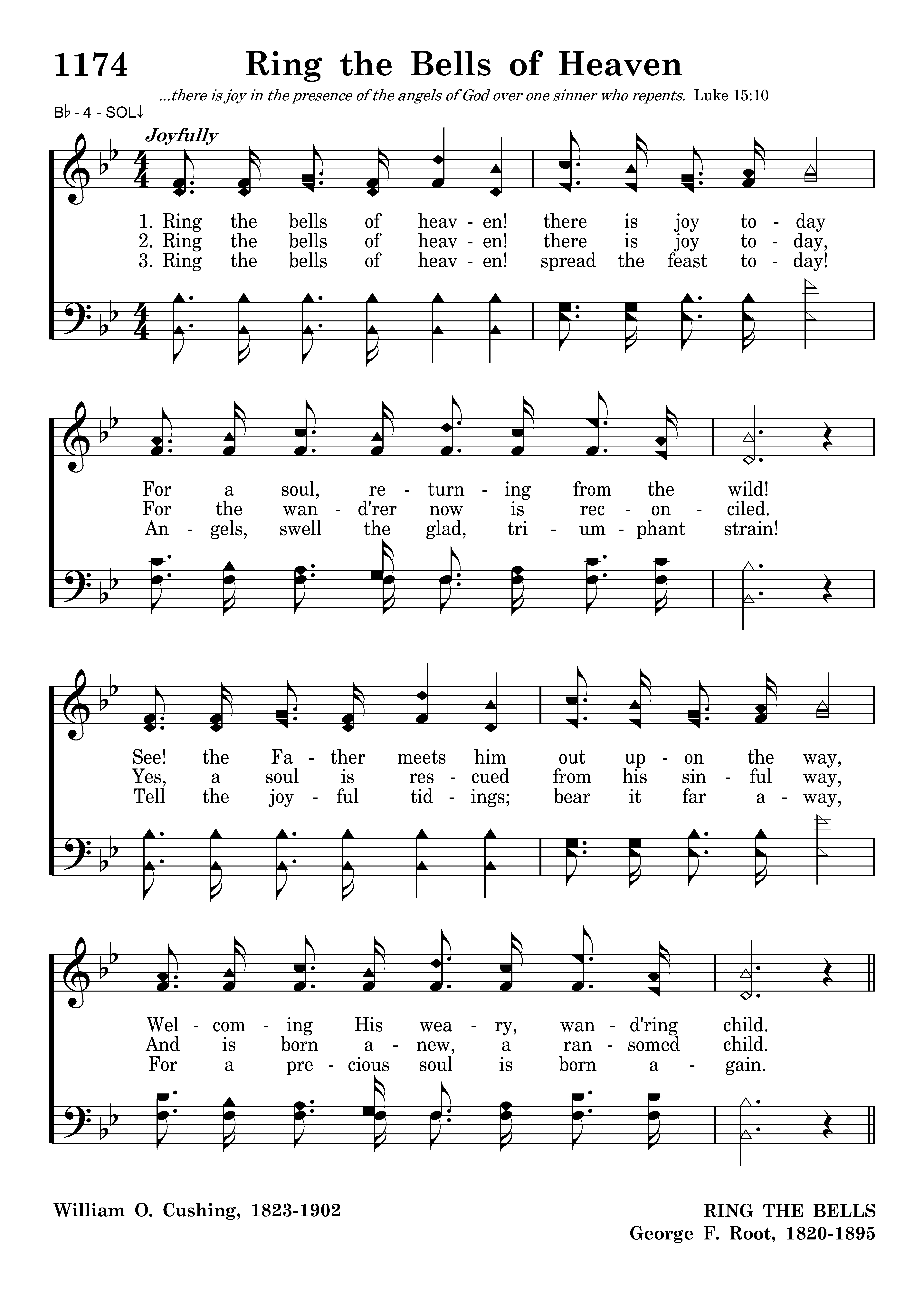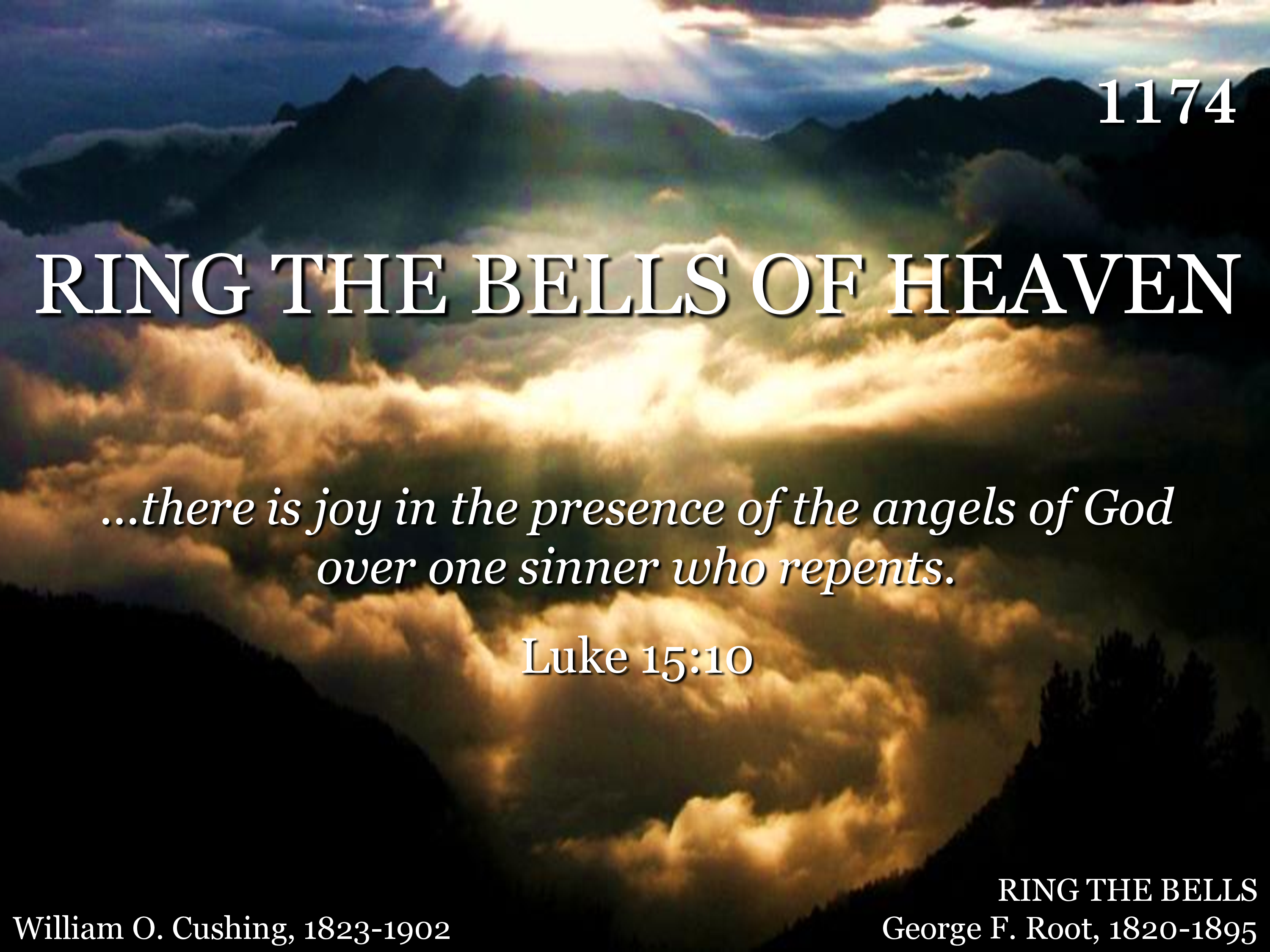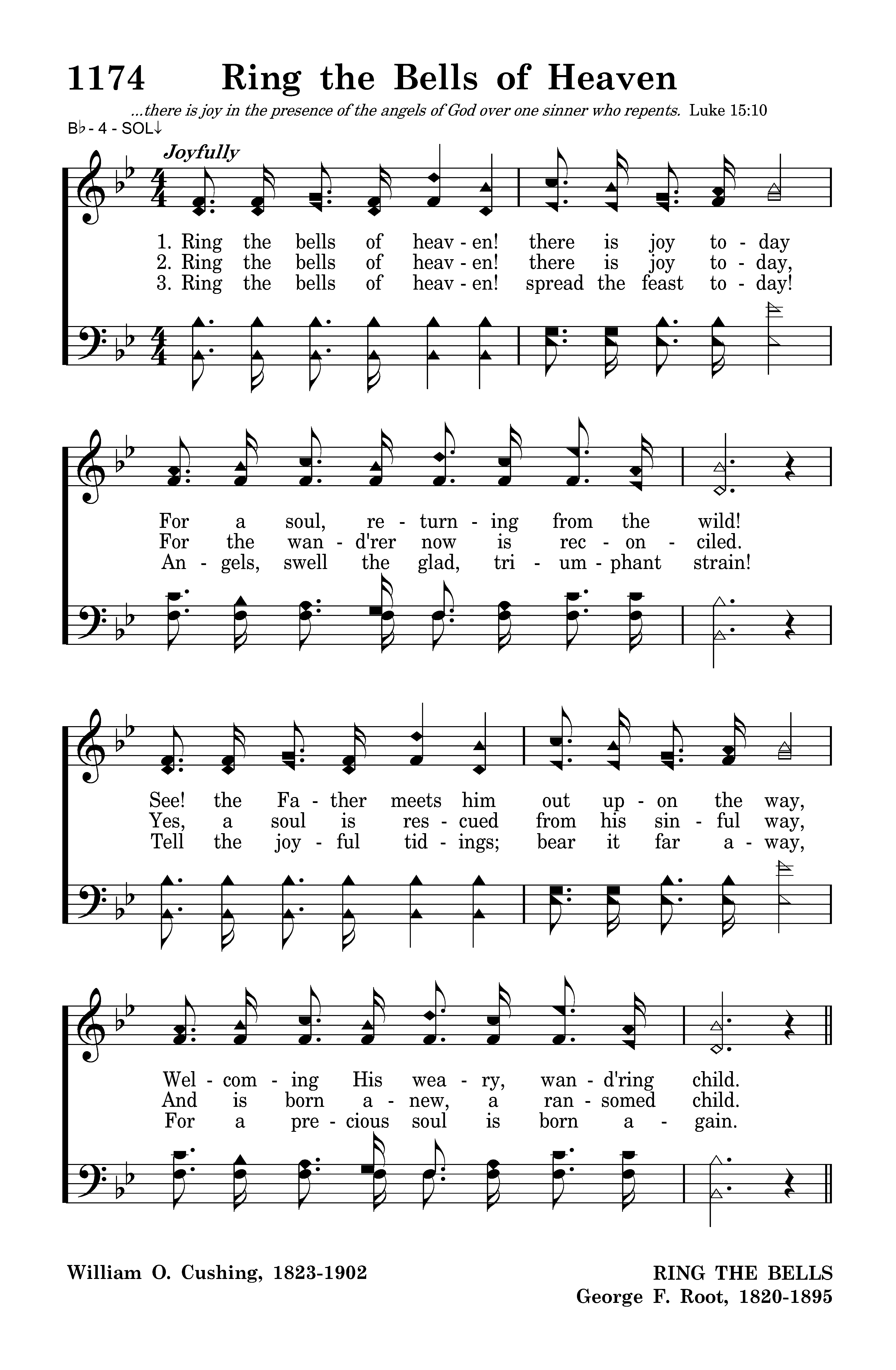 Ring the bells of heaven! there is joy today, For the wand'rer now is reconciled. Yes, a soul is rescued from his sinful way, And is born anew, a ransomed child.