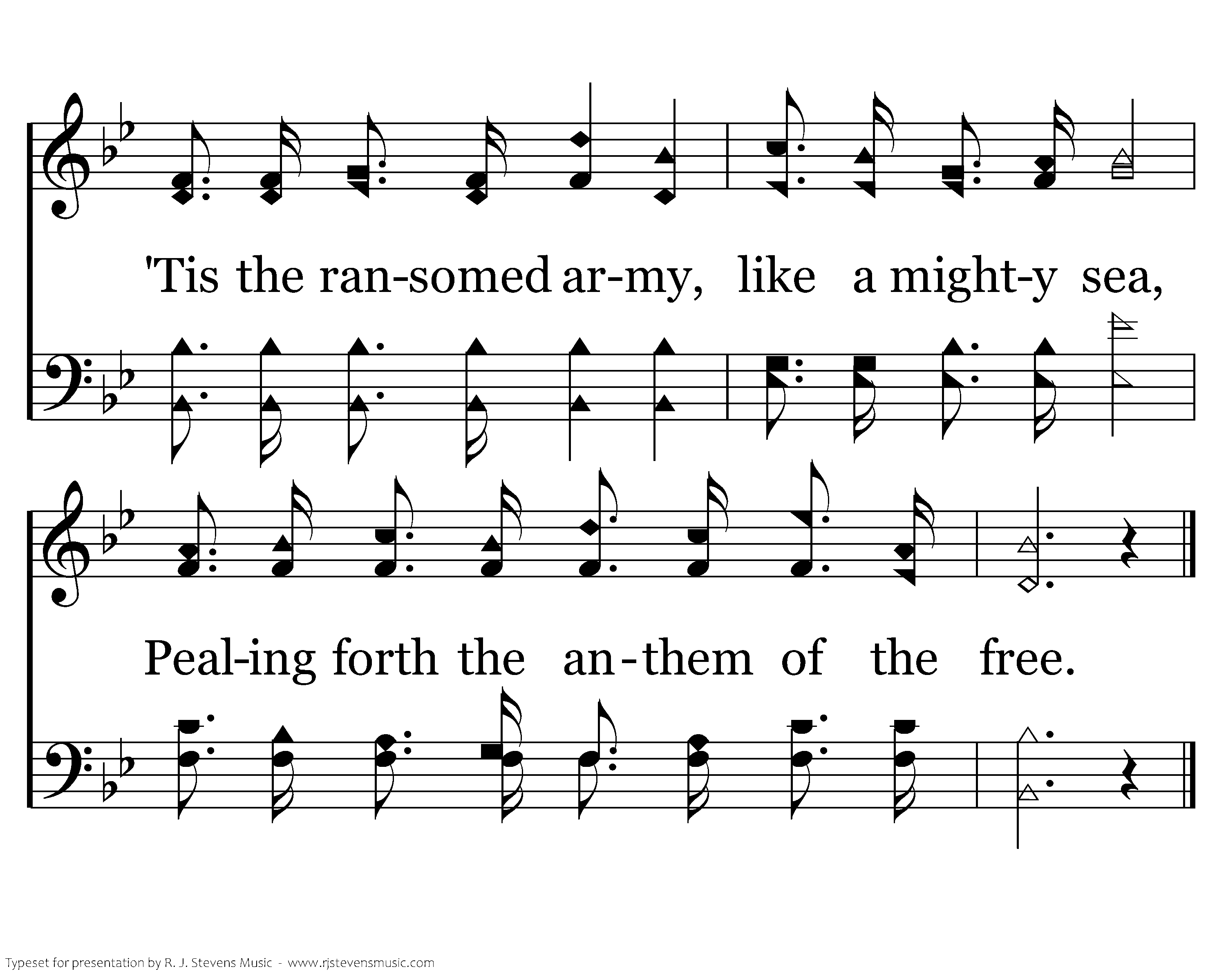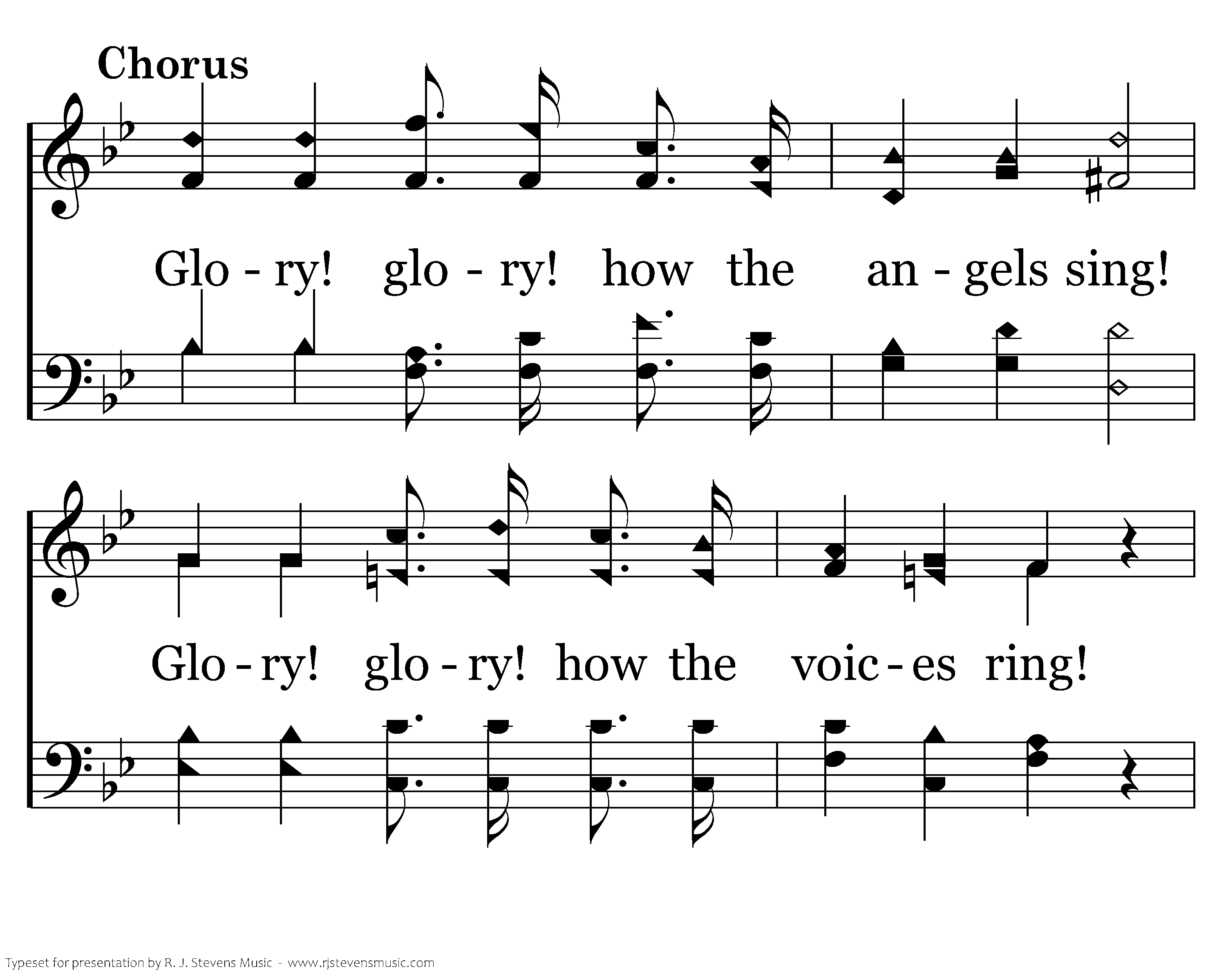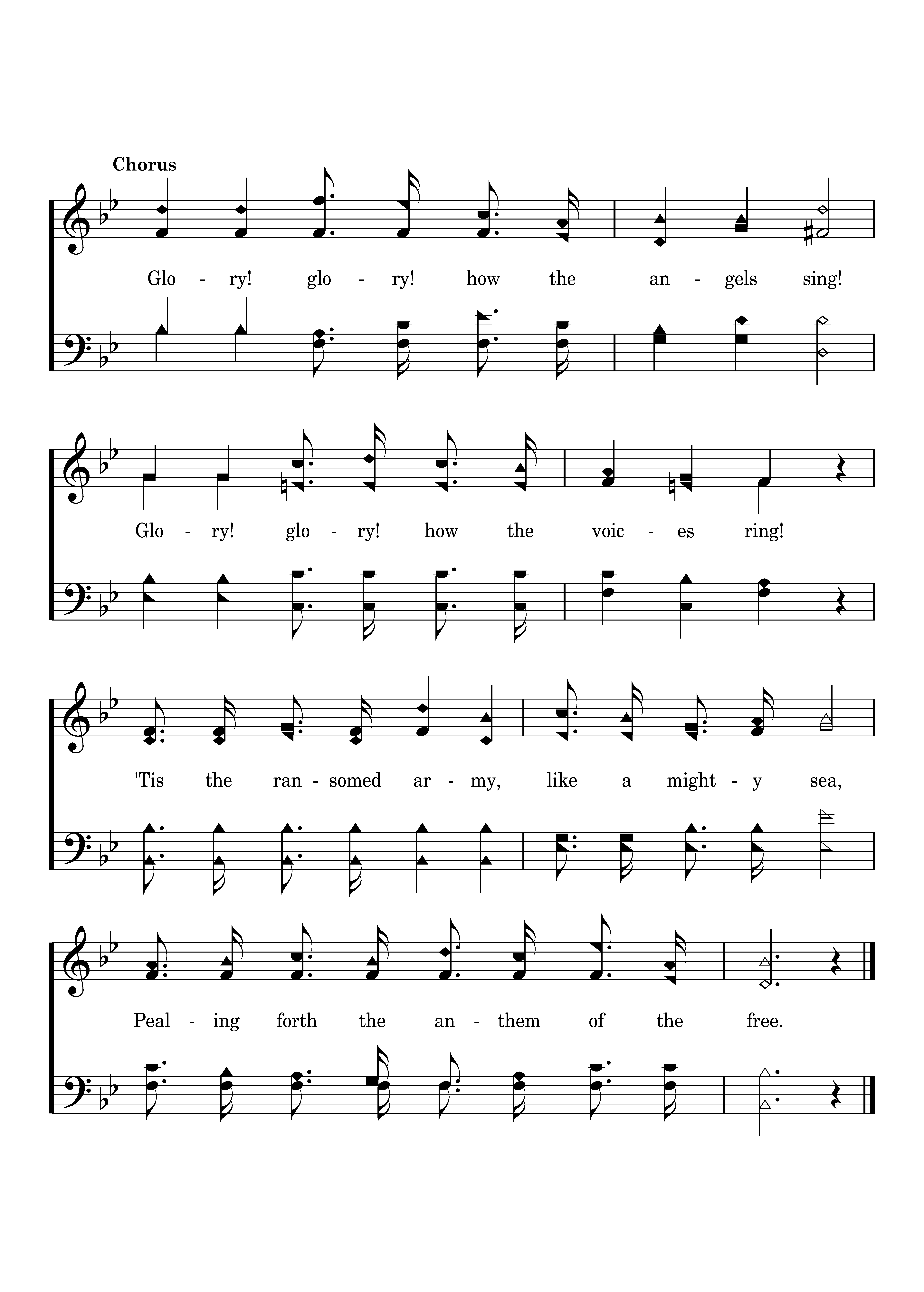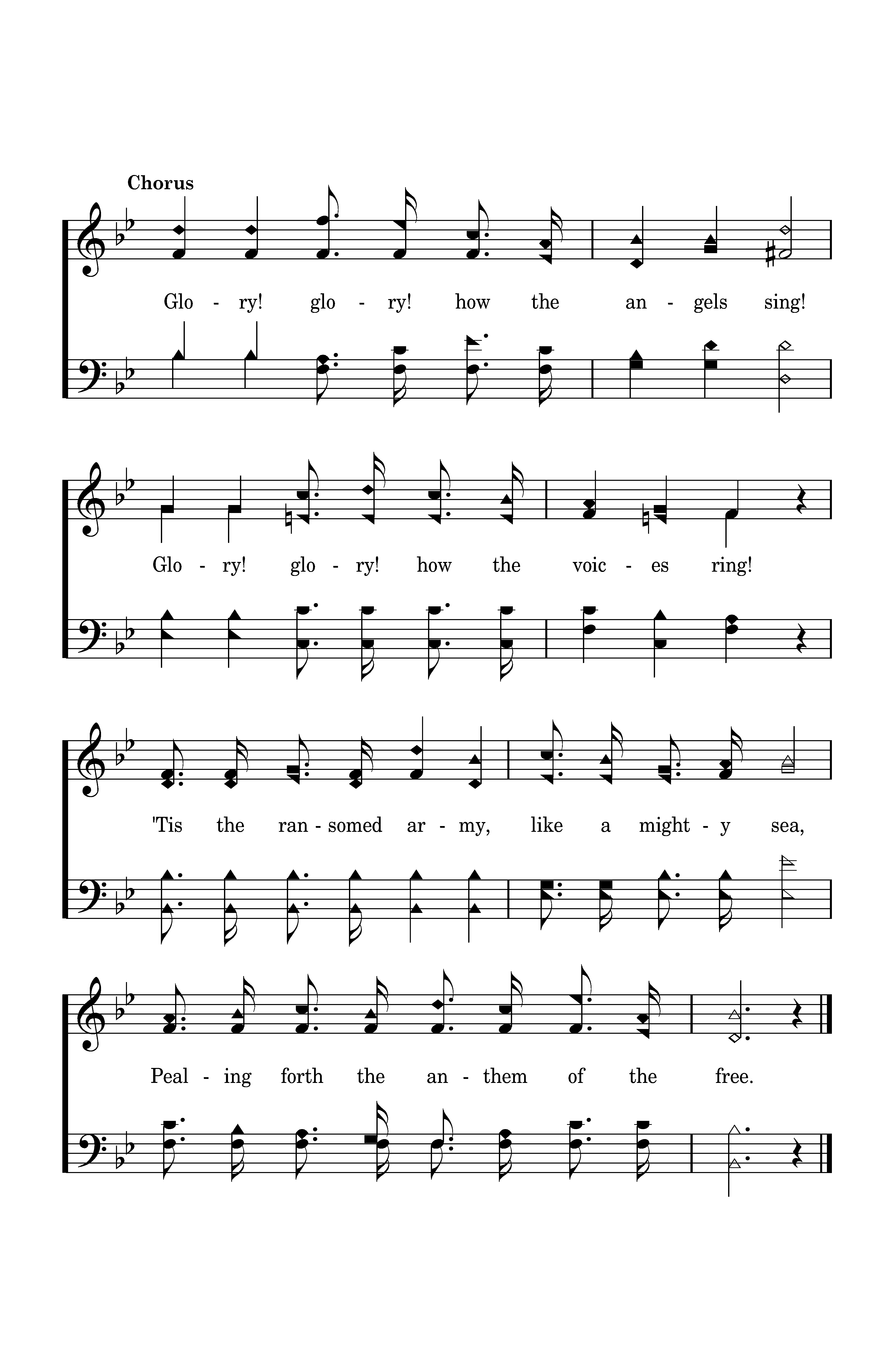 Glory! glory! how the angels sing! Glory! glory! how the voices ring! 'Tis the ransomed army, like a mighty sea, Pealing forth the anthem of the free.