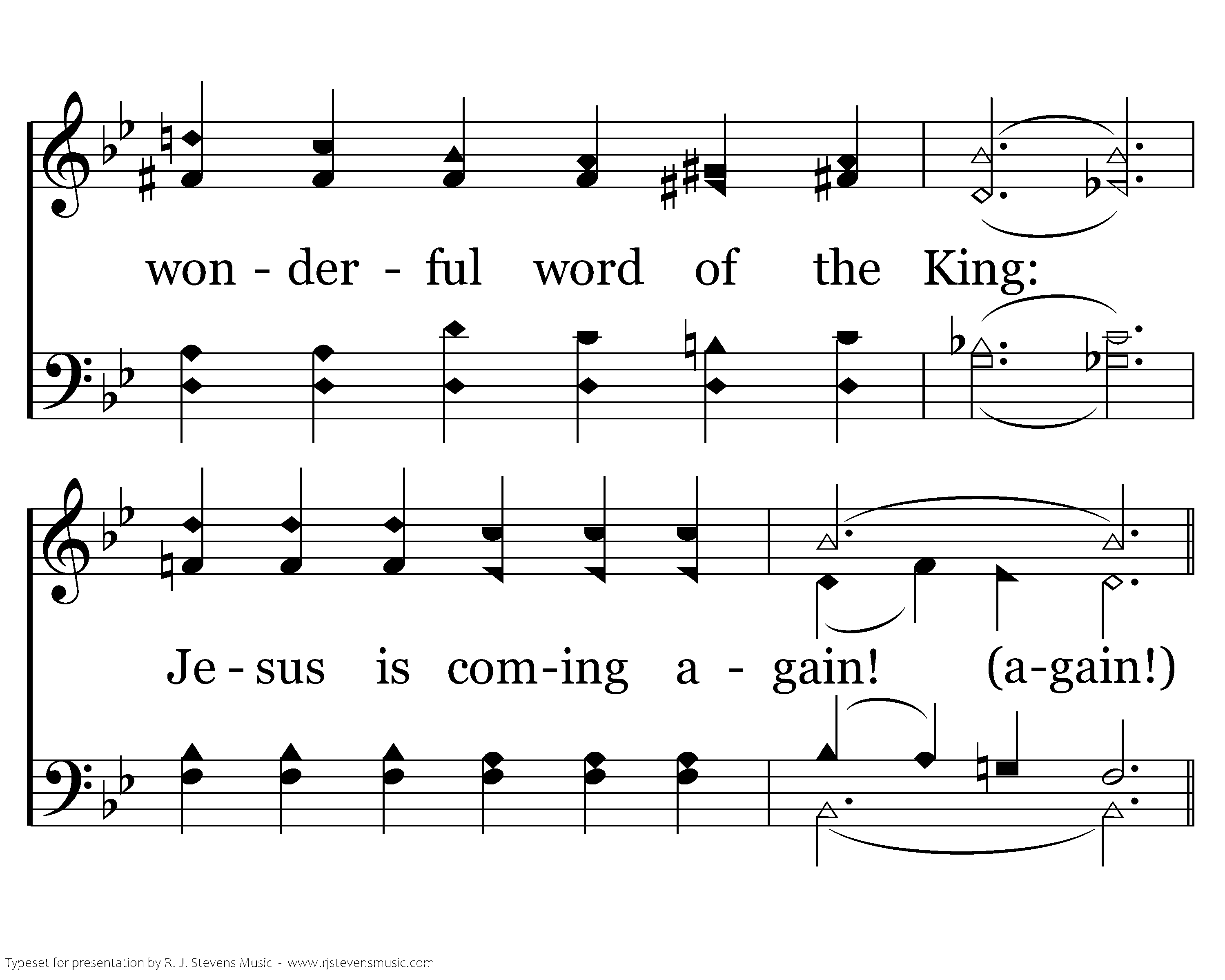 Marvelous message we bring, glorious carol we sing, wonderful word of the King: Jesus is coming again!