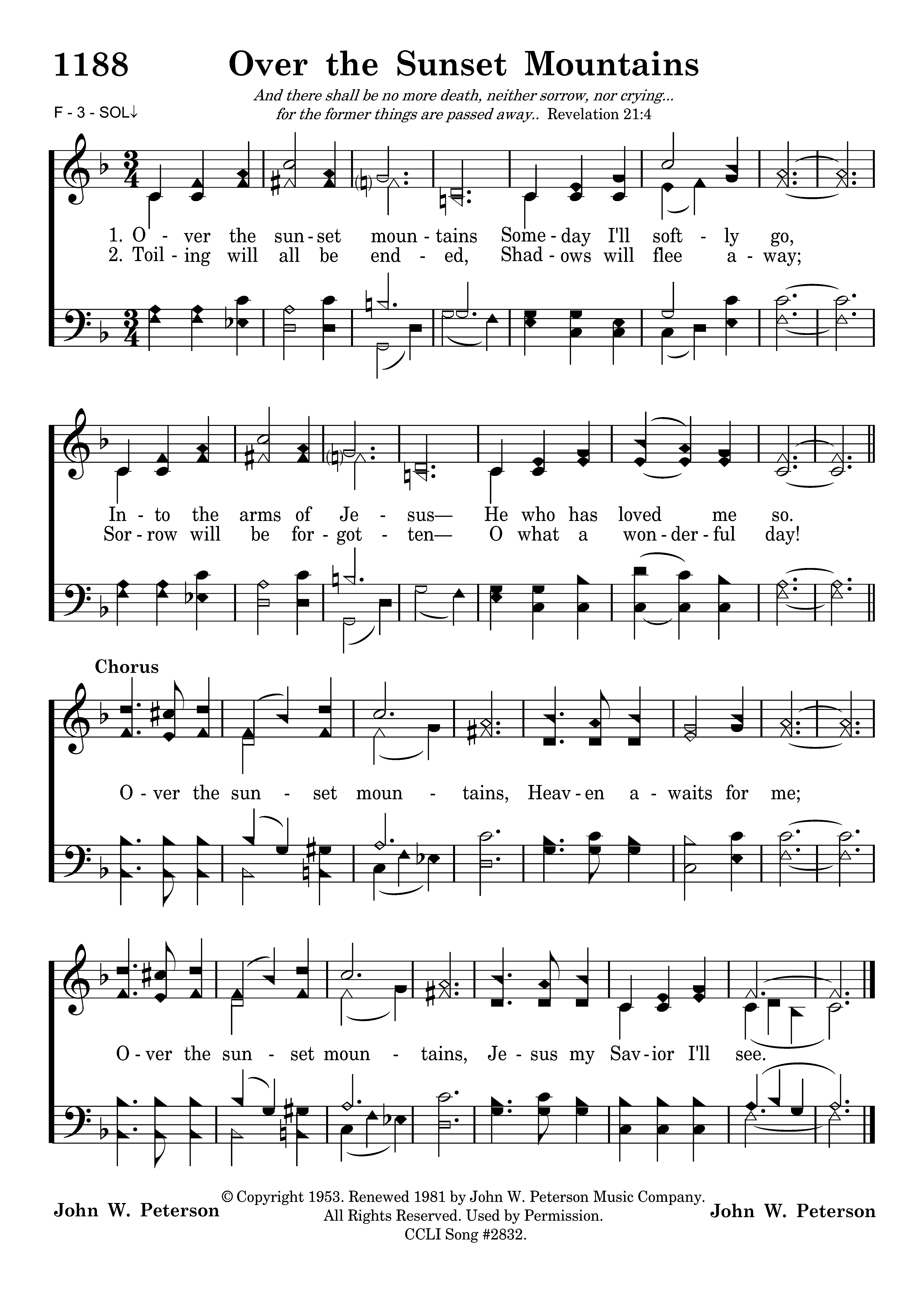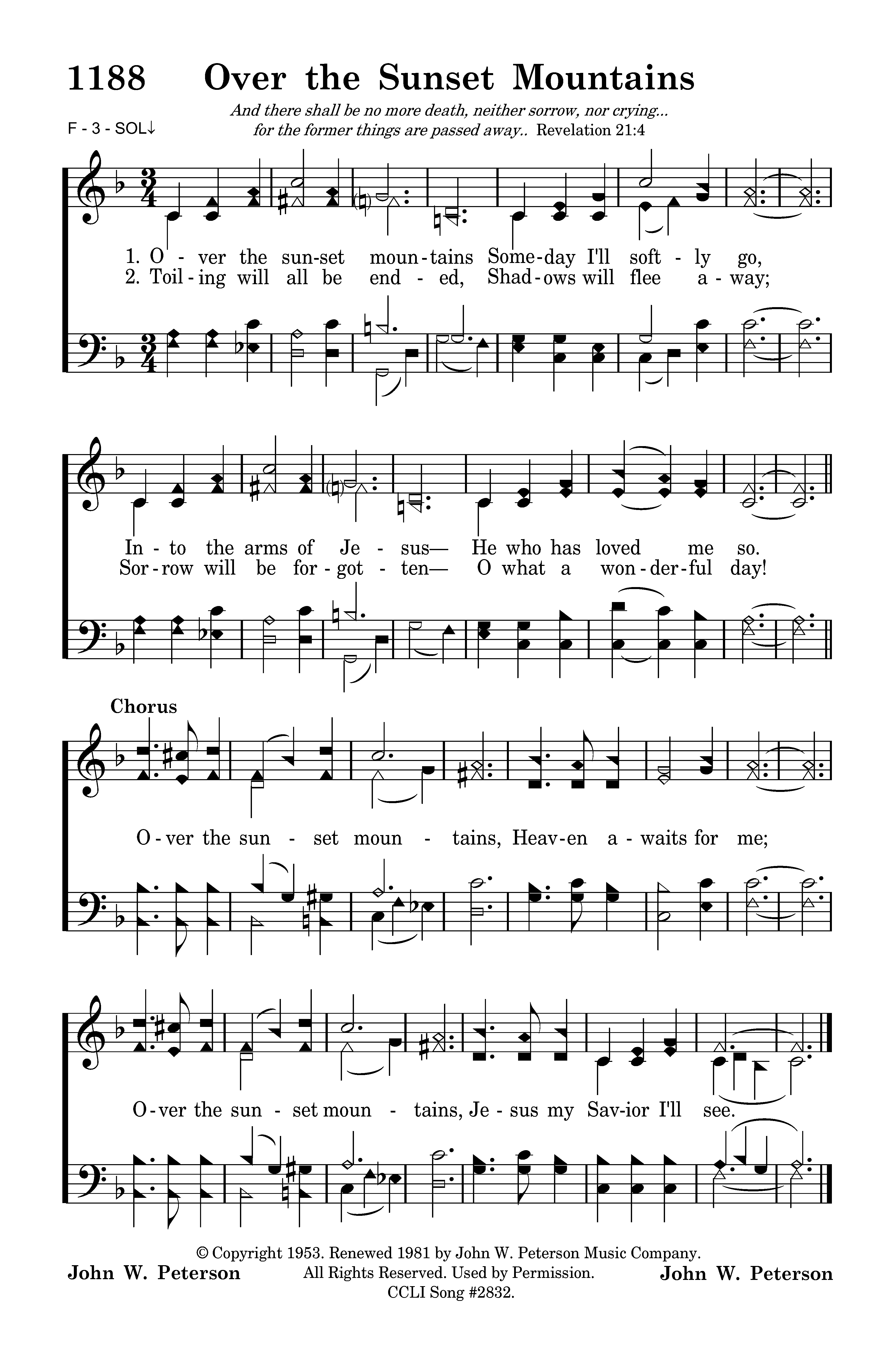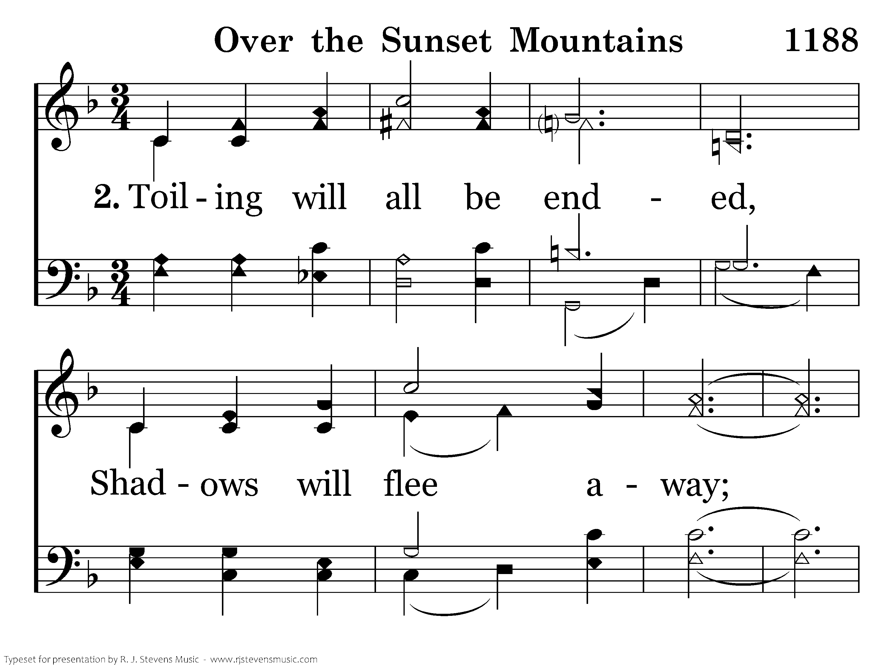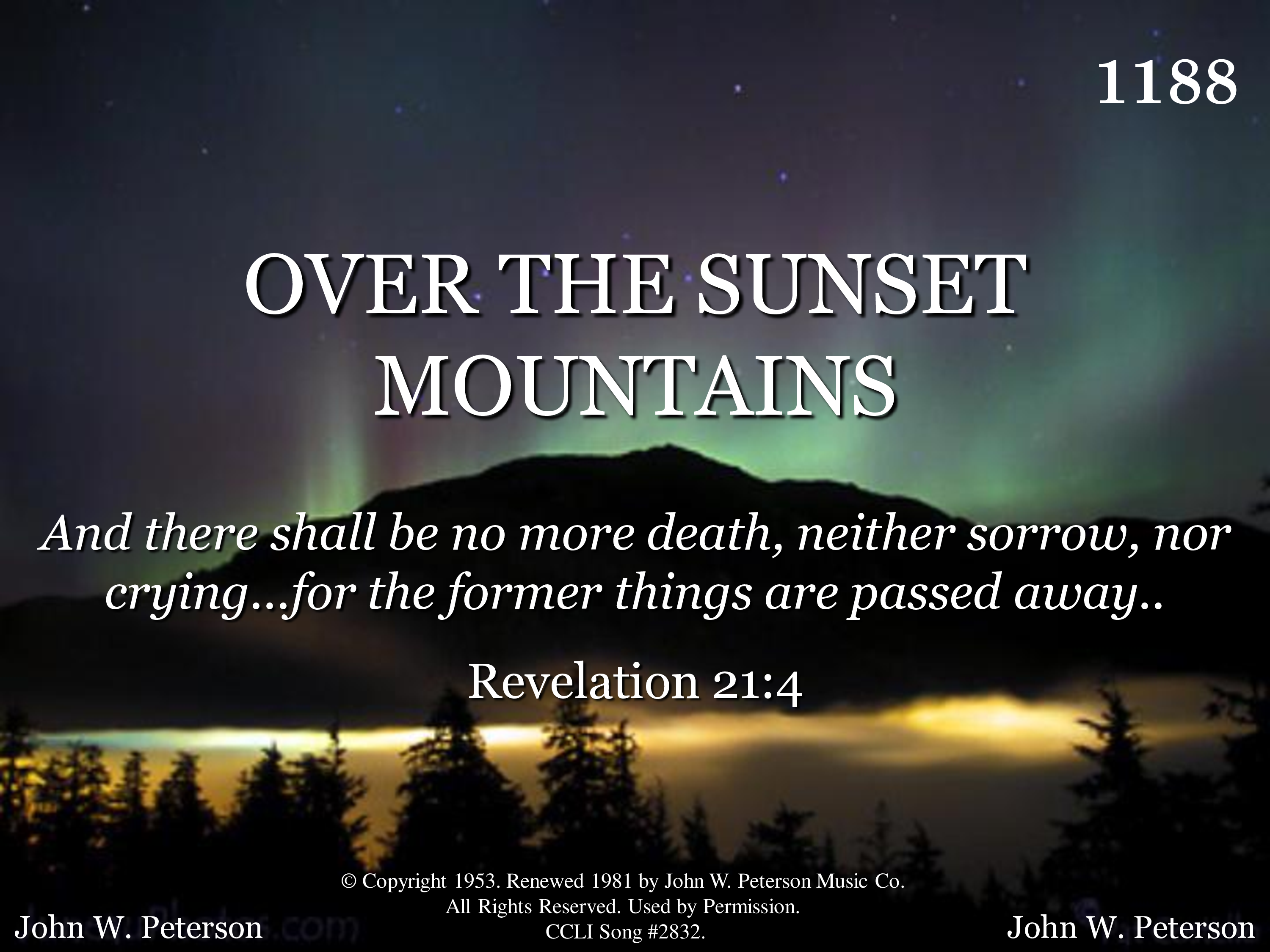 Over the sunset mountains, Heaven awaits for me; Over the sunset mountains, Jesus my Savior I'll see.