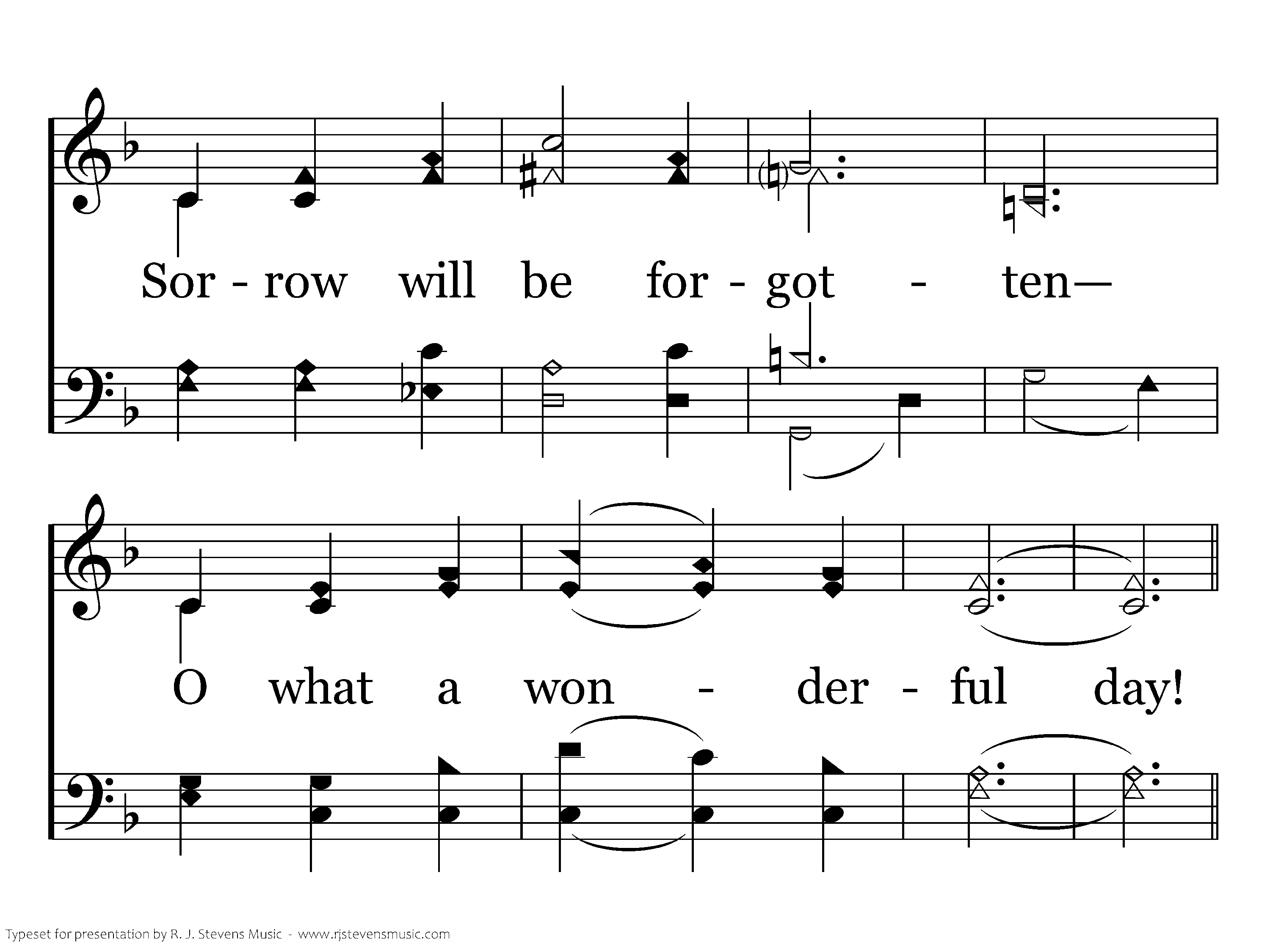 Toiling will all be ended, Shadows will flee away; Sorrow will be forgotten O what a wonderful day!