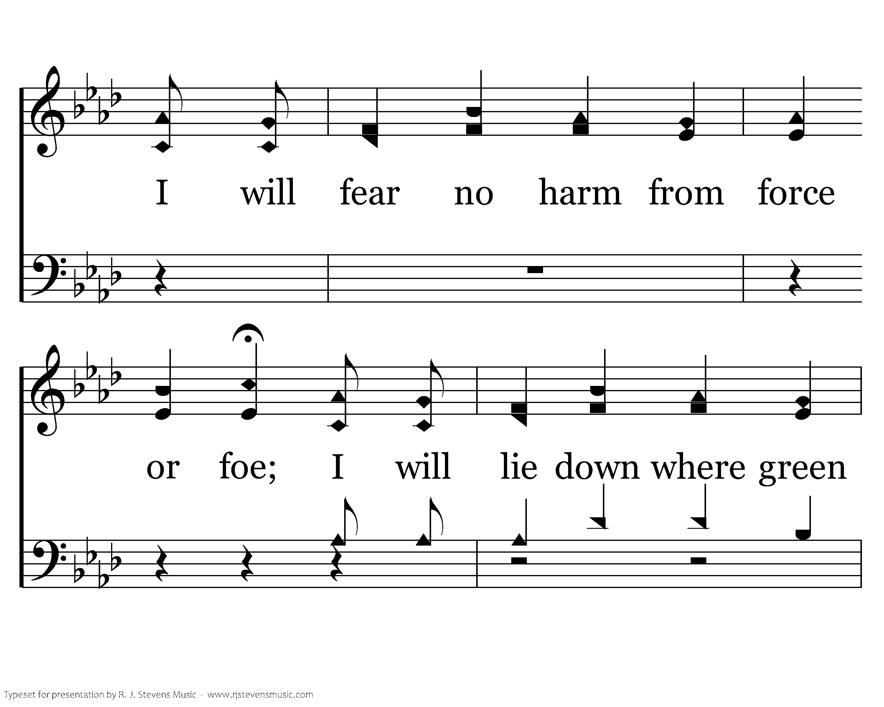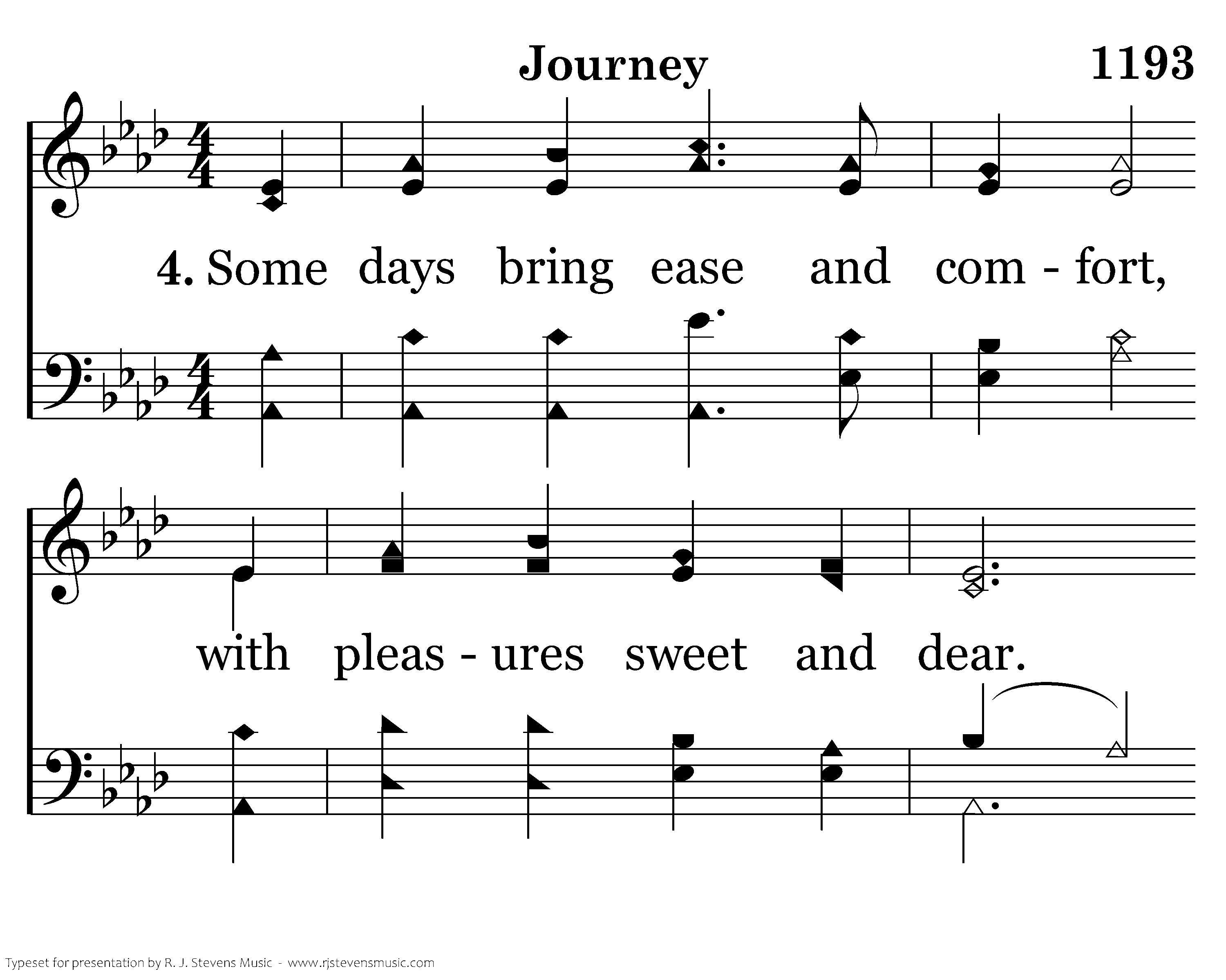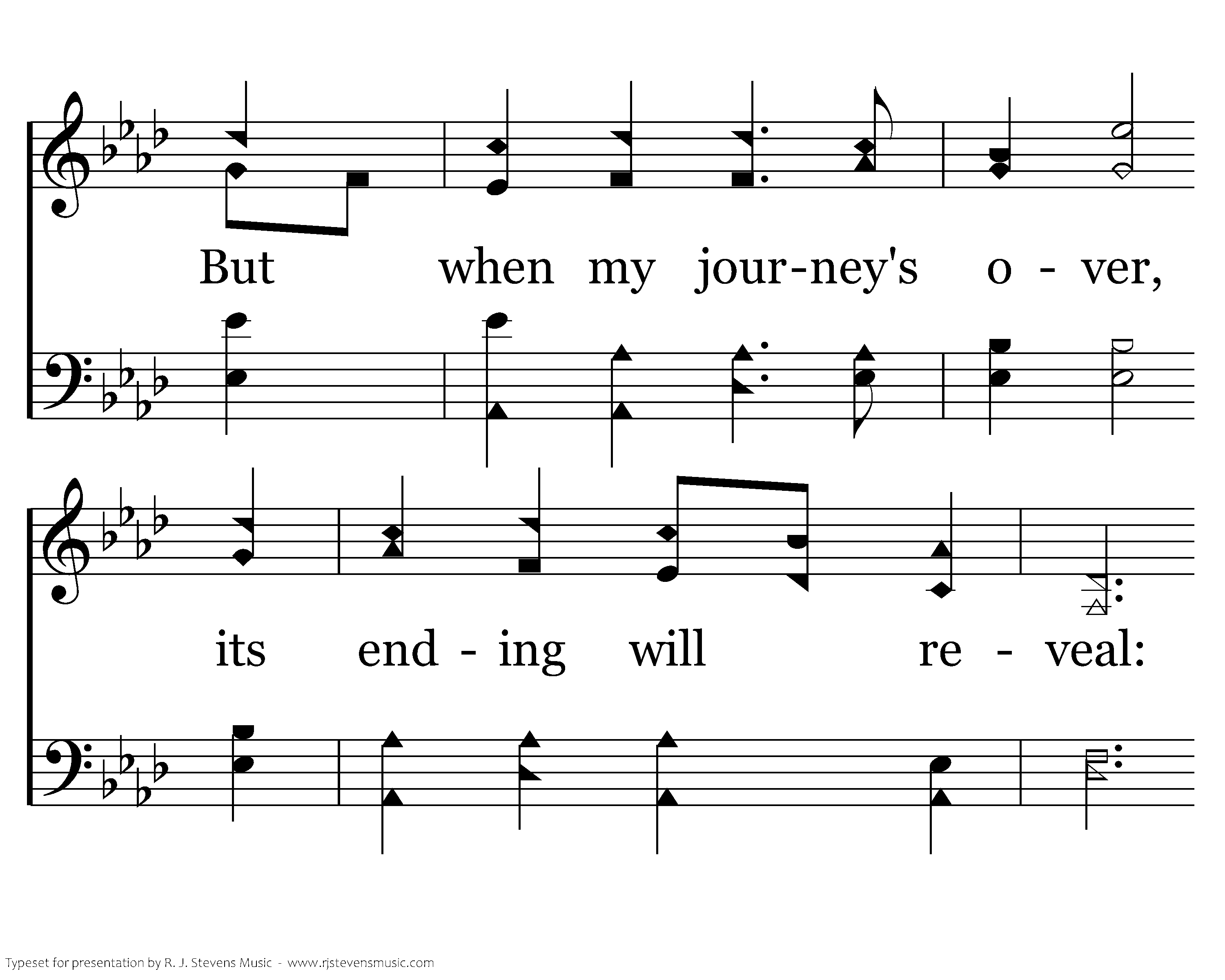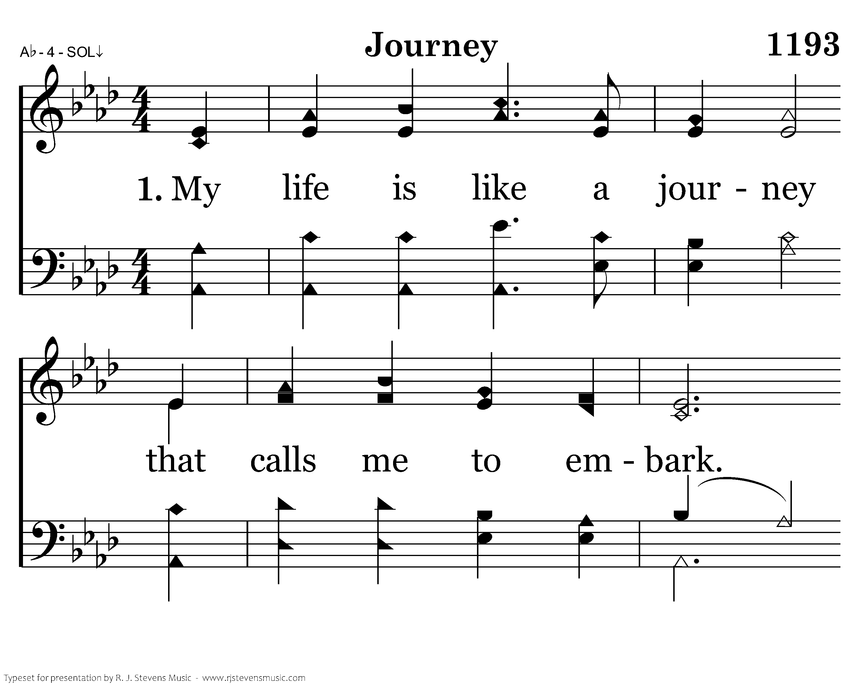 My life is like a journey that calls me to embark. Each day might pass thru sunlight, or lead where paths are dark. And tho' I walk the valley where shades of death appear, I will fear no harm from force or foe; I will lie down where green pastures grow; I will rest where gentle waters flow; For I know that God is near.