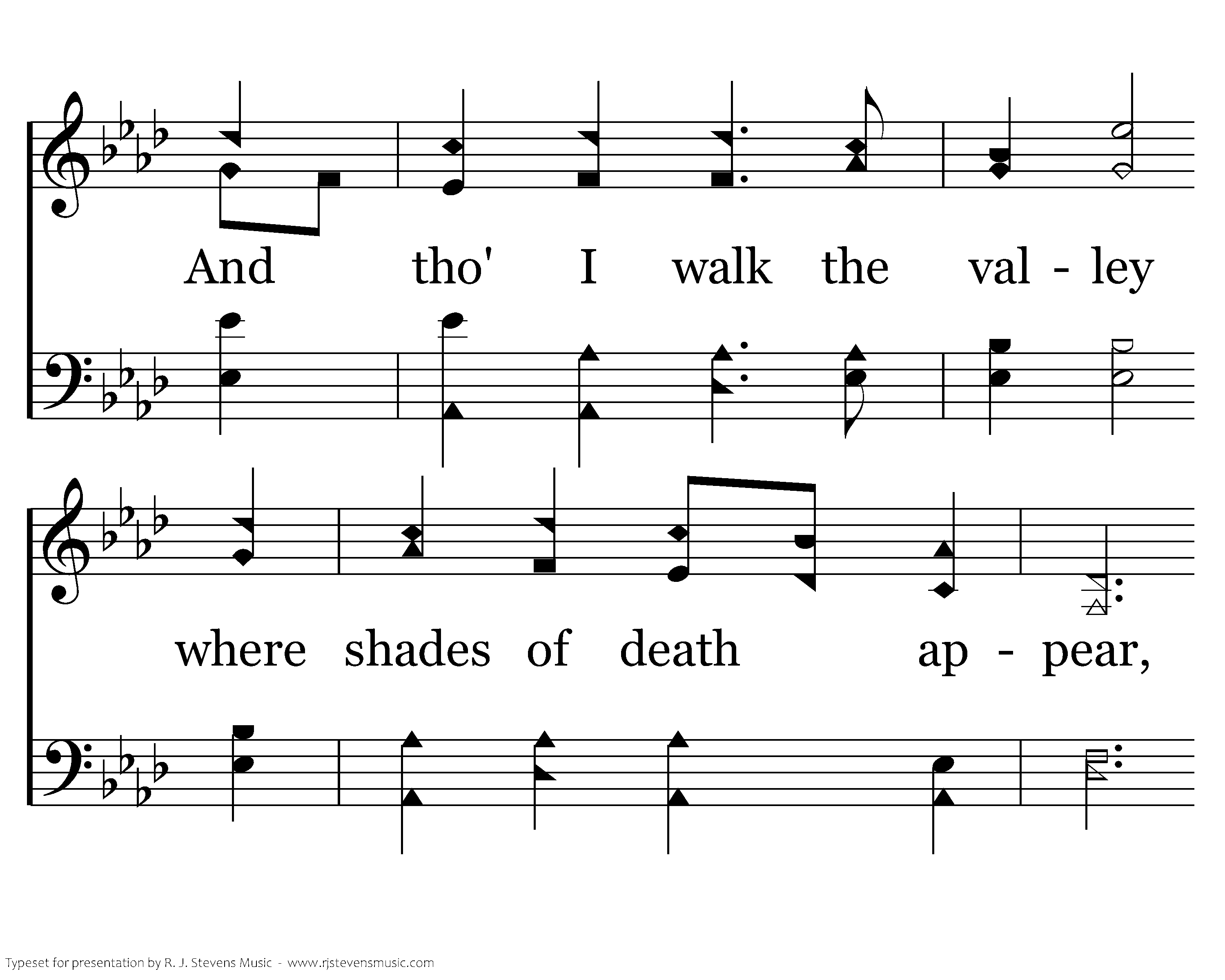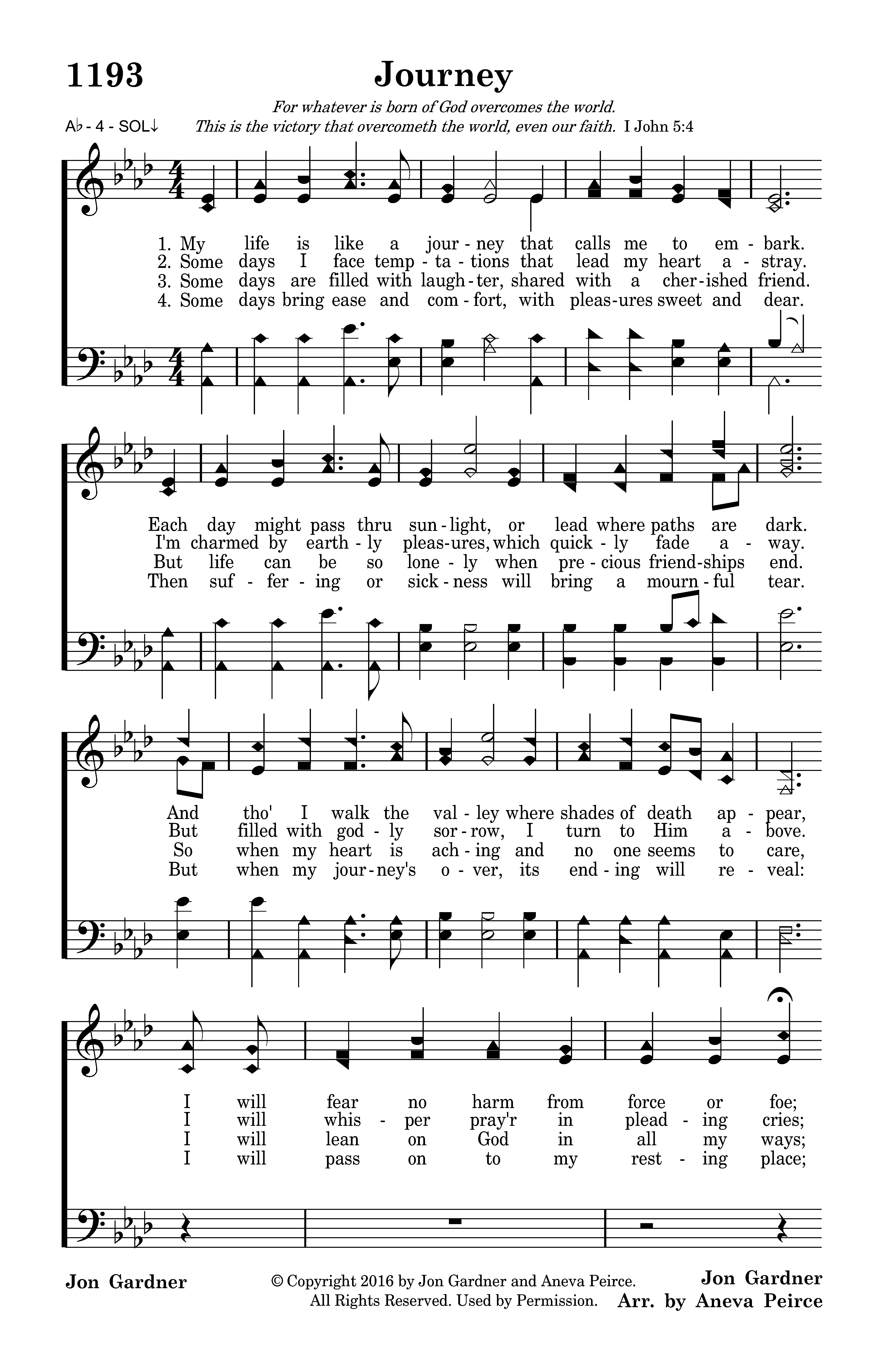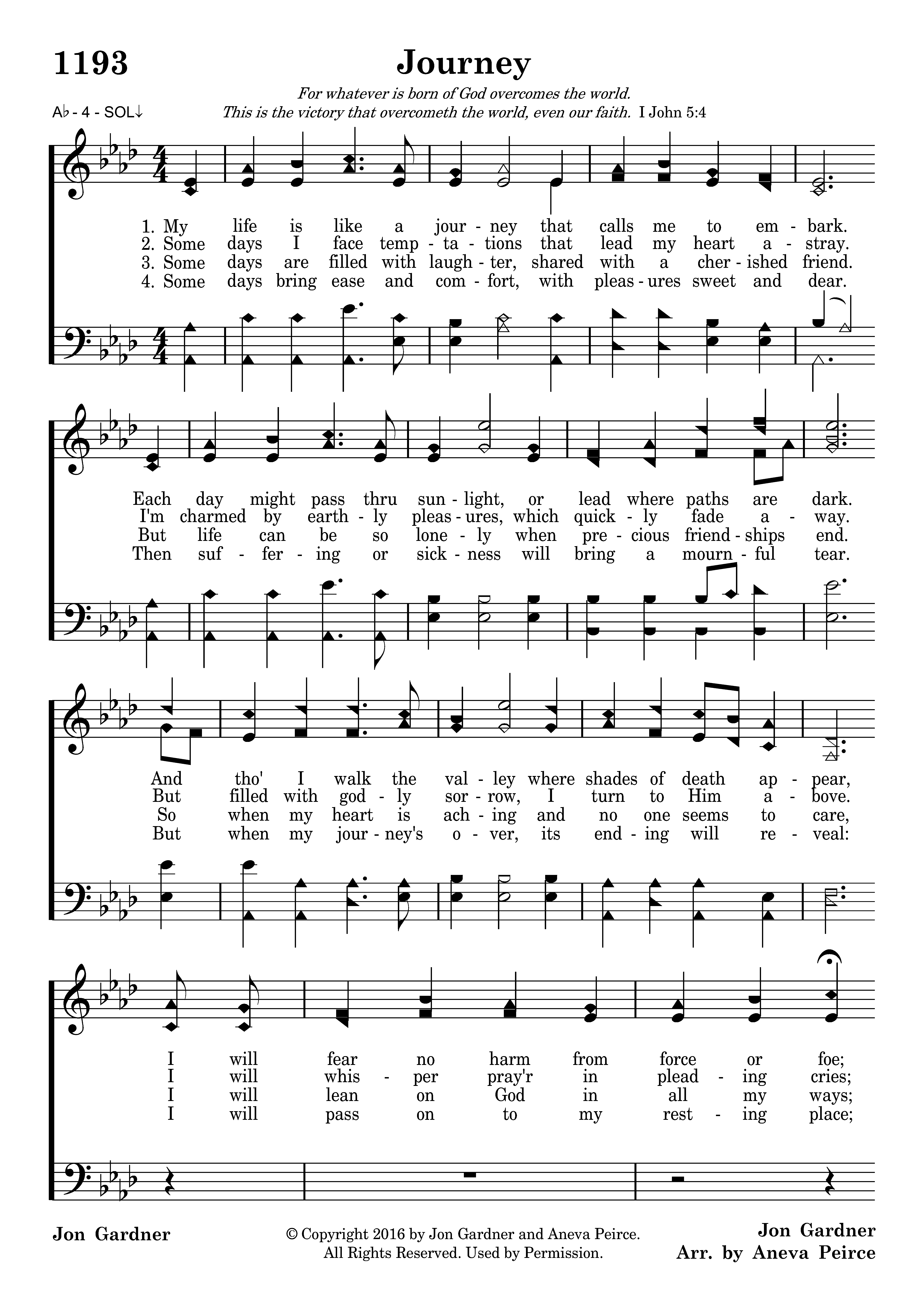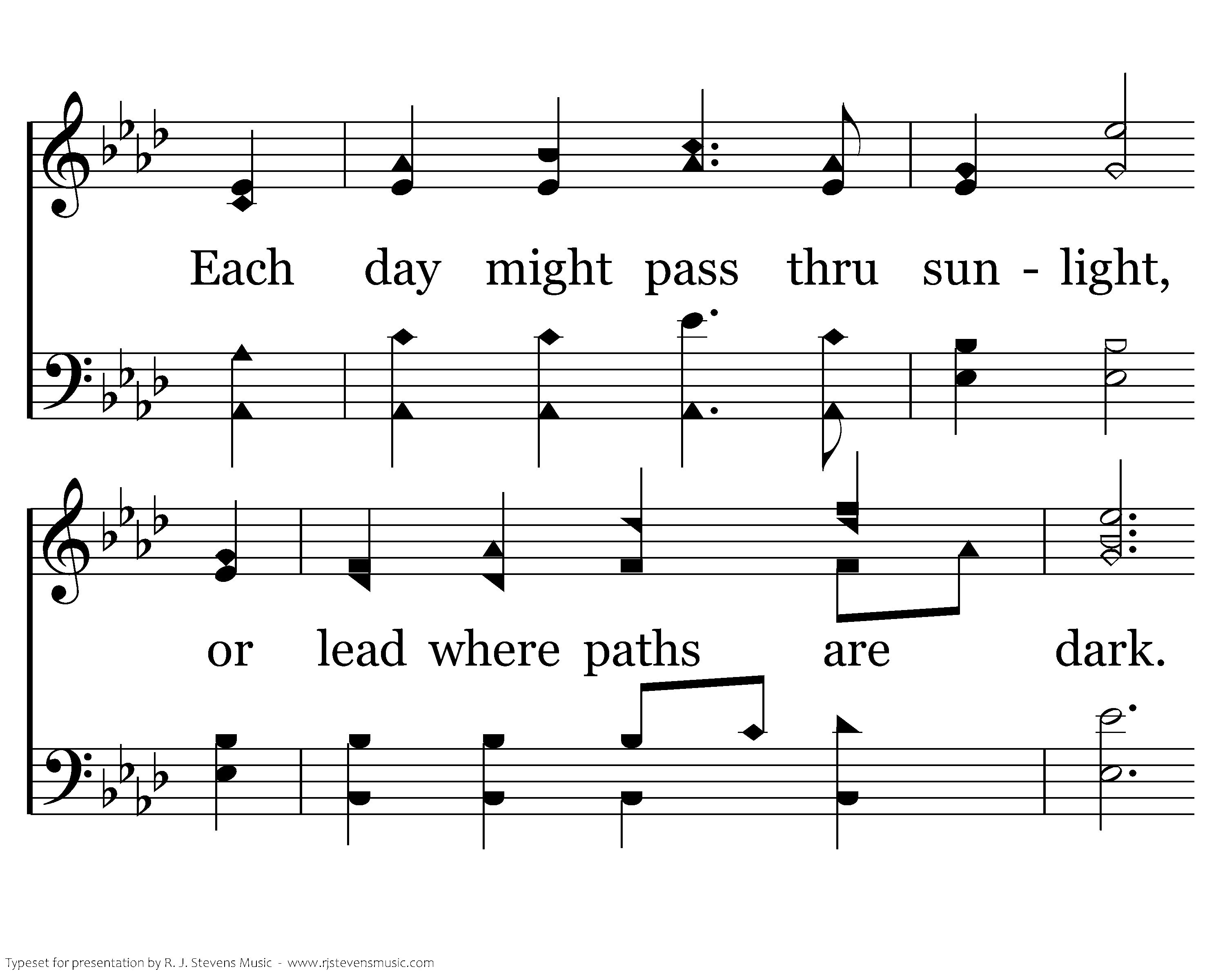 My life is like a journey that calls me to embark. Each day might pass thru sunlight, or lead where paths are dark. And tho' I walk the valley where shades of death appear, I will fear no harm from force or foe; I will lie down where green pastures grow; I will rest where gentle waters flow; For I know that God is near.