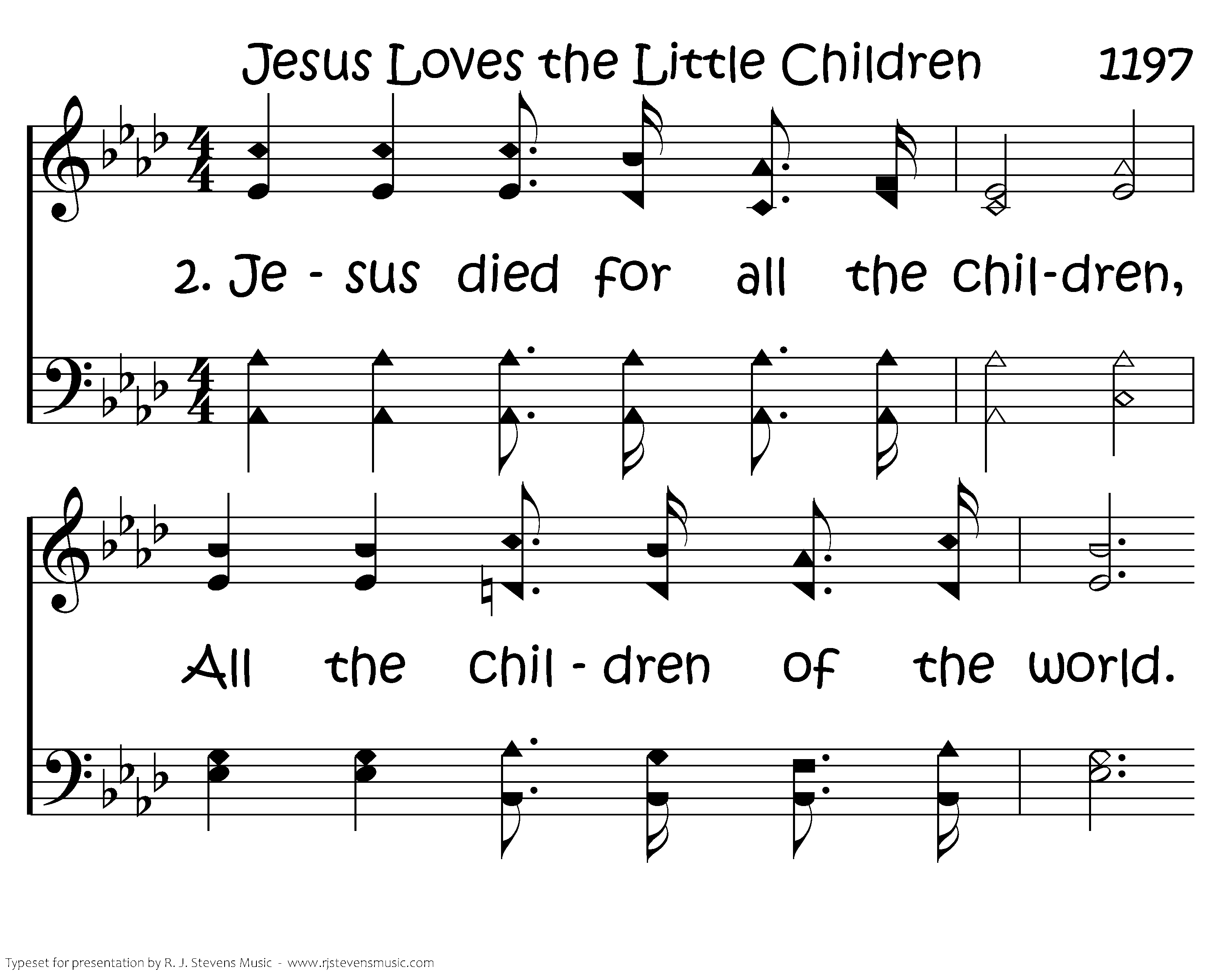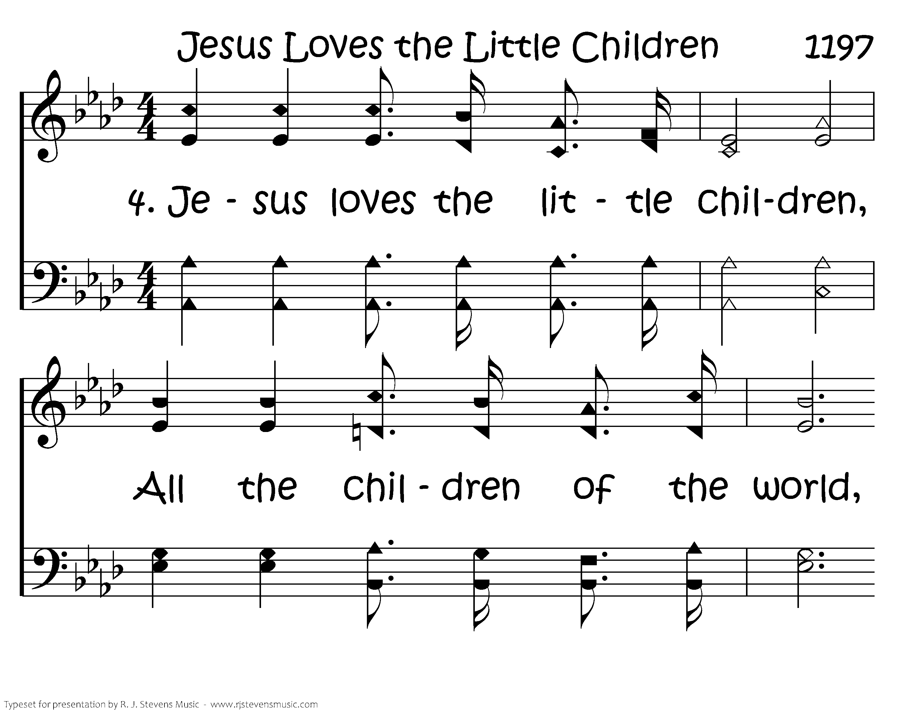 Jesus loves the little children, All the children of the world. Red, brown, yellow, black and white, They are precious in His sight Jesus loves the little children of the world.