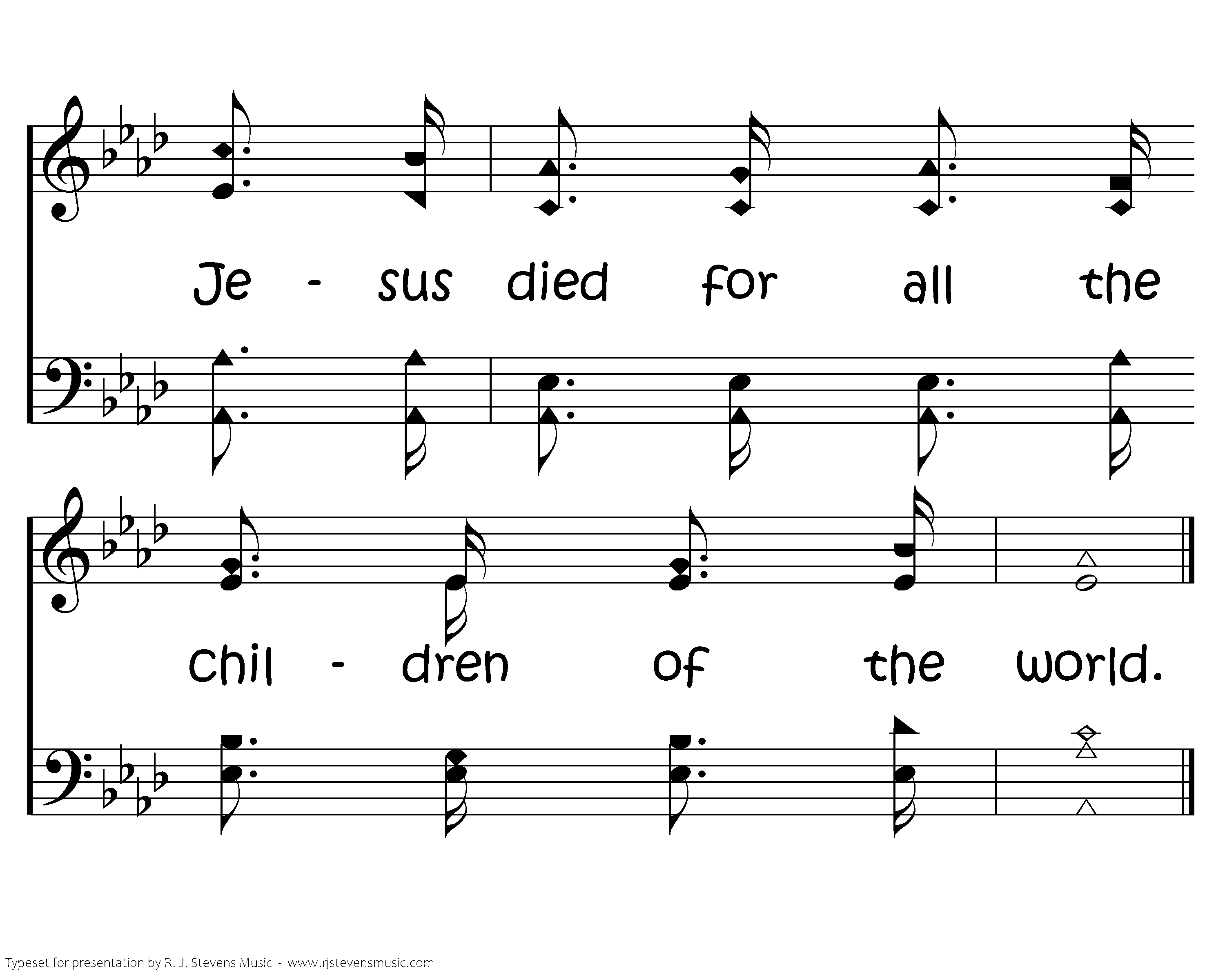 Jesus died for all the children, All the children of the world. Red, brown, yellow, black and white, They are precious in His sight Jesus died for all the children of the world.