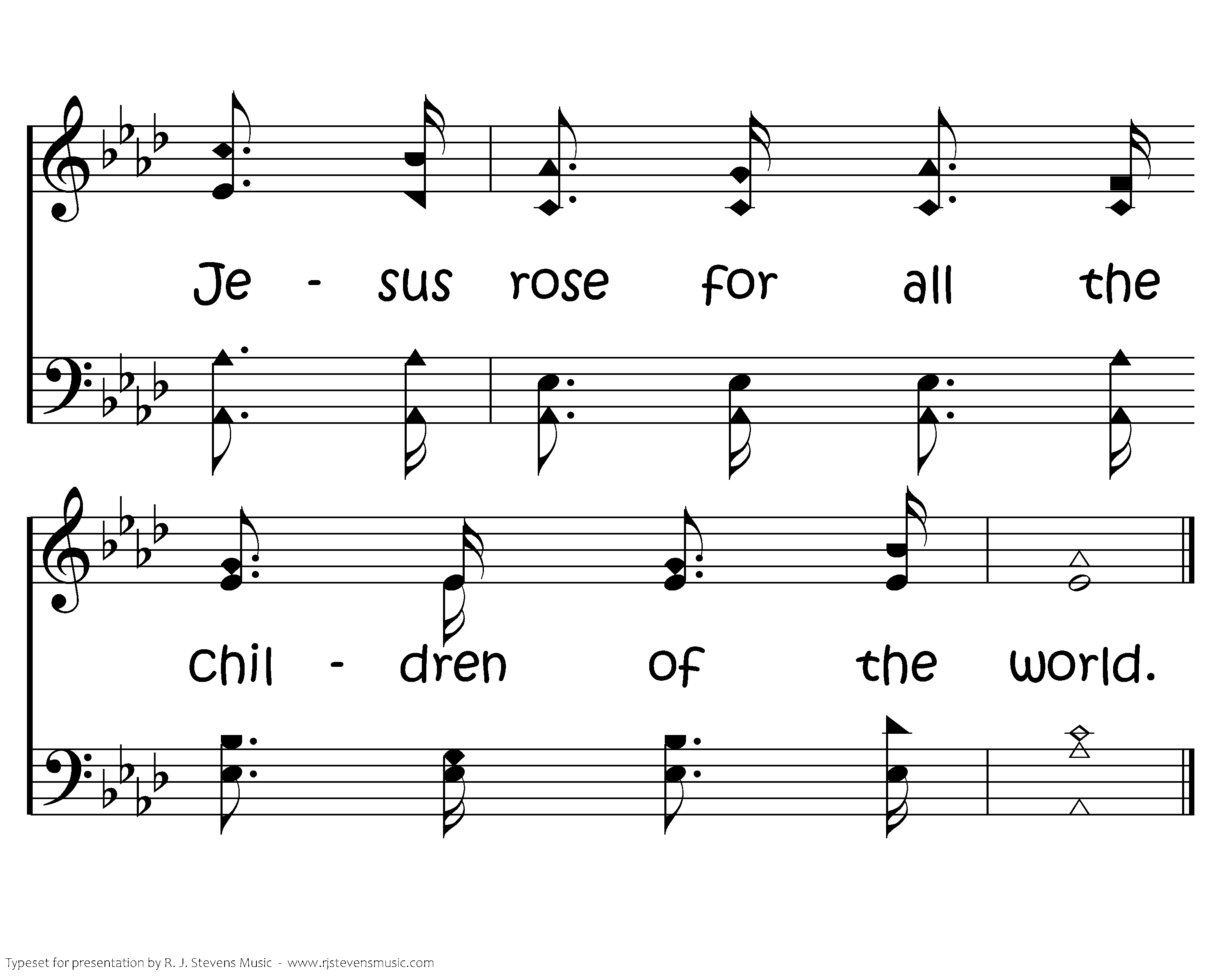 Jesus rose for all the children, All the children of the world. Red, brown, yellow, black and white, They are precious in His sight Jesus rose for all the children of the world.