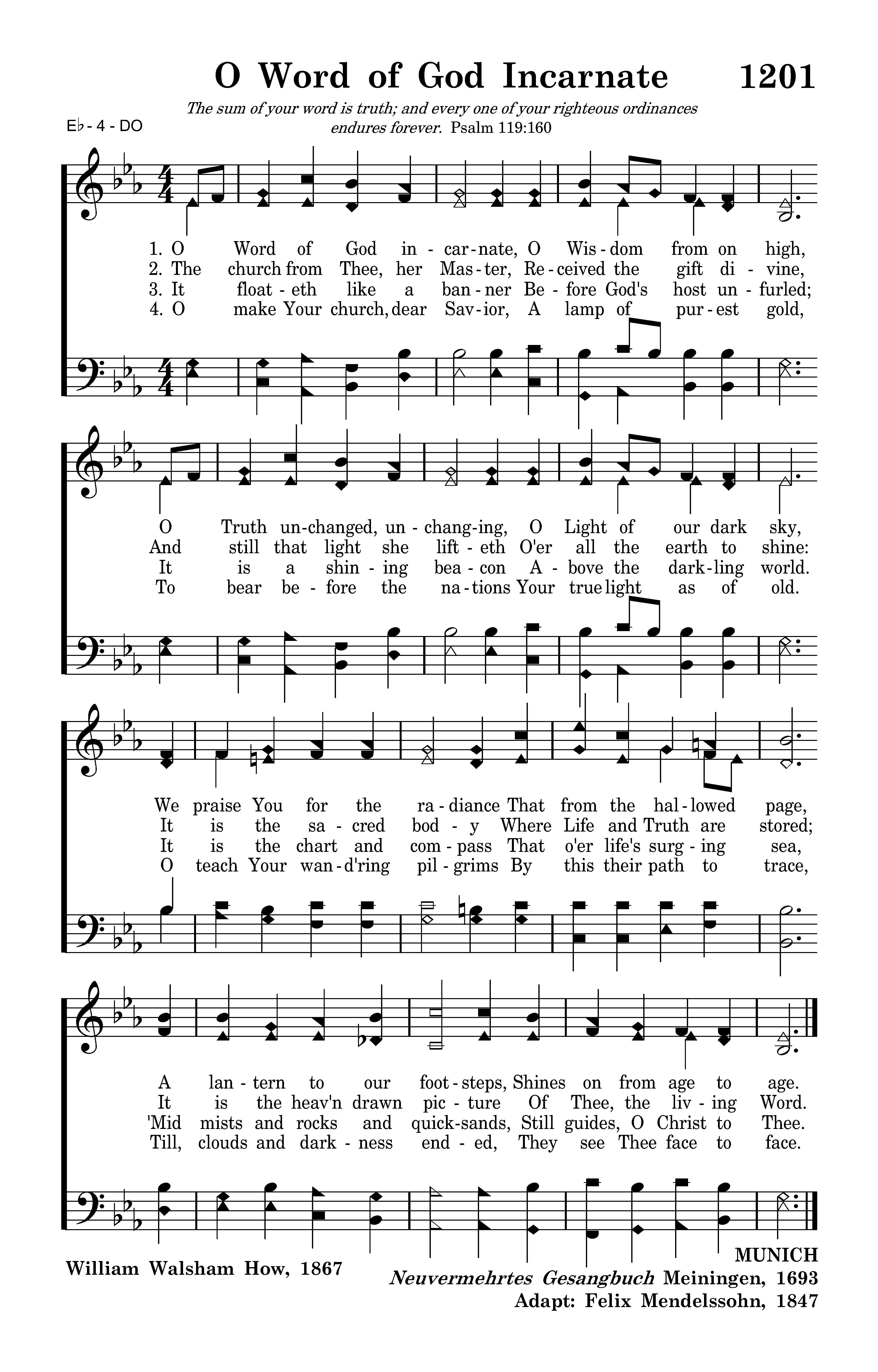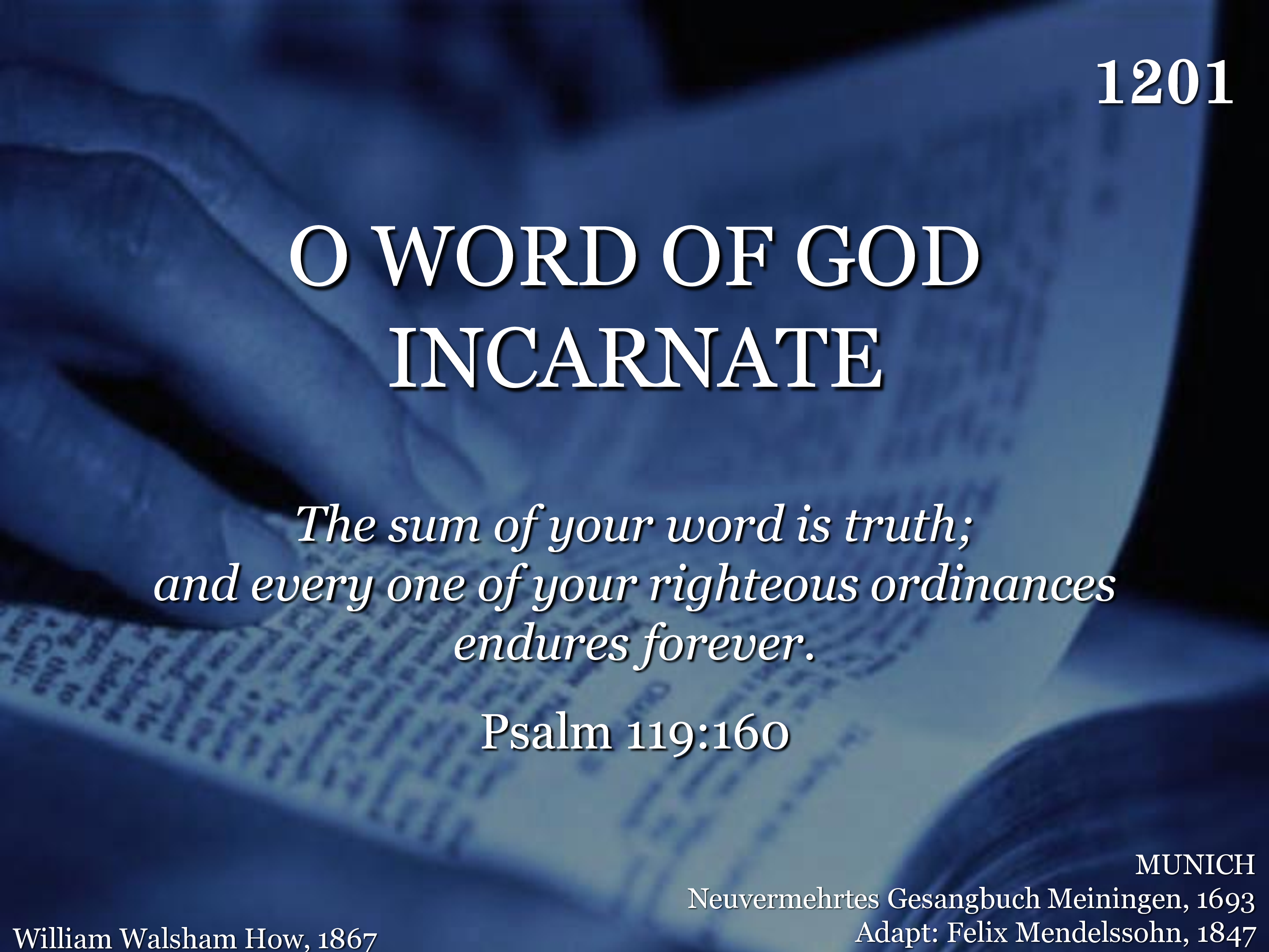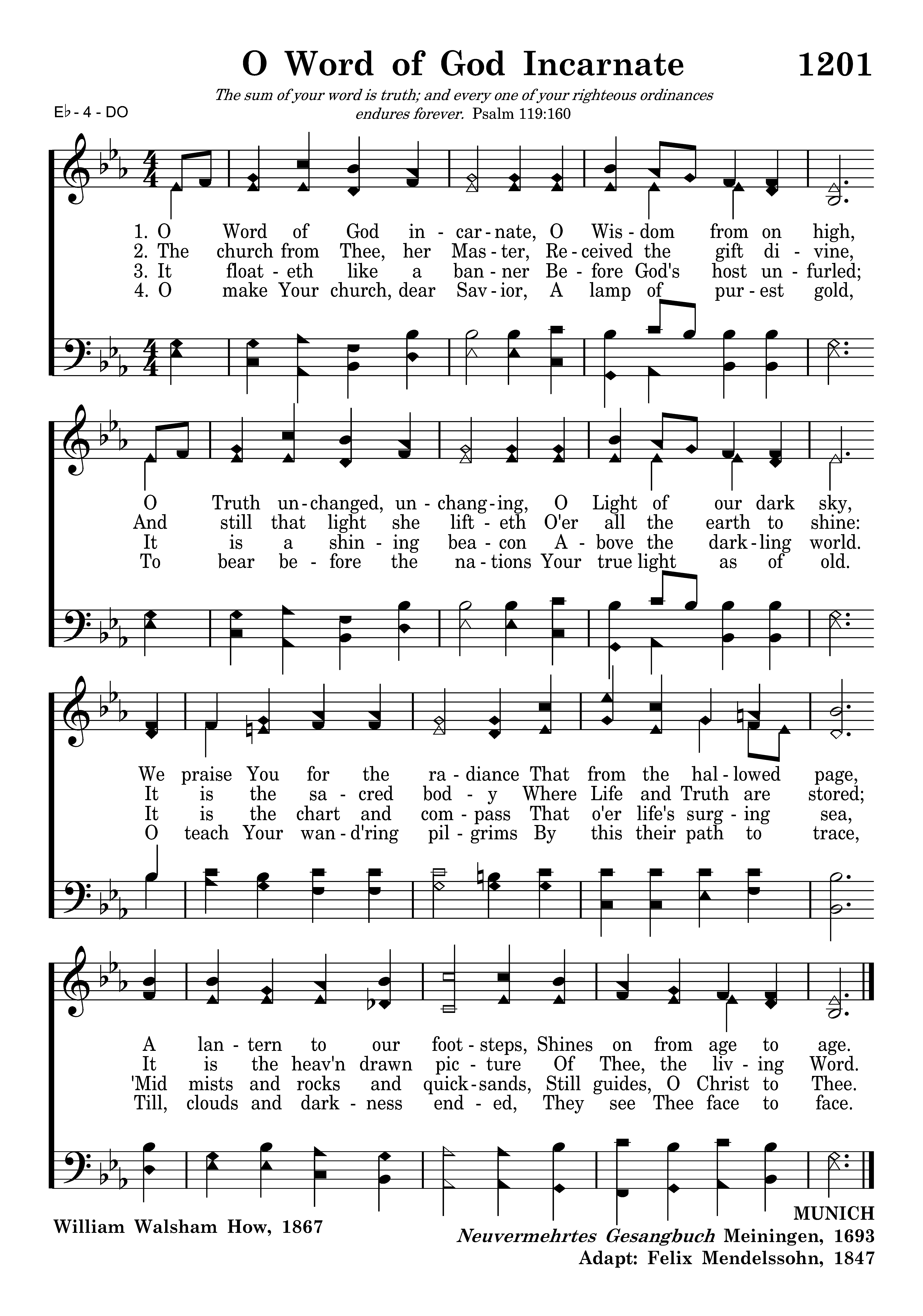 O Word of God incarnate, O Wisdom from on high, O Truth unchanged, unchanging, O Light of our dark sky, We praise You for the radiance That from the hallowed page, A lantern to our footsteps, Shines on from age to age.