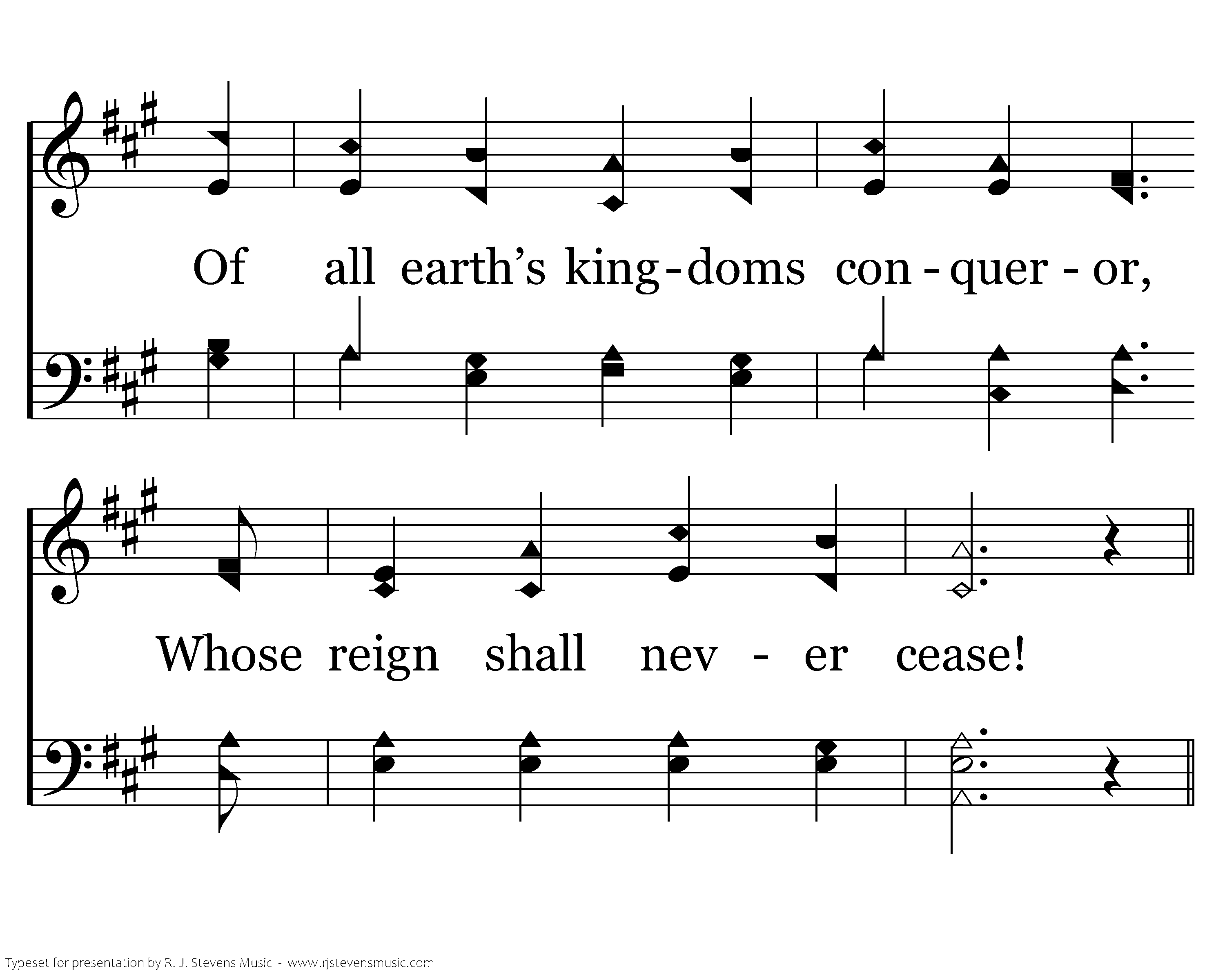 His name shall be the Counselor, The mighty Prince of Peace, Of all earth’s kingdoms conqueror, Whose reign shall never cease!