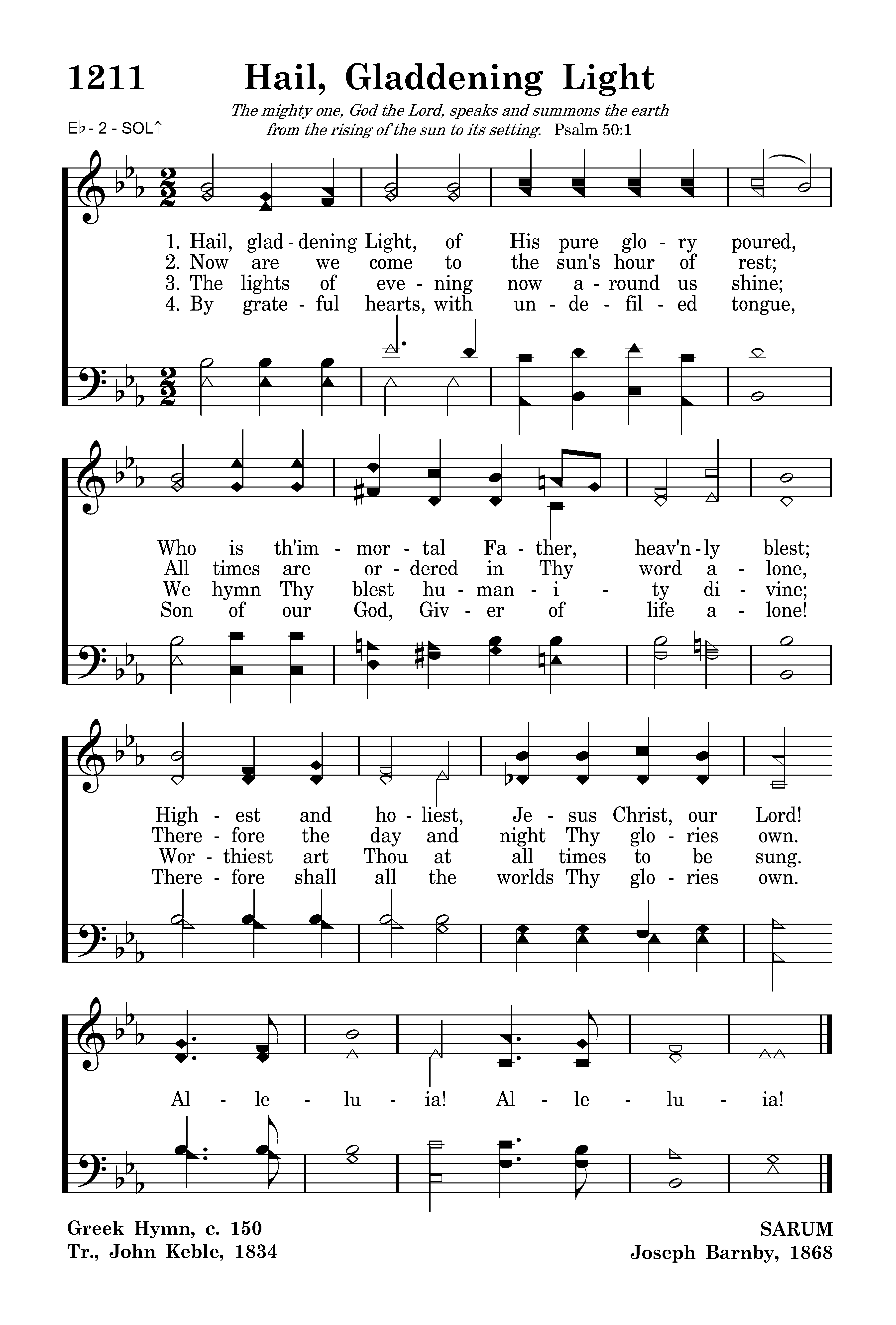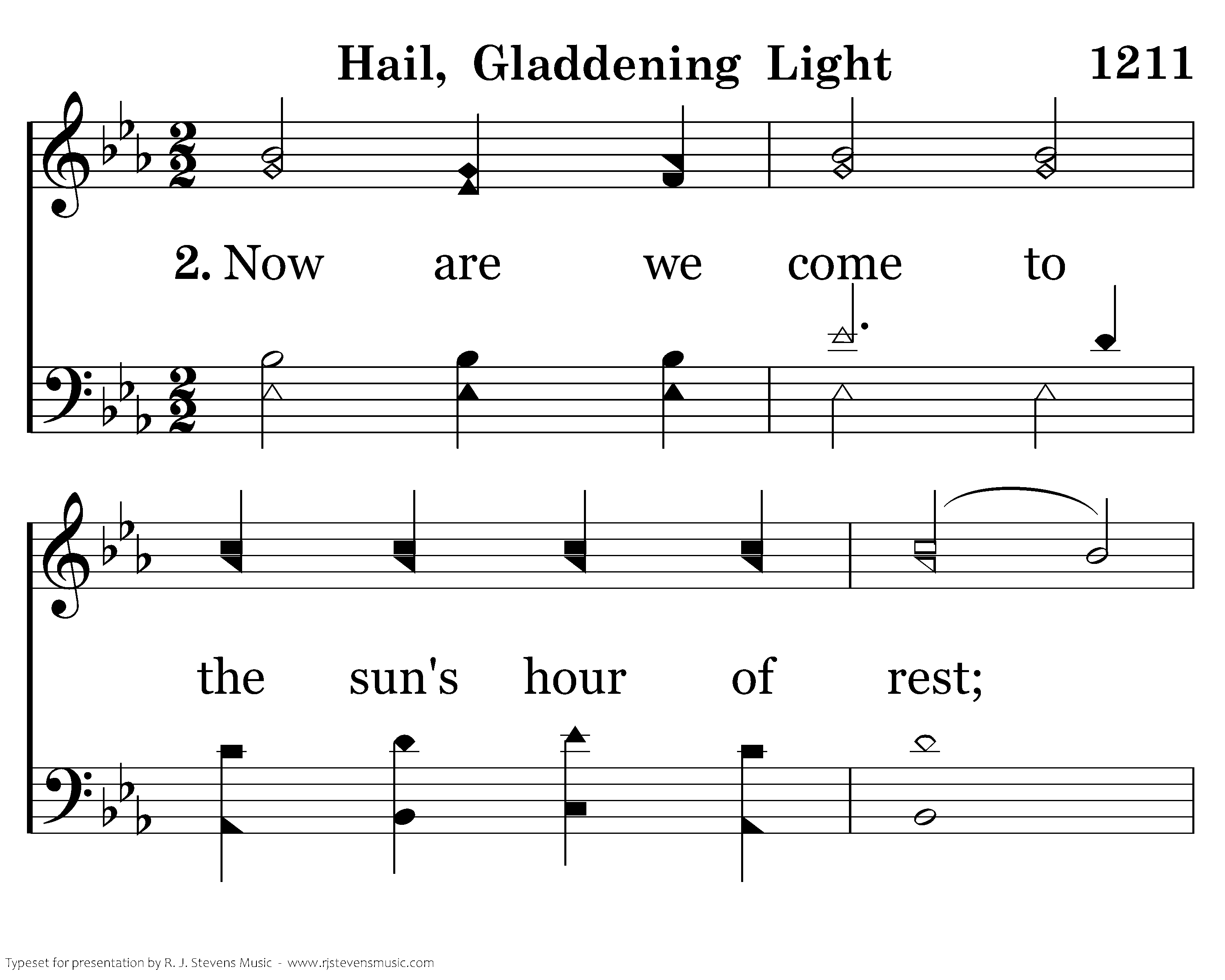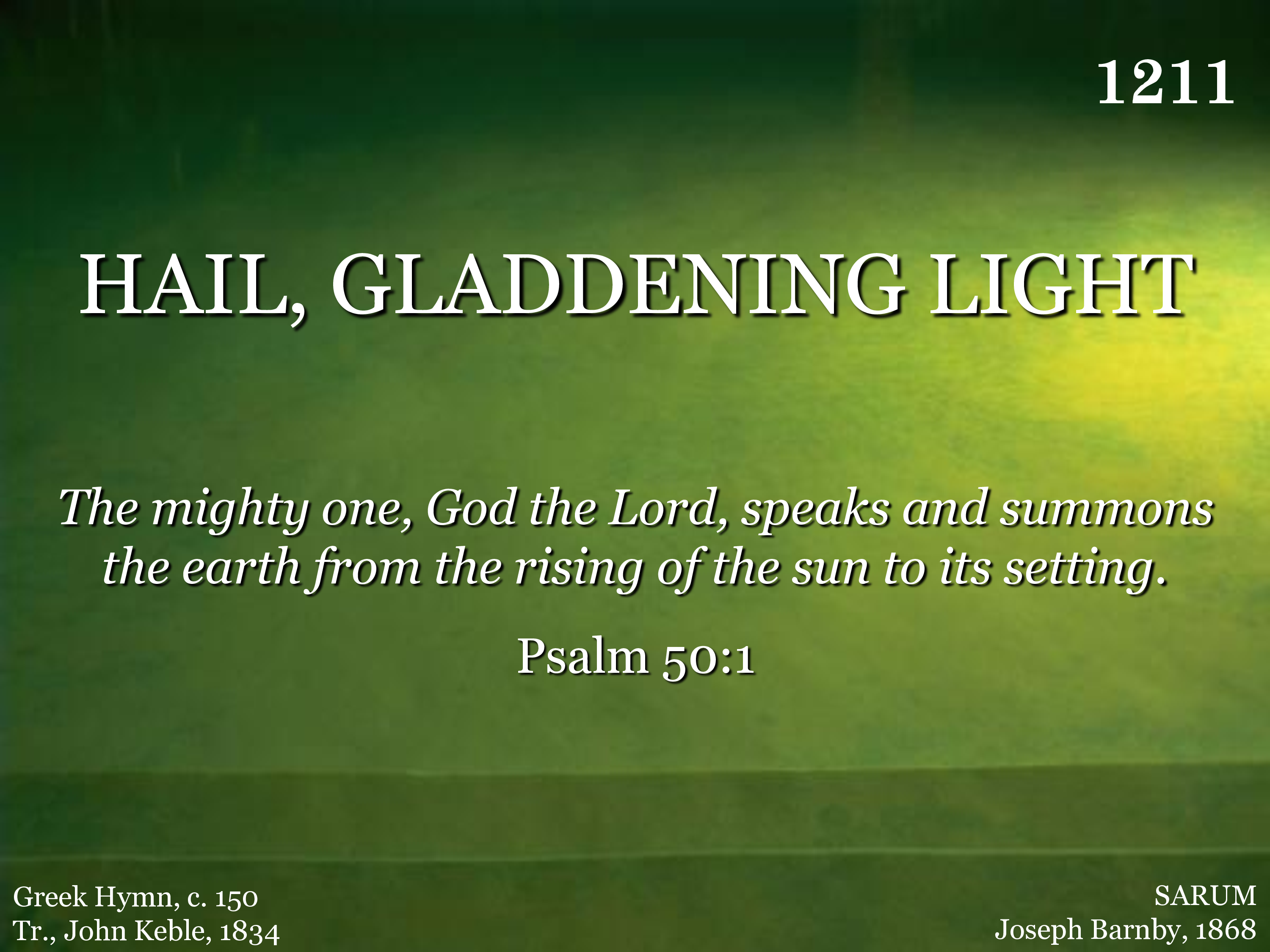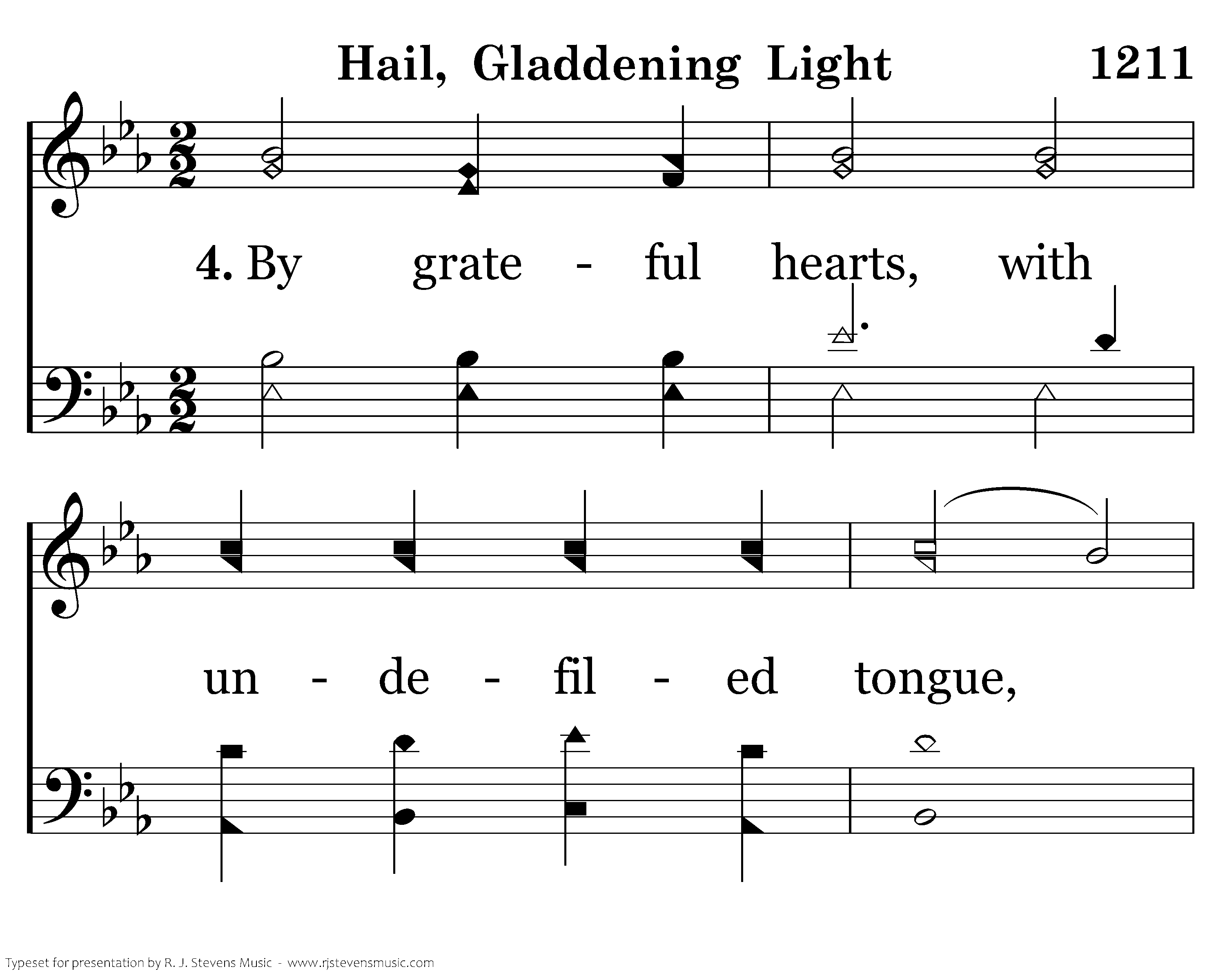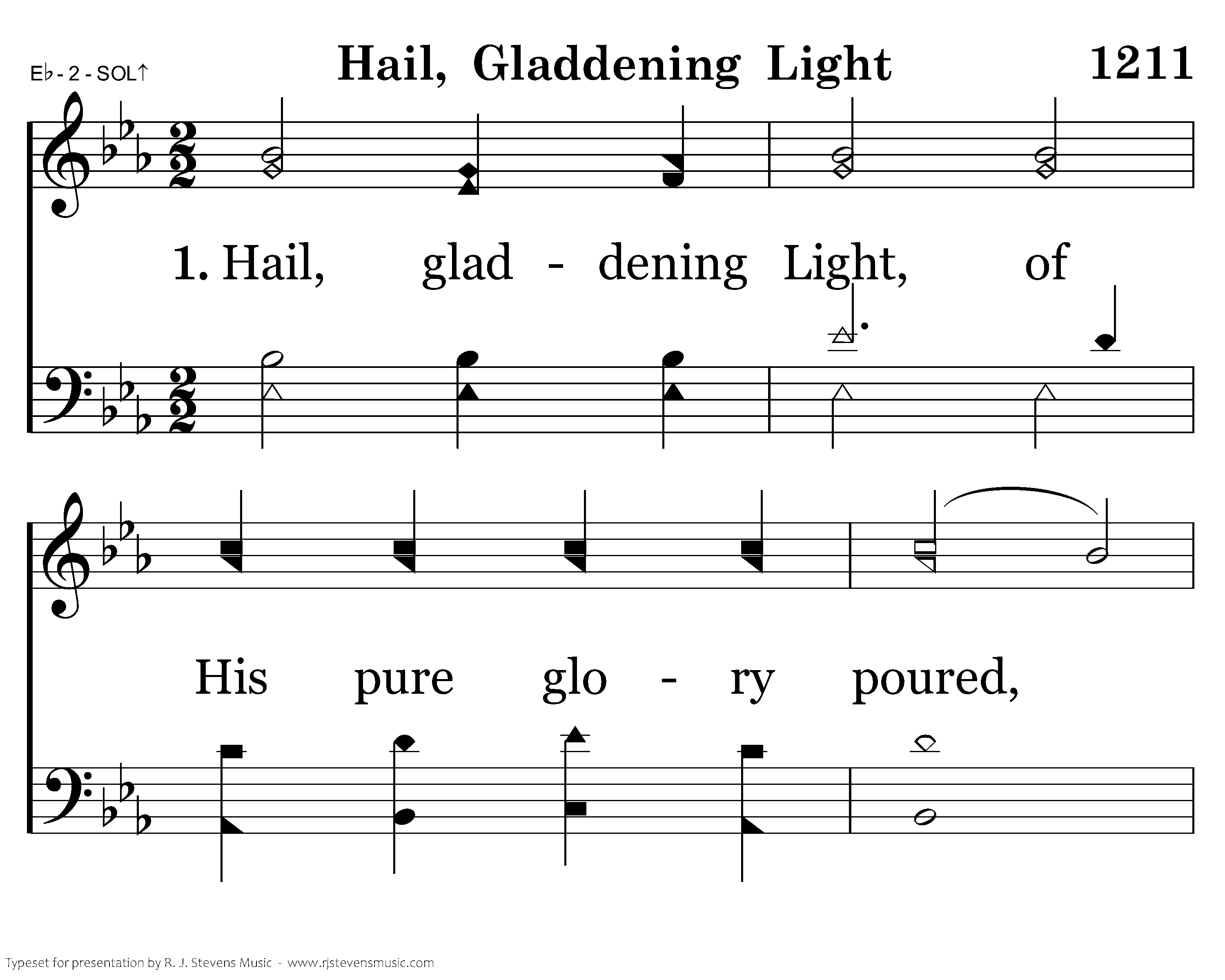 Hail, gladdening Light, of His pure glory poured, Who is th'immortal Father, heav'nly blest; Highest and holiest, Jesus Christ, our Lord! Alleluia! Alleluia!