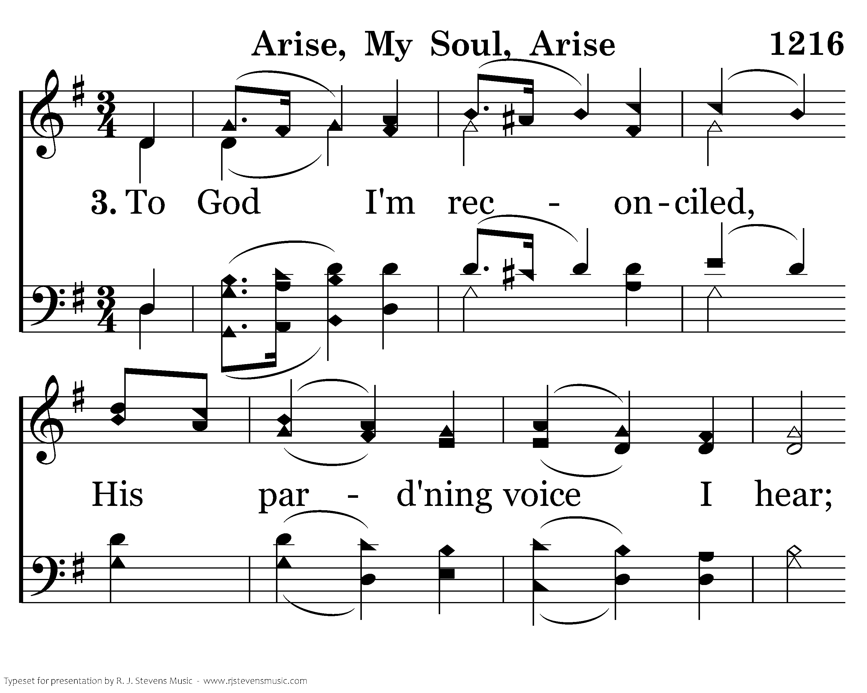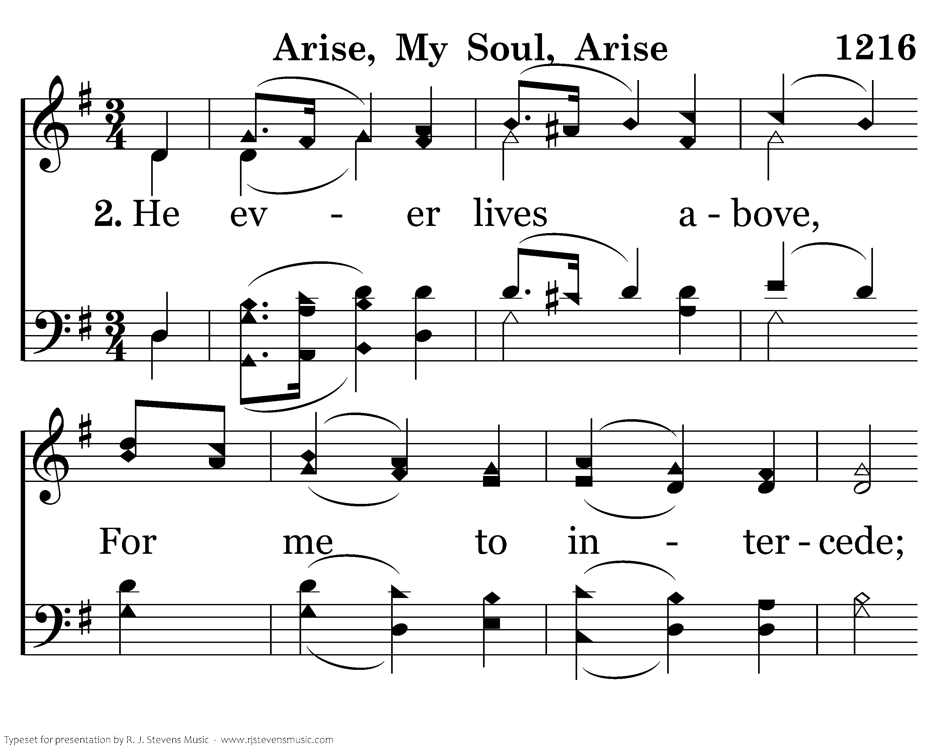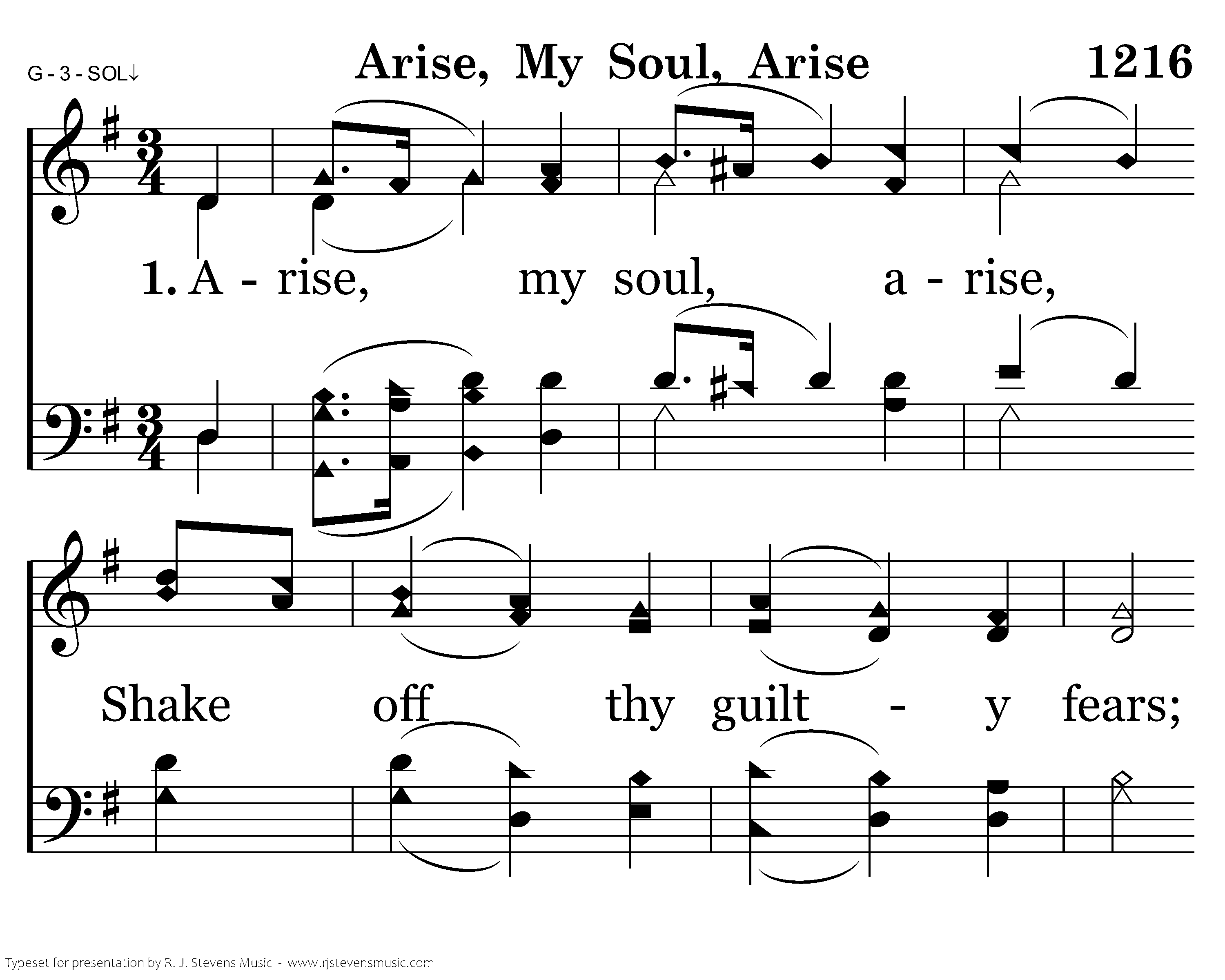 Arise, my soul, arise, Shake off thy guilty fears; The bleeding Sacrifice In thy behalf appears. Before the throne my Surety stands, My name is written on His hands, My name is written on His hands.